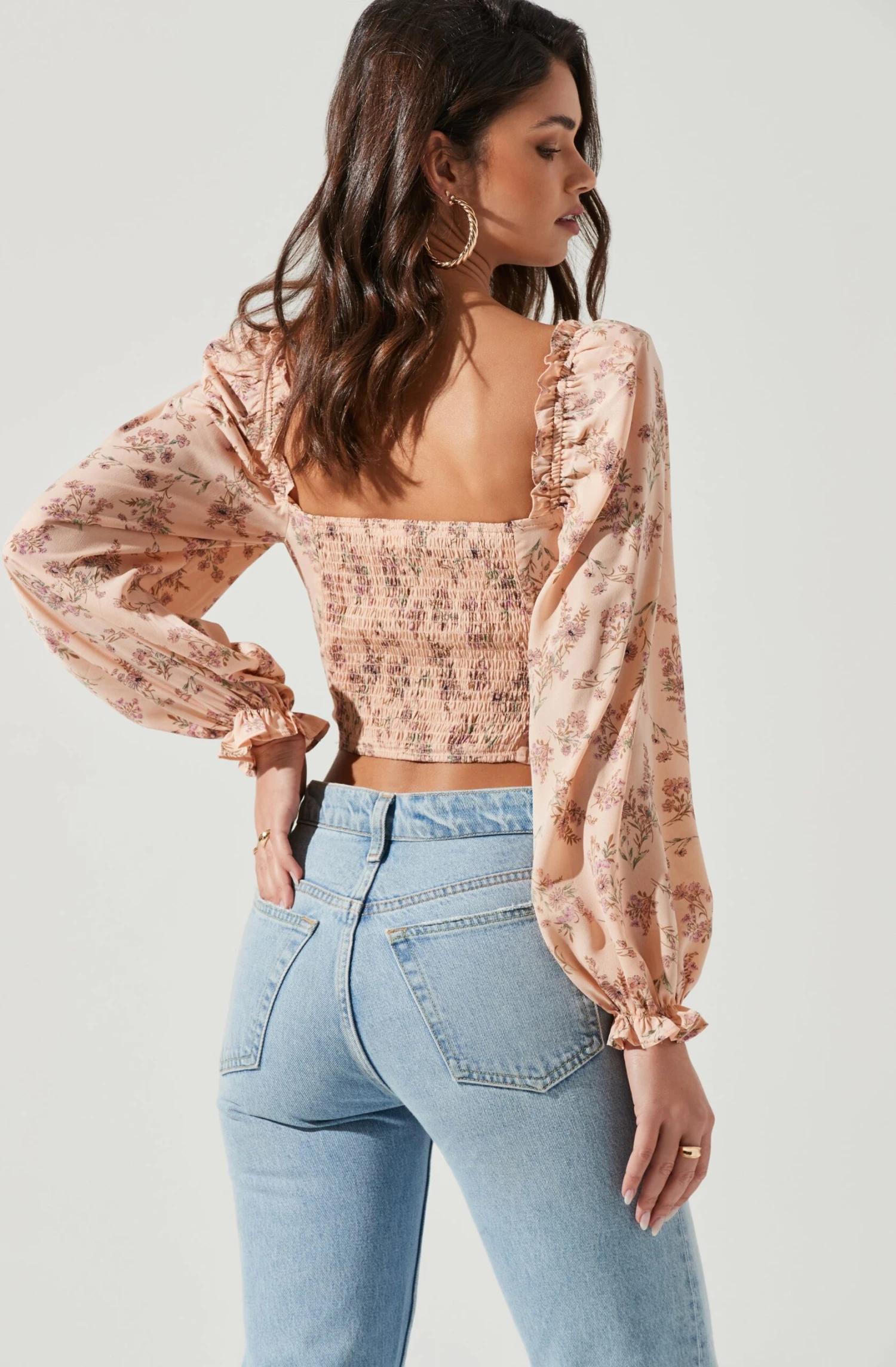 Fresh flowers decorate this chic top. It features a sweetheart neckline that leads to a darted bodice. Long sleeves with elasticized cuffs. Smocked back.