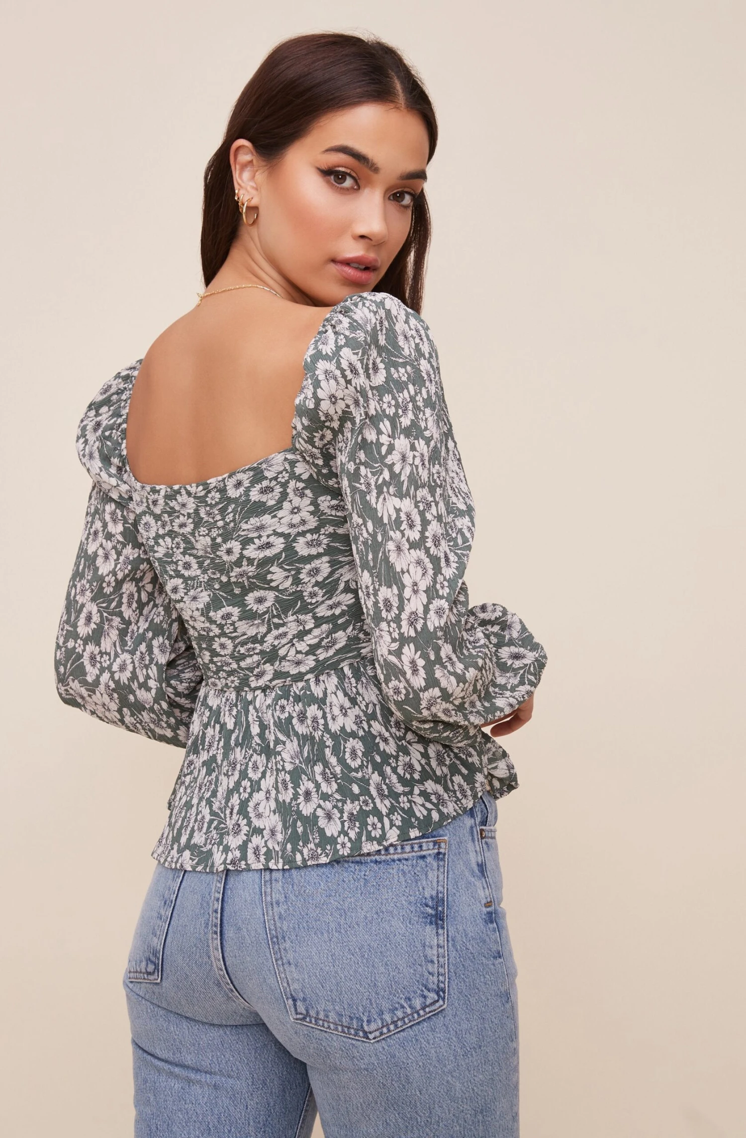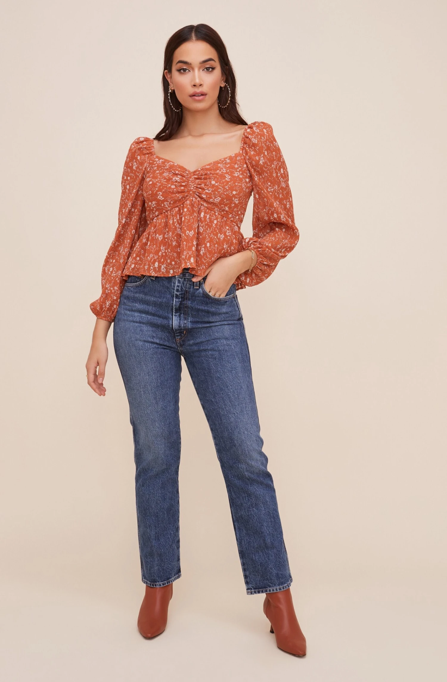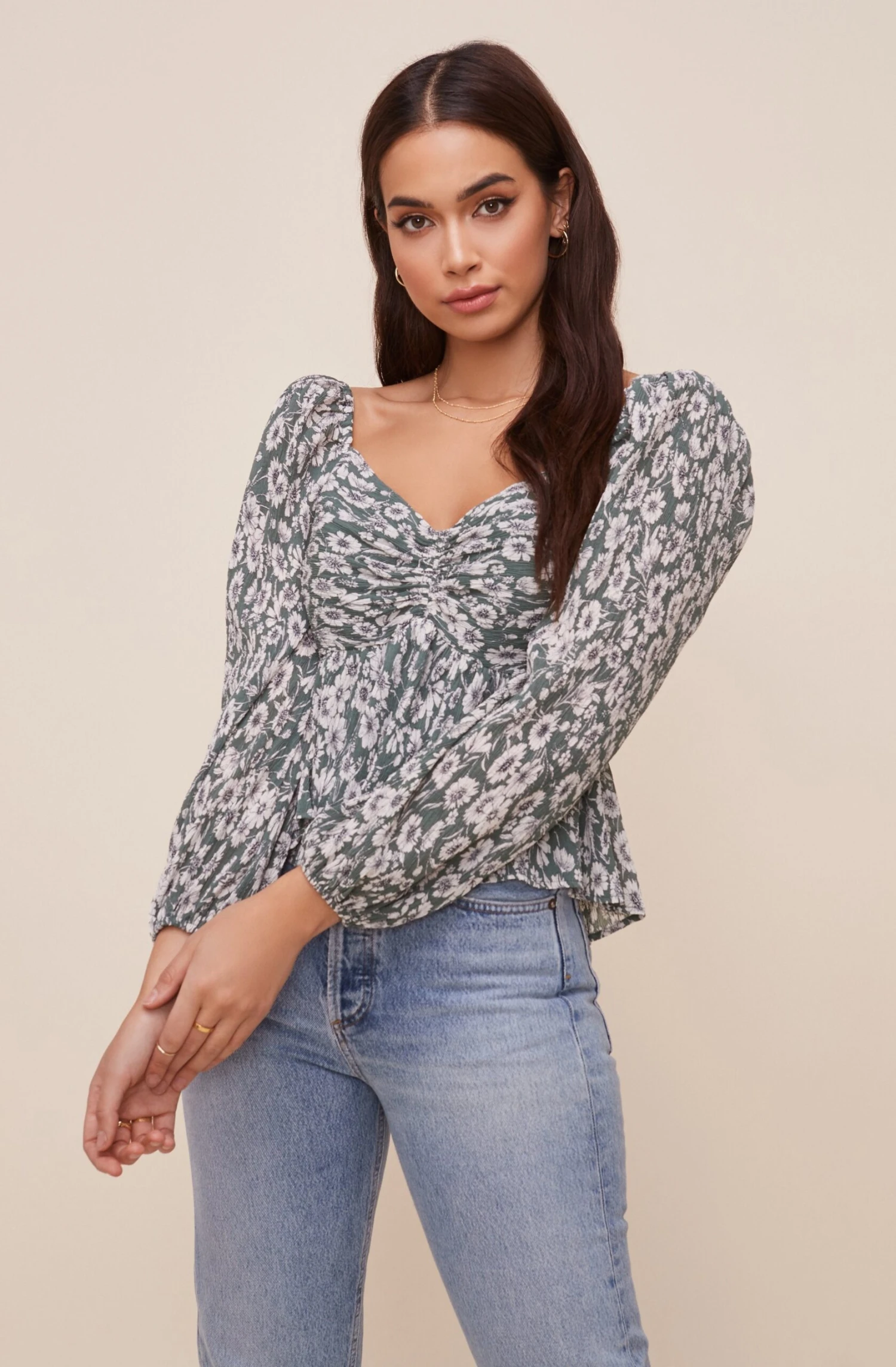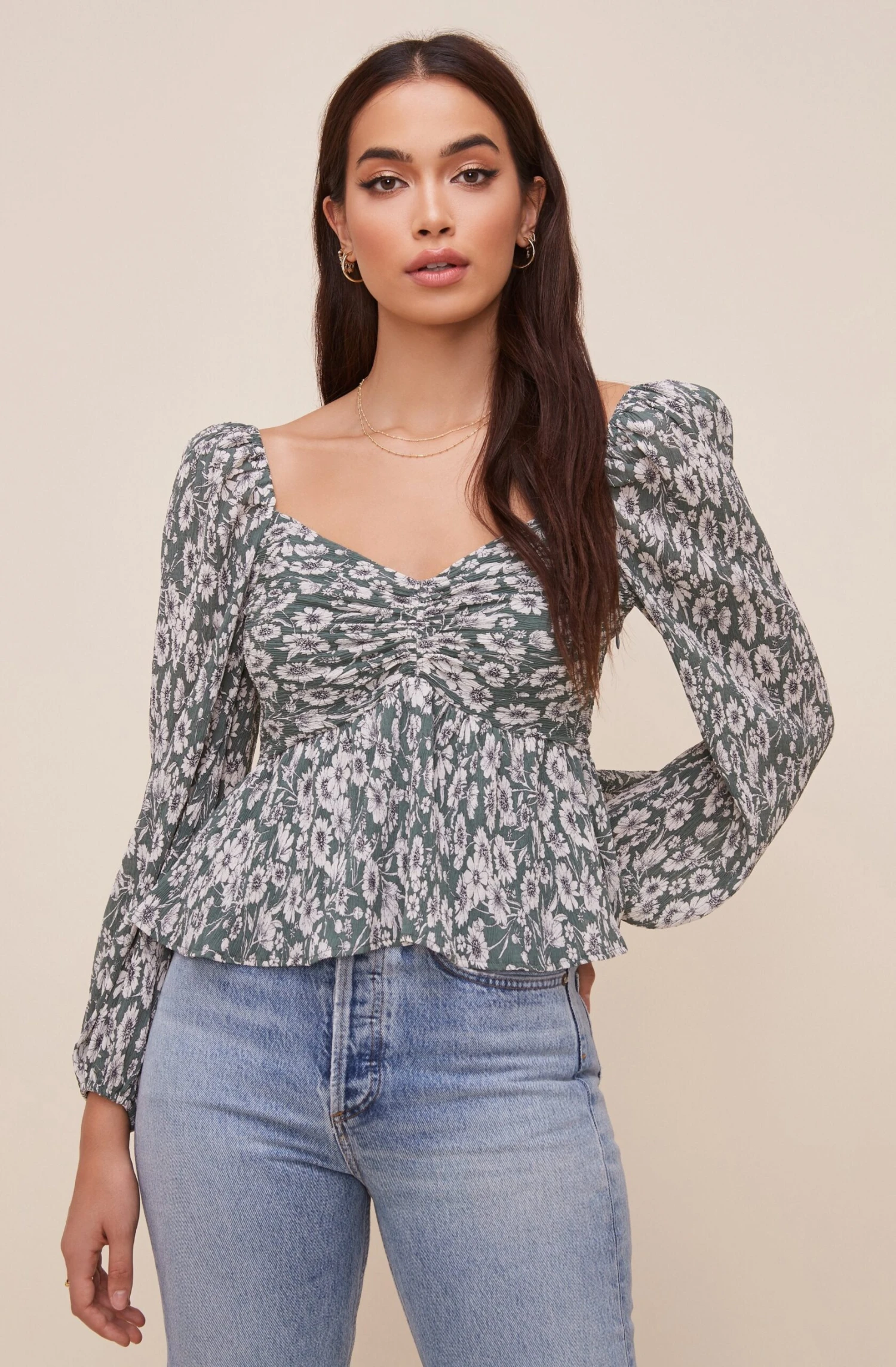 With a signature sweetheart neckline, this top gives your outfit the right amount of sweet. Ruched bust and slightly flared hem. Long sleeves with statement shoulders.