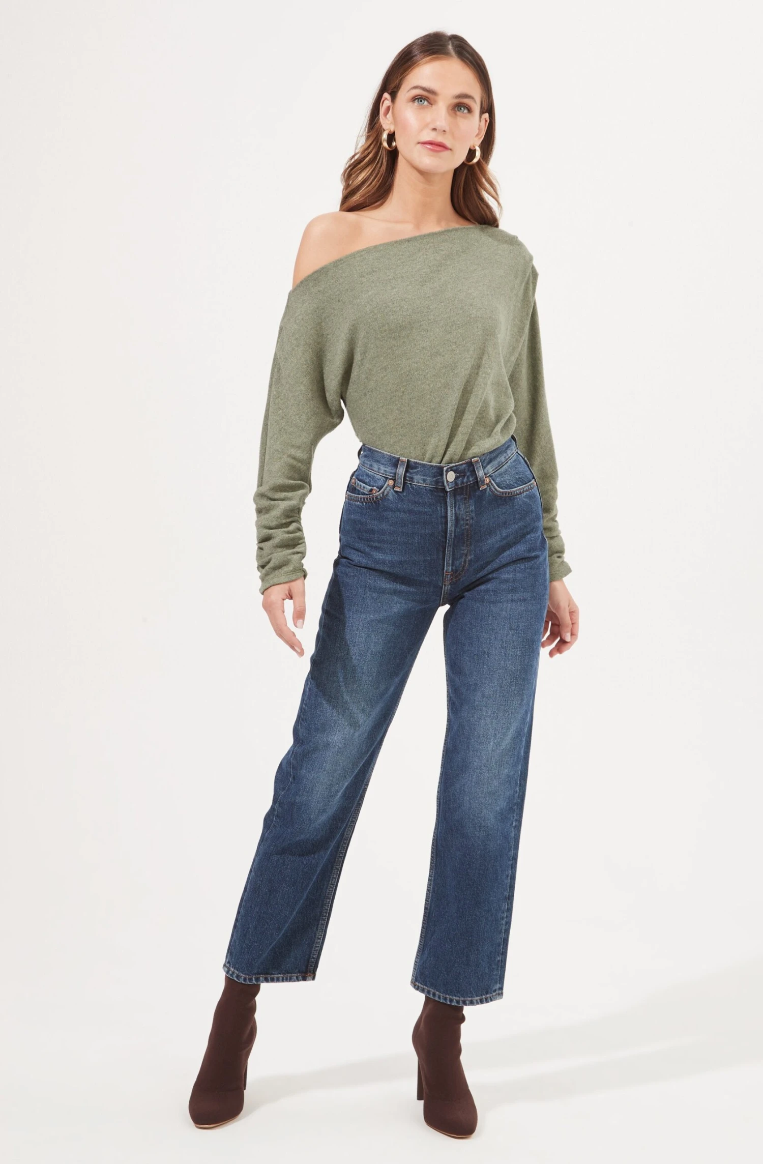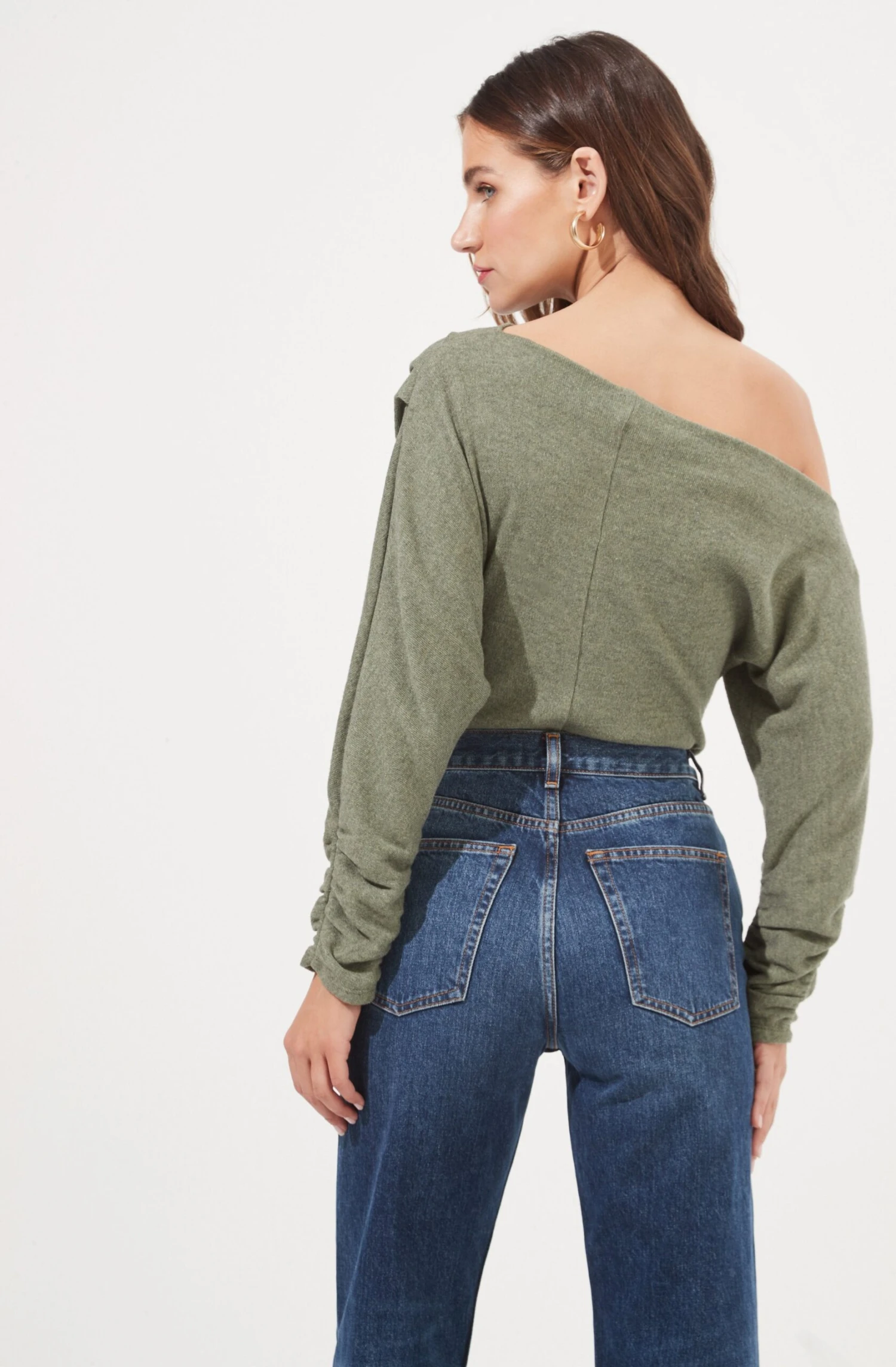 The Lorella Bodysuit features a ribbed knit construction with an off-shoulder neckline, dolman sleeves and attached thong bottoms. Snap button closures.
