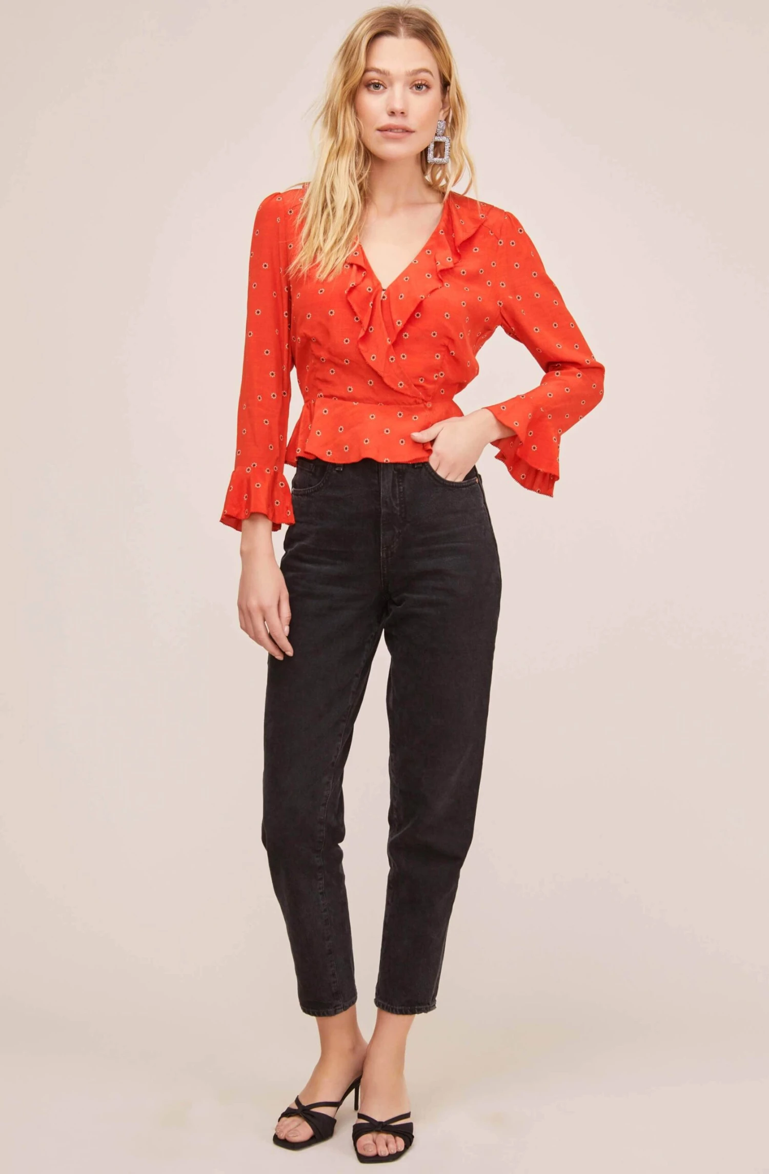 Have some fun with ruffles and polka dots! This chic blouse features a V neckline complete with a ruffle trim. Wrapped front descends to a defined waist and ruffle hemline. Long cuffed sleeves.