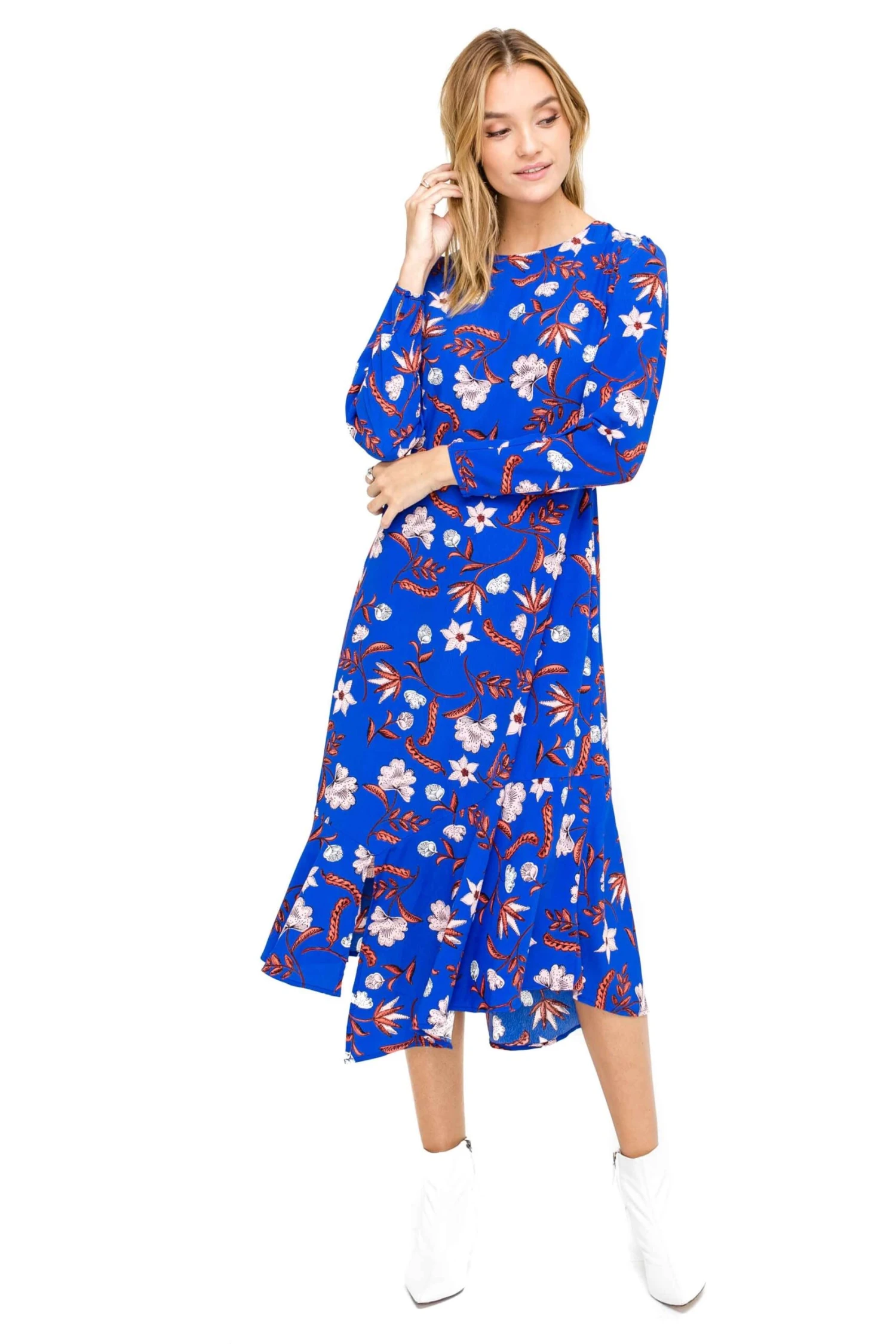 100% Polyester, Length: 51 1/2″ (Size M), Zipper Closure, Dry Clean Only, Floral Midi Dress, Ruffled Hem, Asymmetrical, Model is Wearing Size S, Model’s Measurements: Height 5’8″ // Bust 32″ // Waist 24″ // Hips 34″, Fits True to Size, Style#ACDR100191