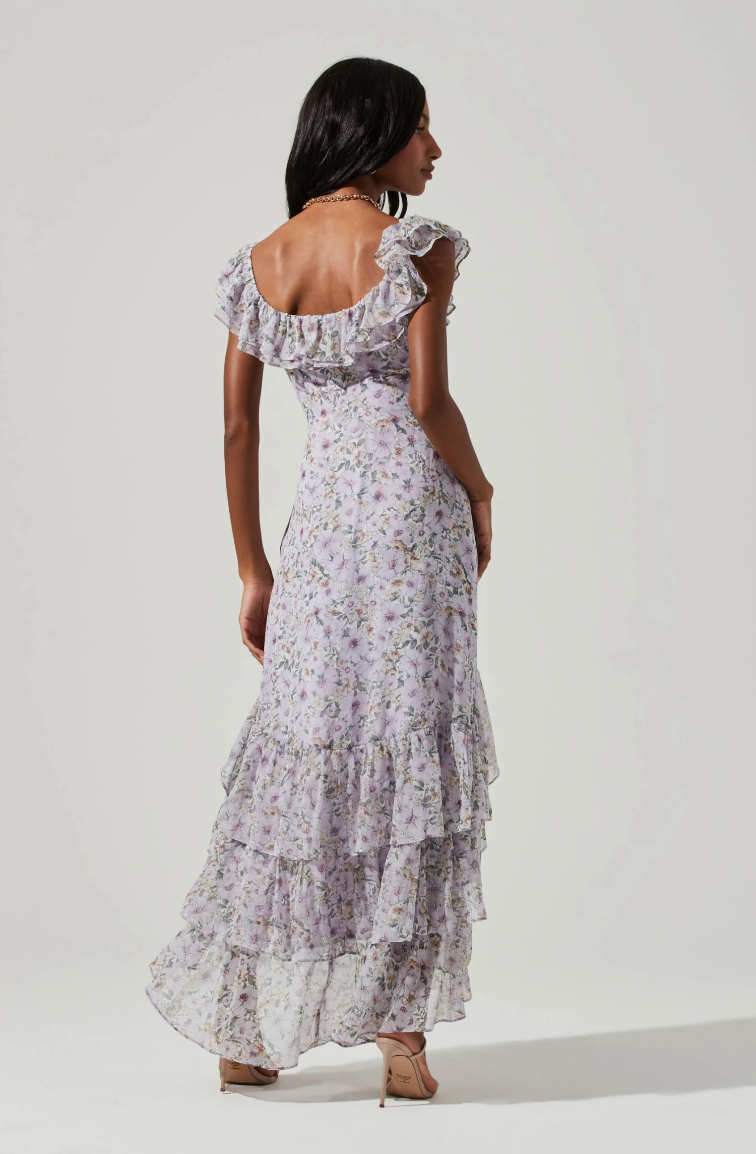 The Magnolia Dress features a floral print throughout. Scoop neckline features a ruffle trim and flutter sleeves. Gathered bust leads to a hi-lo maxi hemline with ruffle trim. Full lined.