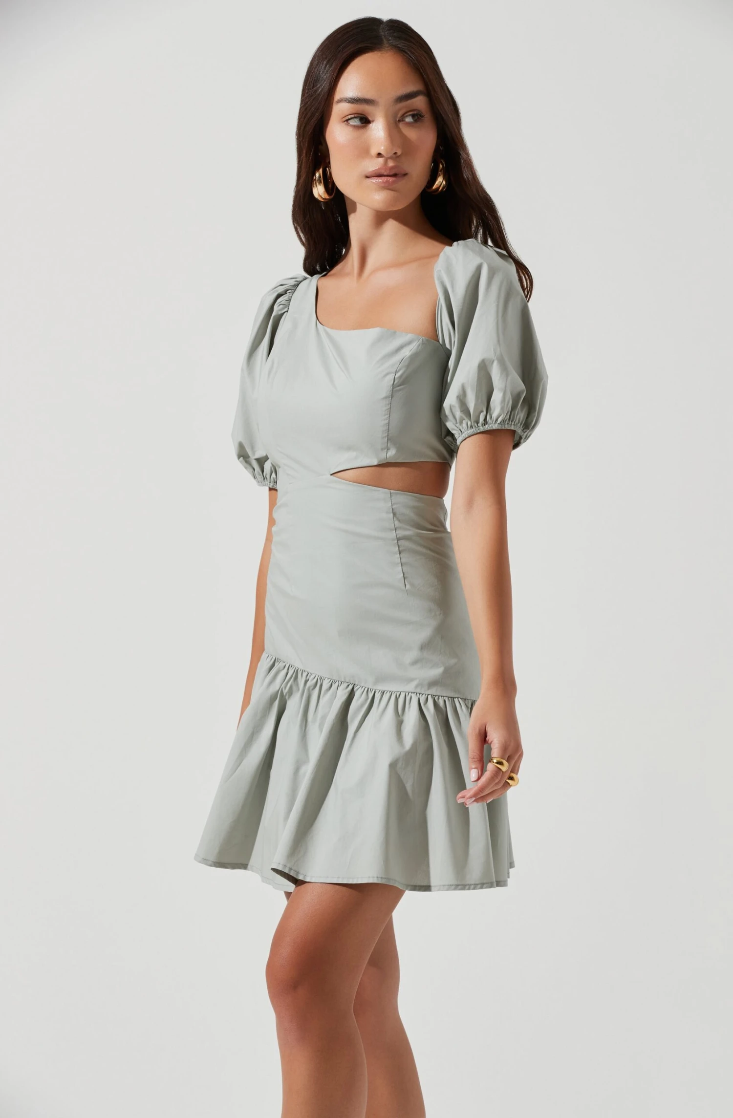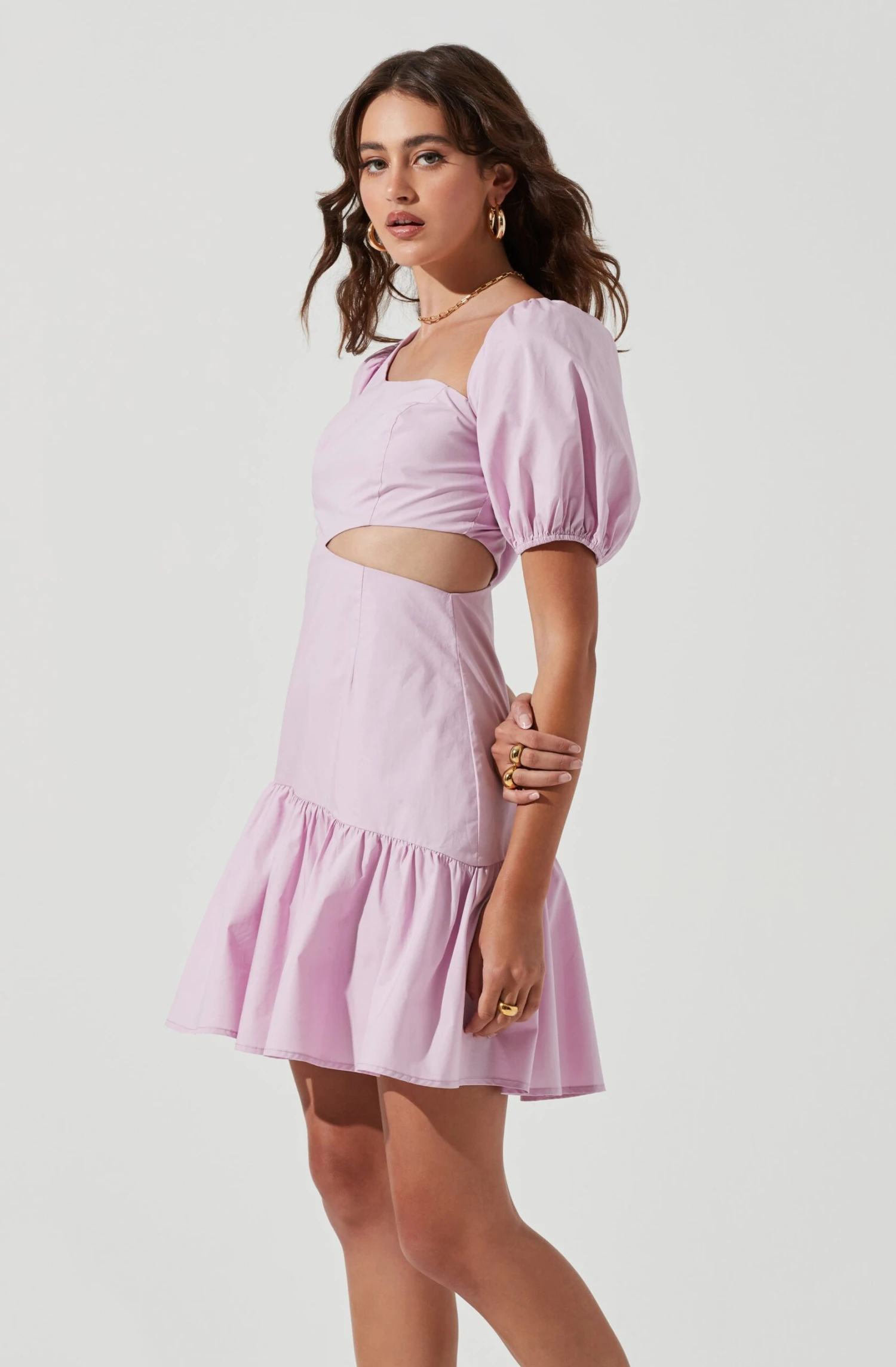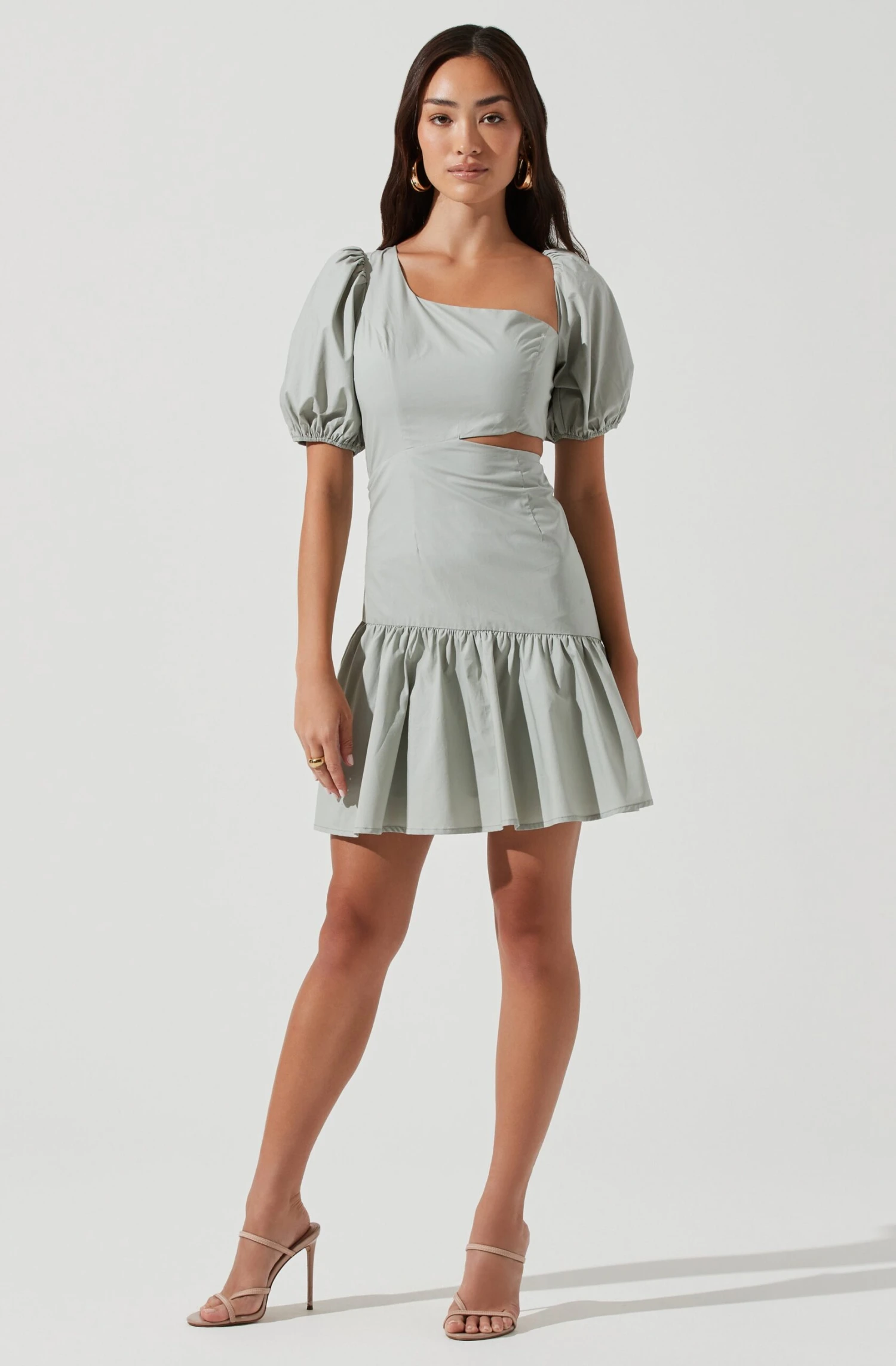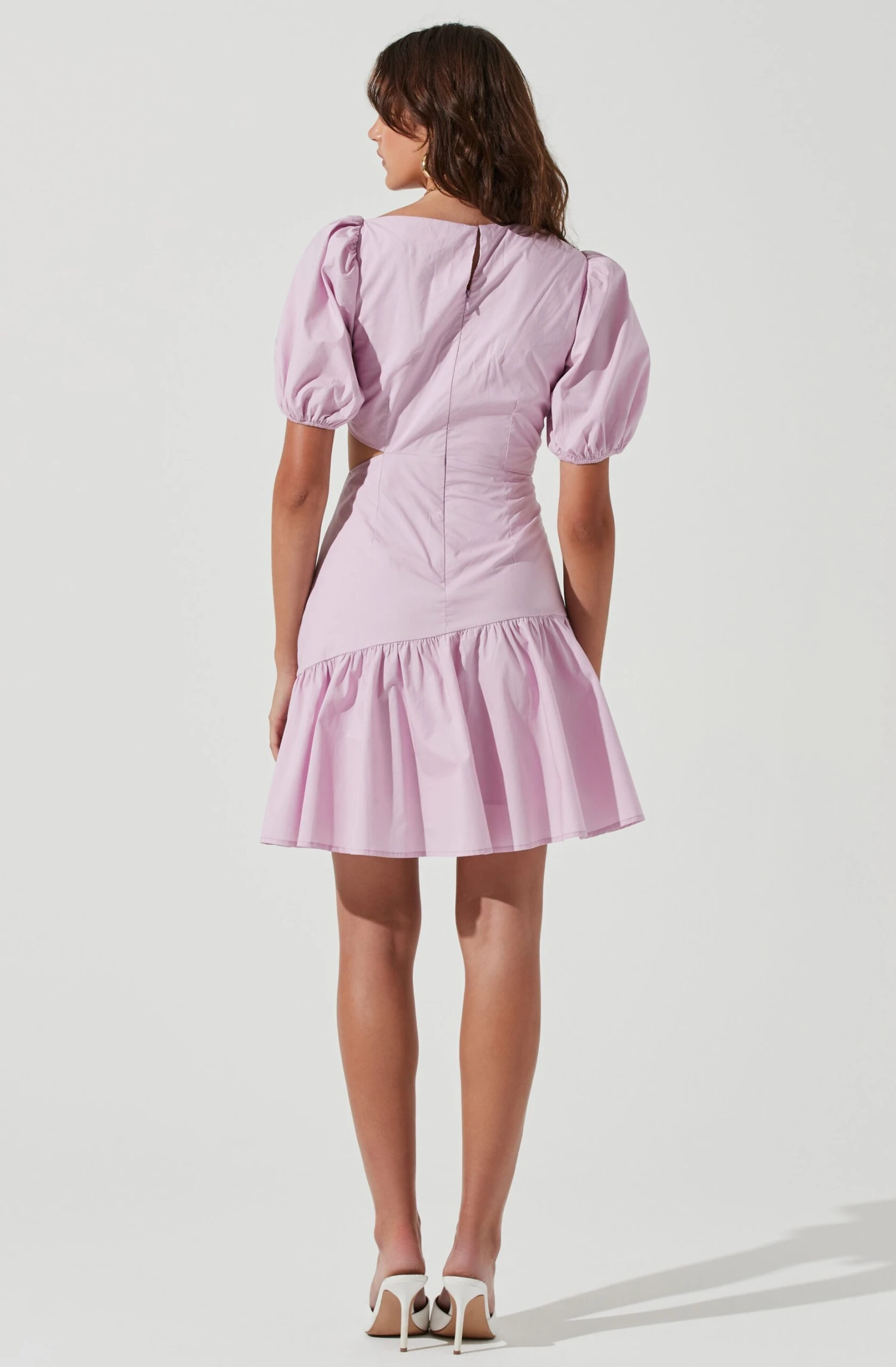 The Mayfair Dress features an asymmetrical neckline that descends to a fitted bodice with a side cutout accent. Mini skirt with a standout ruffle trim. Concealed back zip closure.