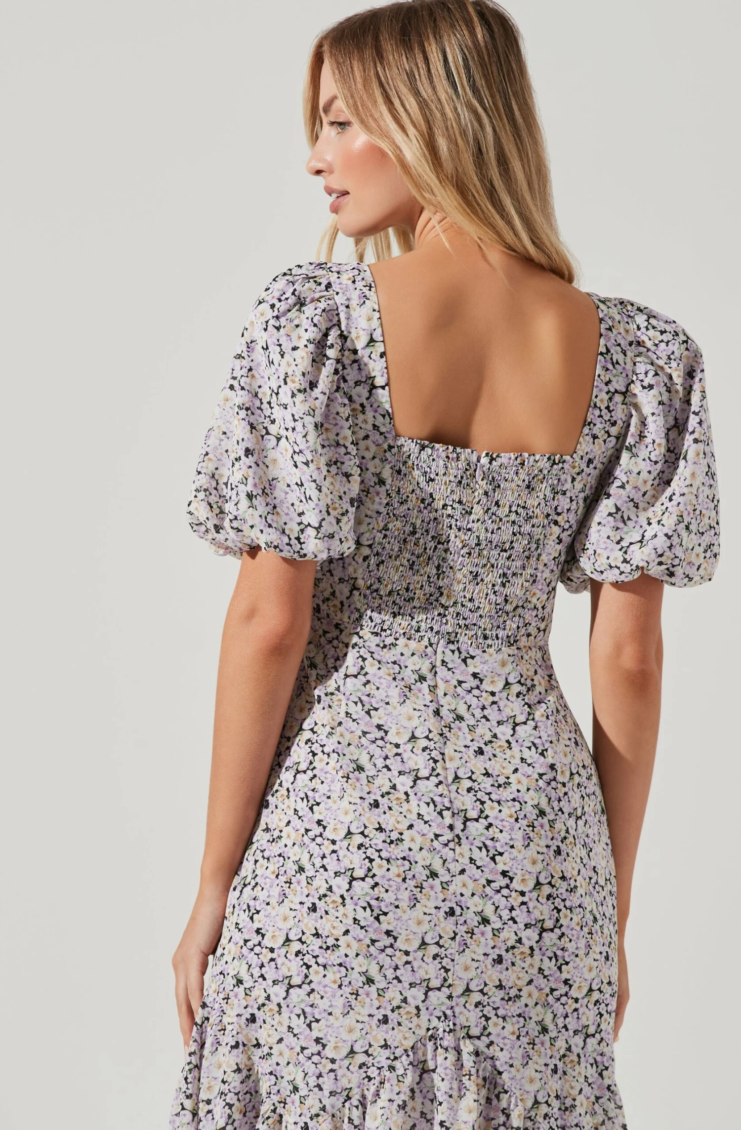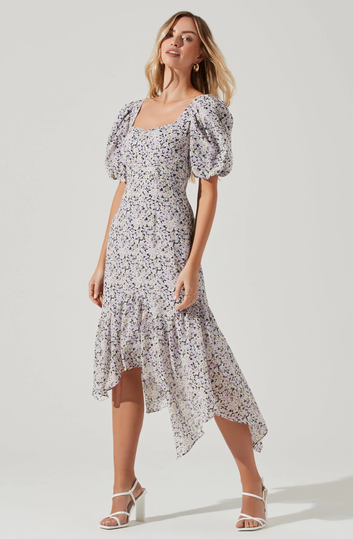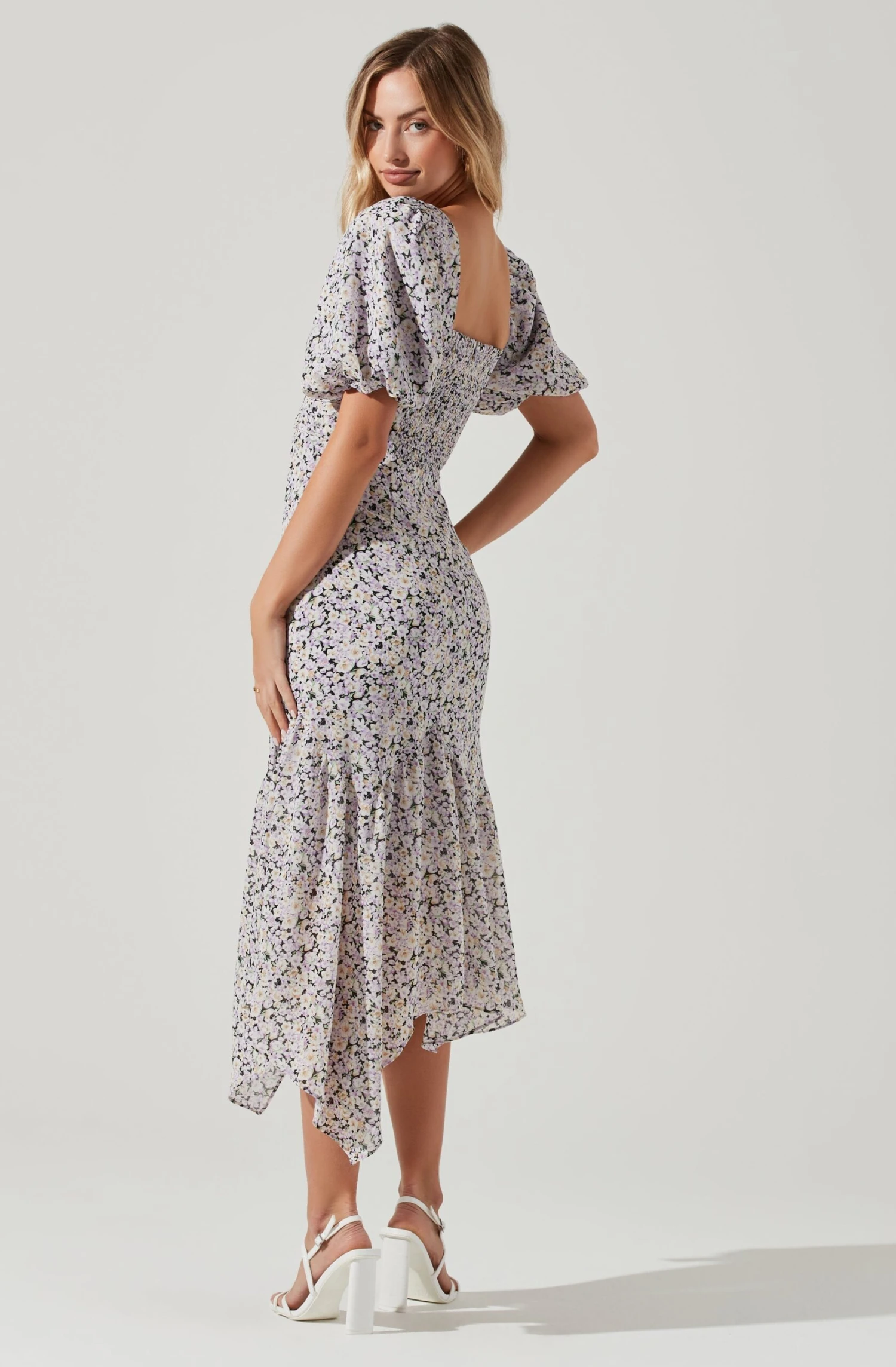 The Micaela Dress features a floral print design that starts with a square neckline, defined waist and asymmetrical handkerchief hem. Short puff sleeves. Smocked back.