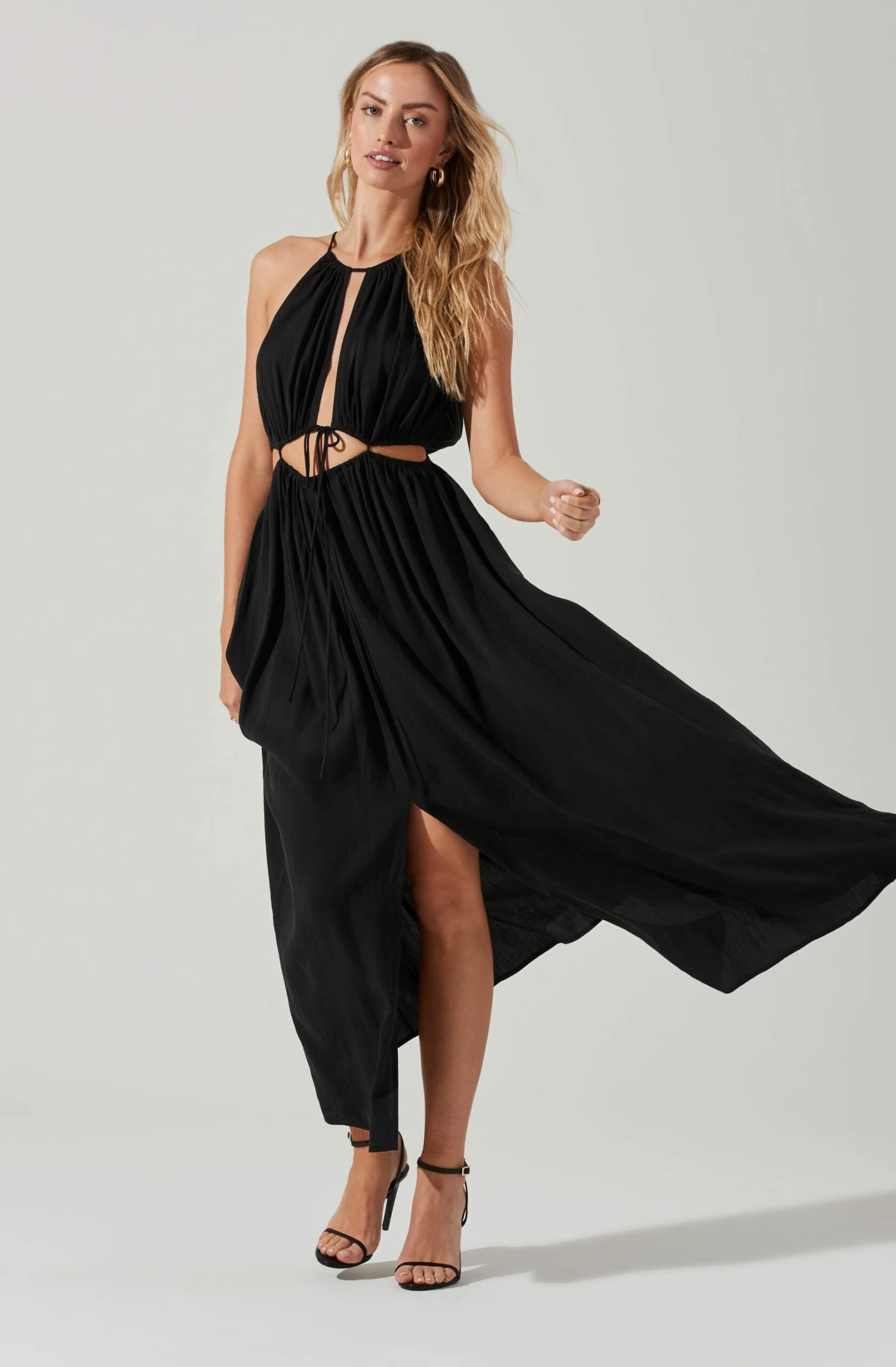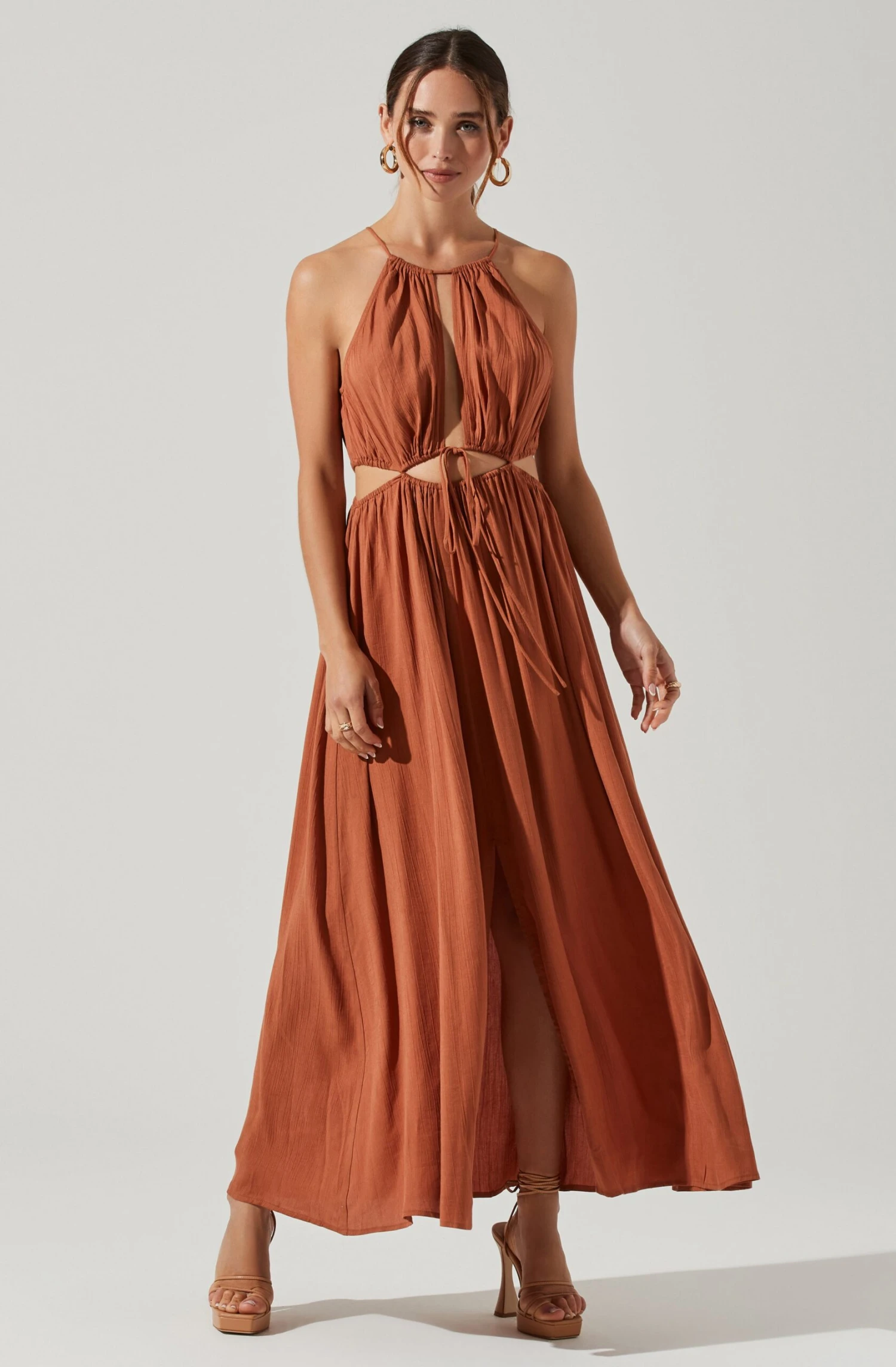 This statement dress features a front bust cutout design that leads to a midriff cutout design with drawstring accents. Maxi-length skirt with a front slit accent. Keyhole back.