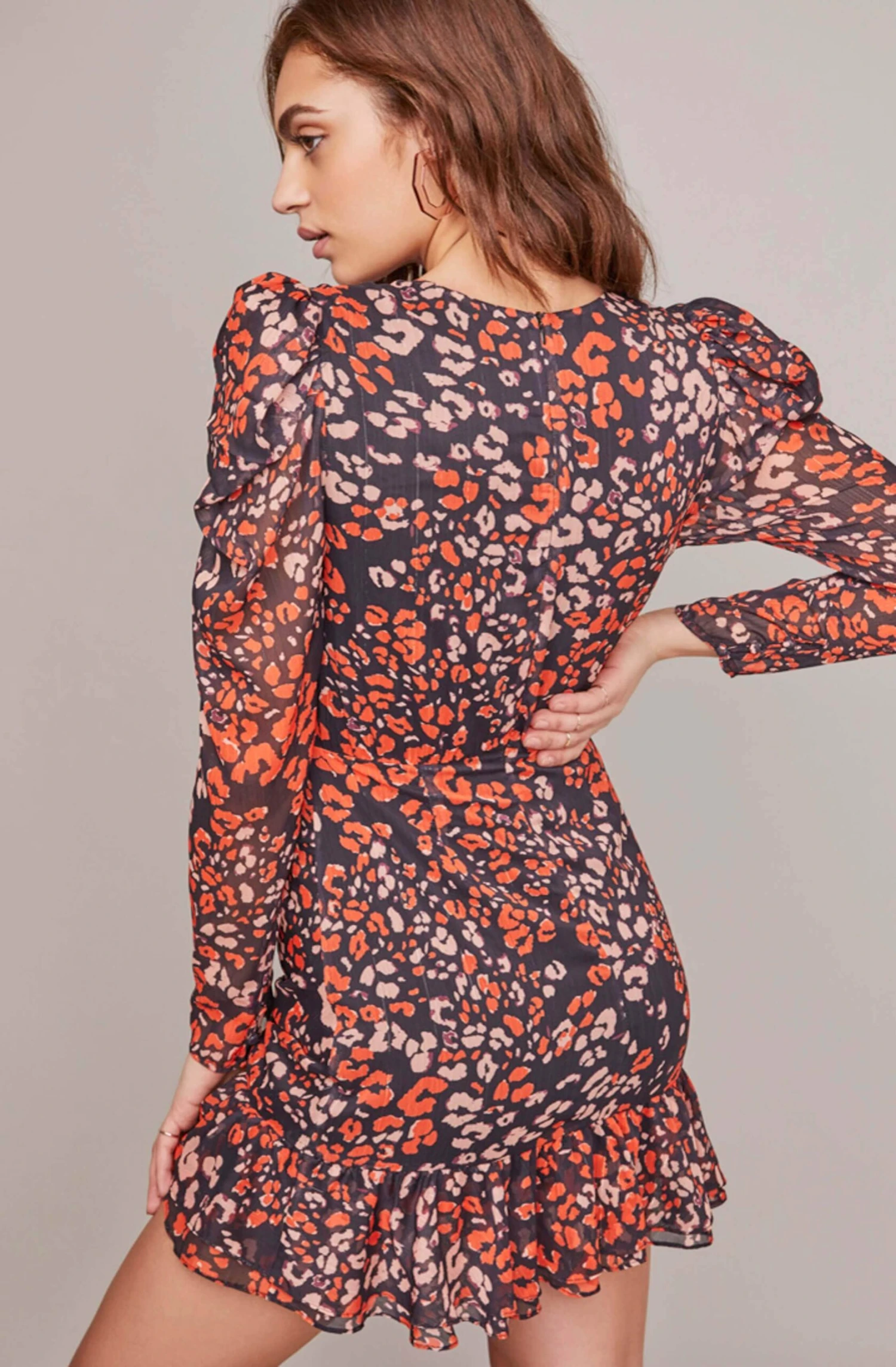Fierce for fall! This autumn-hued mini dress features a V neckline that descends to a defined waist and ruffle mini skirt. Statement leopard print throughout. Long puff sleeves.