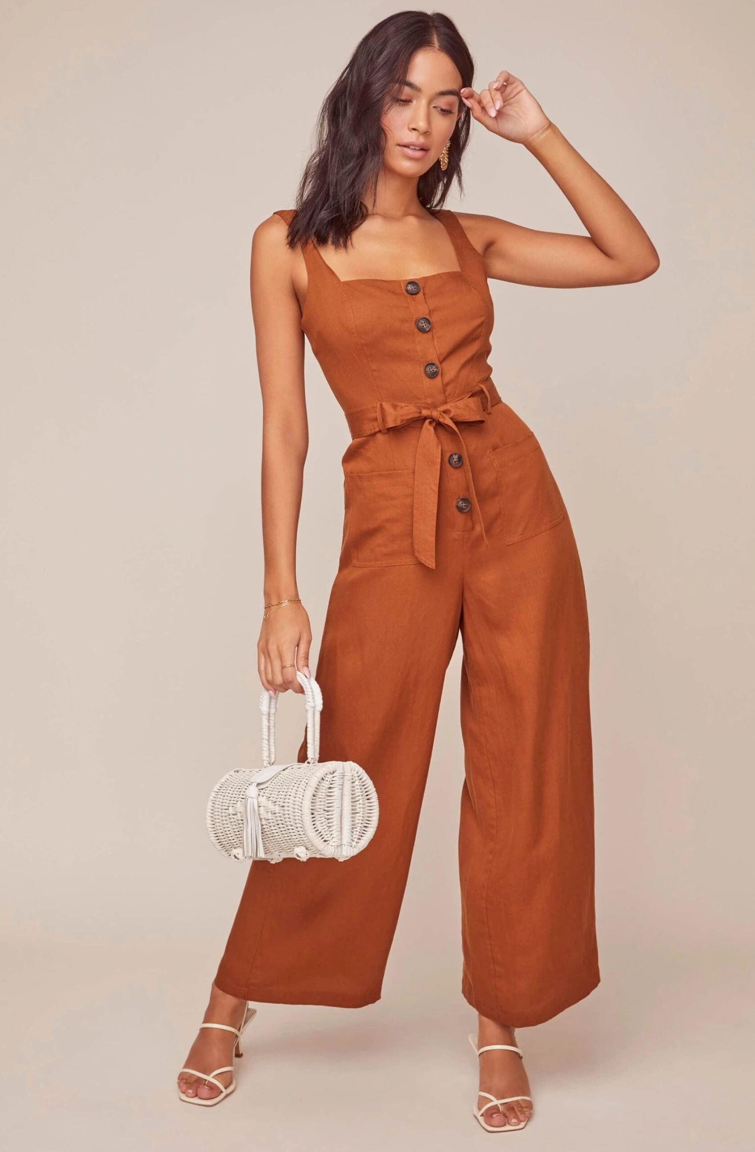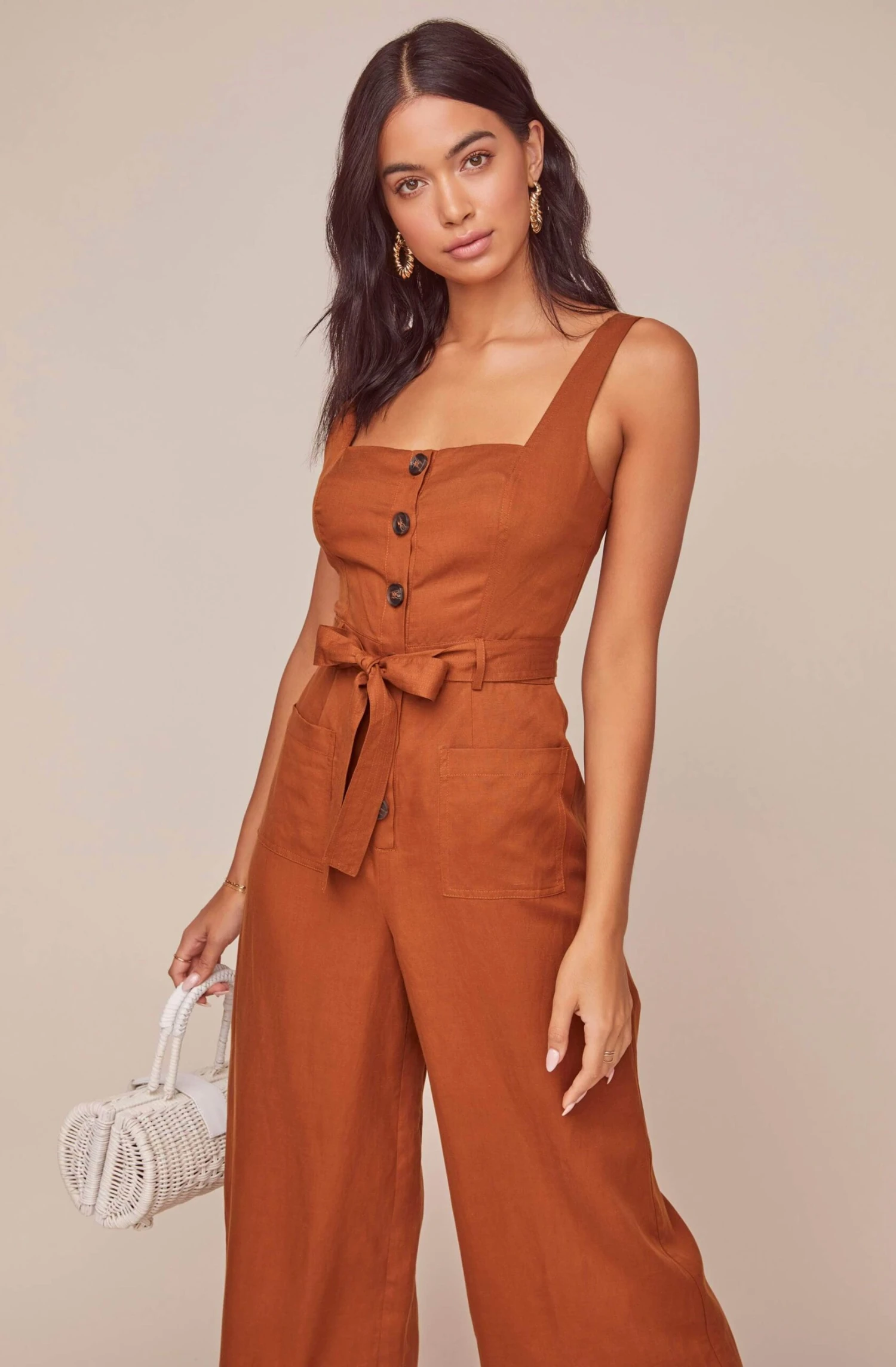 This is no mirage! The stylish jumpsuit features a square neckline, front button placket and wide leg bottoms. Tie front waist accentuates your figure and makes it easy to dress up or down all season long! Smocked back.