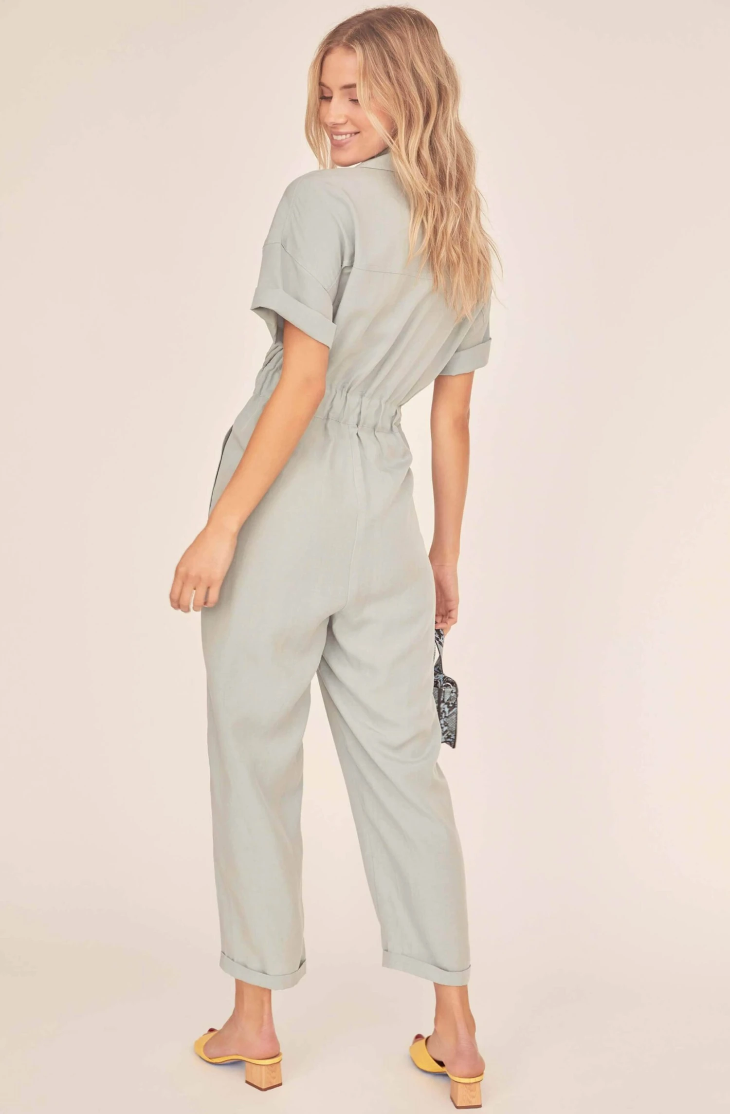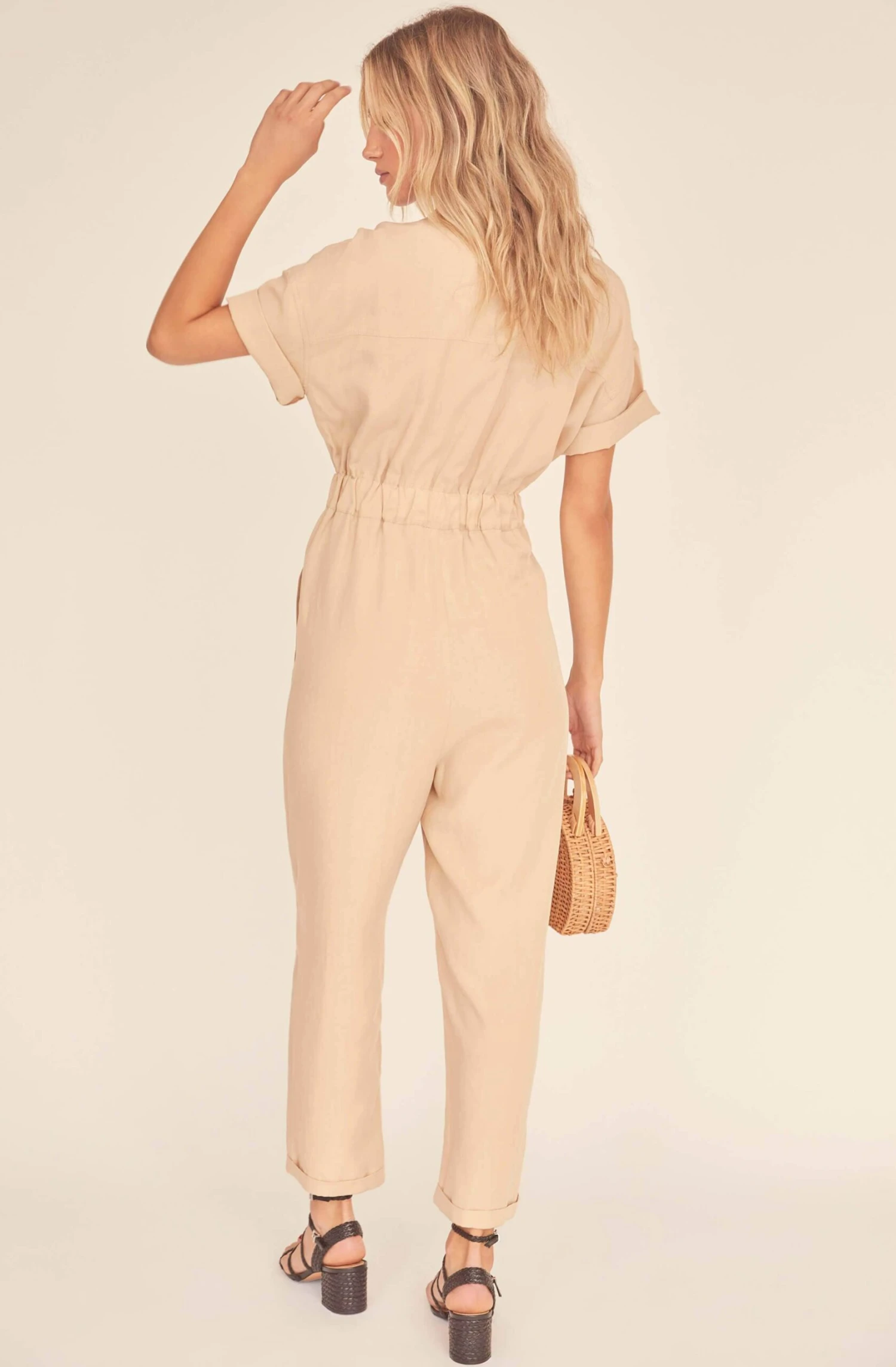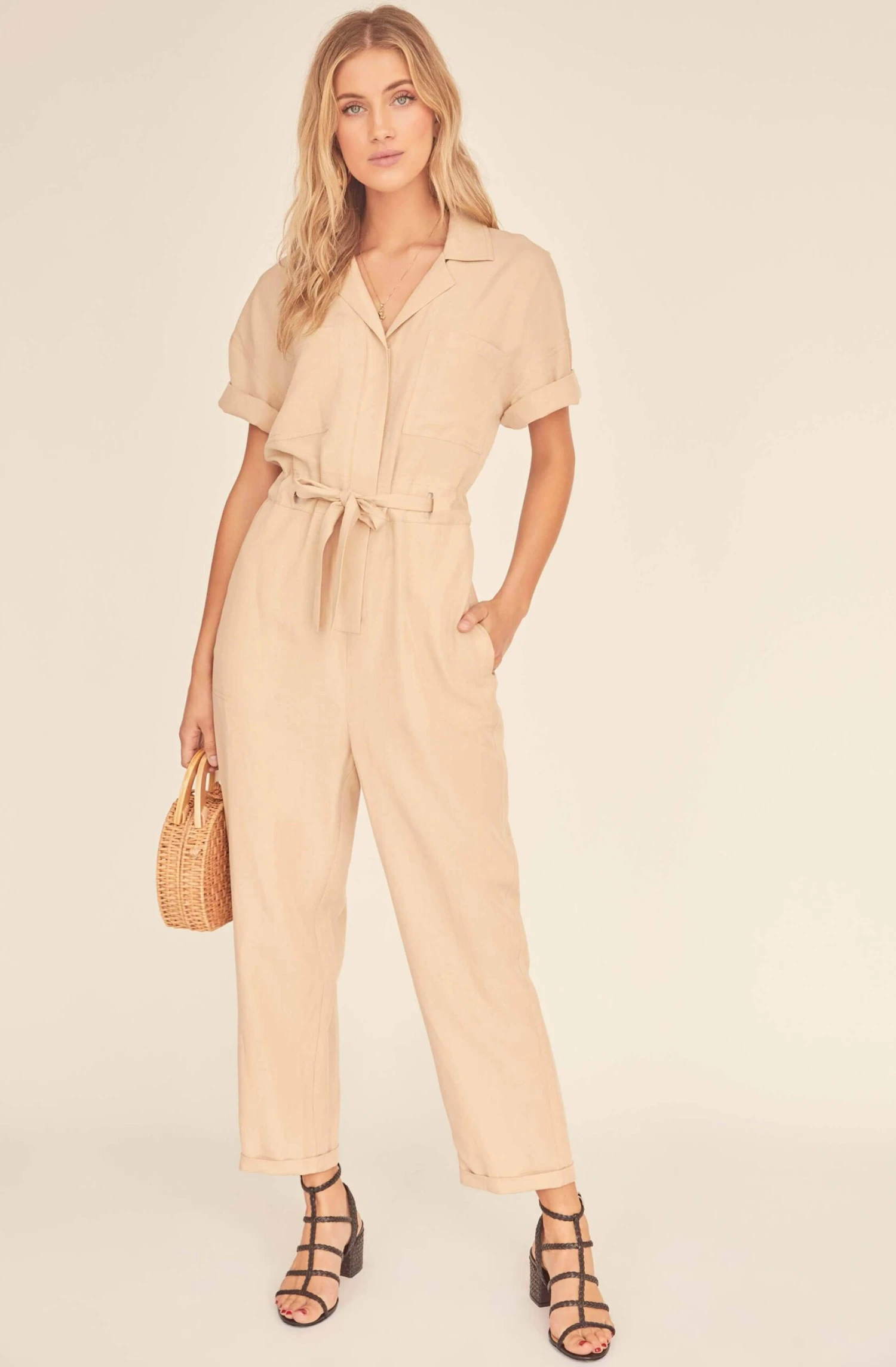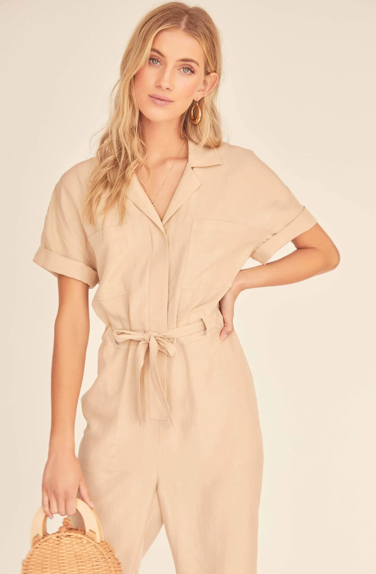 It’s true! You can wear the Miri Jumpsuit just about anywhere! Paired with heels, sneakers or flats, this one piece works with your wardrobe. Pointed collar leads to a front button placket and tie waist. Slanted pockets at the hip along with cuffed sleeves and leg openings.