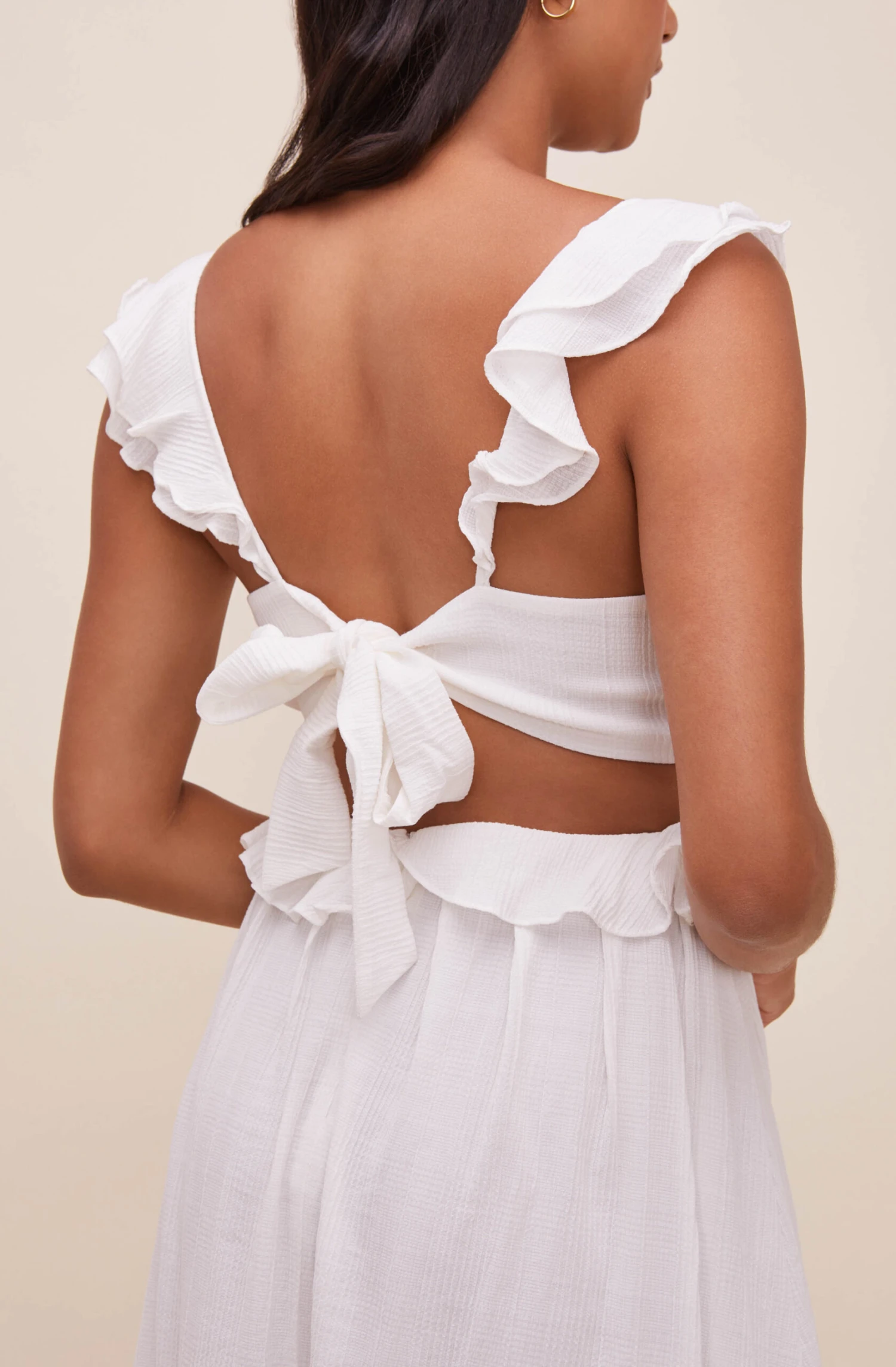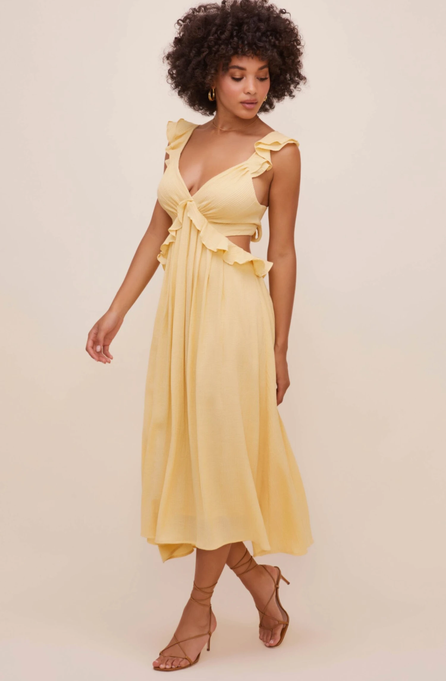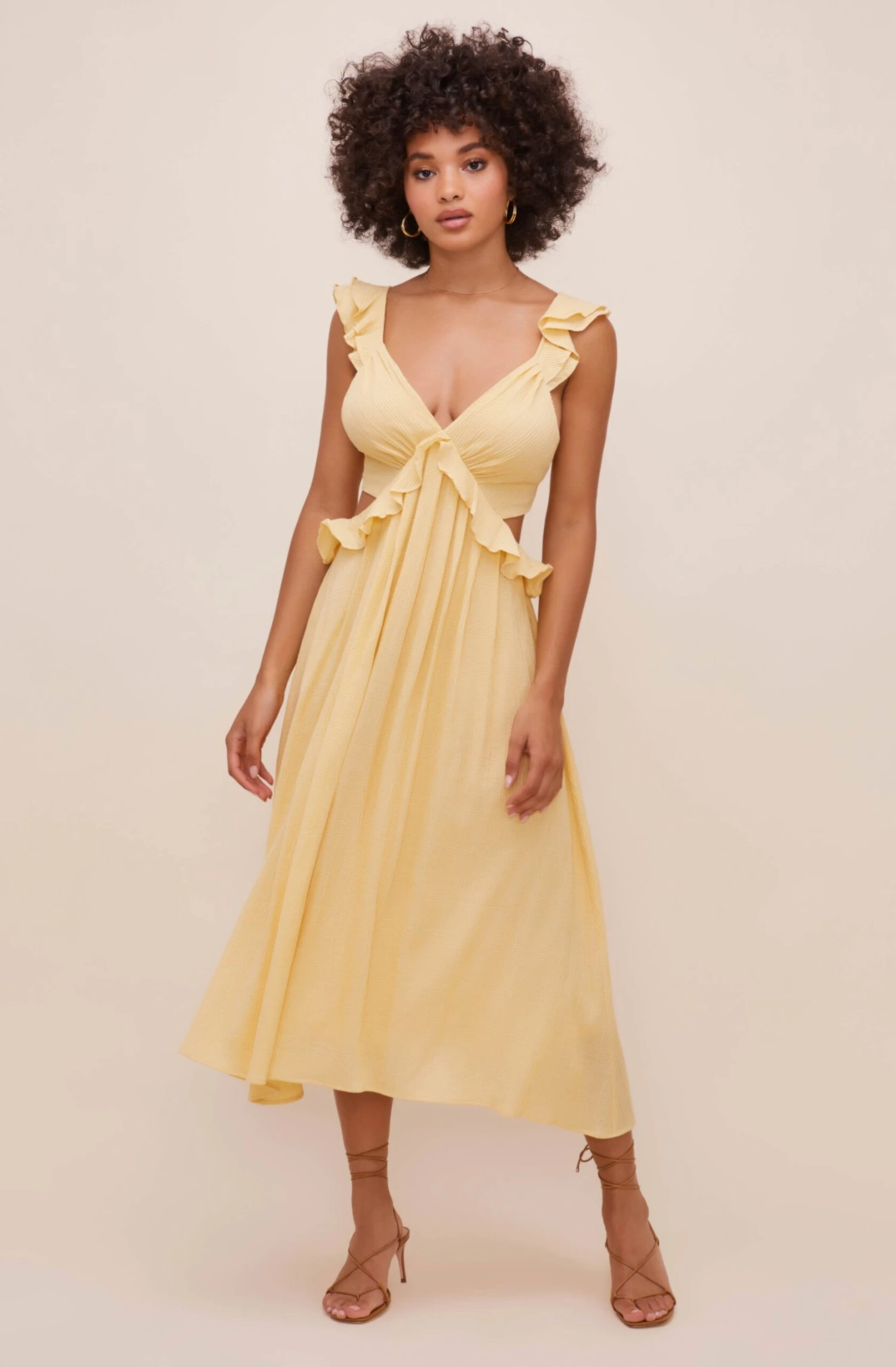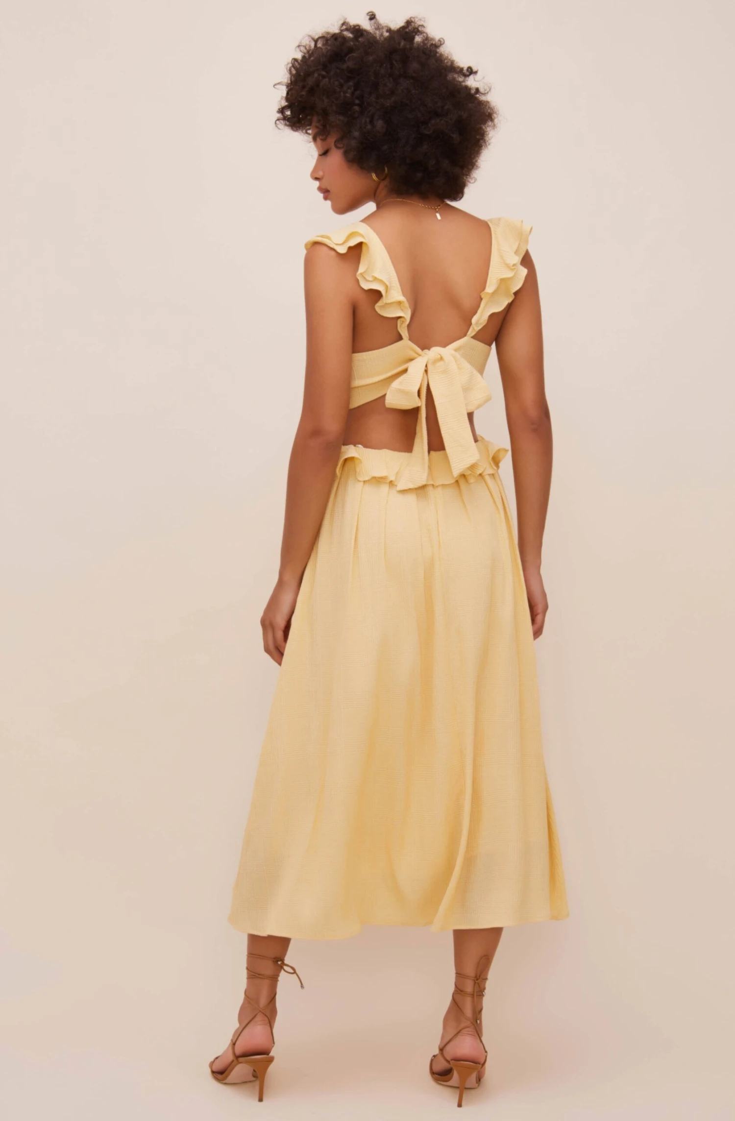 Perfect for sunny days! The Nima Dress features a V neckline that leads to a ruffle trimmed waist. Cutout sides and back make a statement. Flowy midi skirt with pleat details on the front. Ruffle straps with bow tie accent.