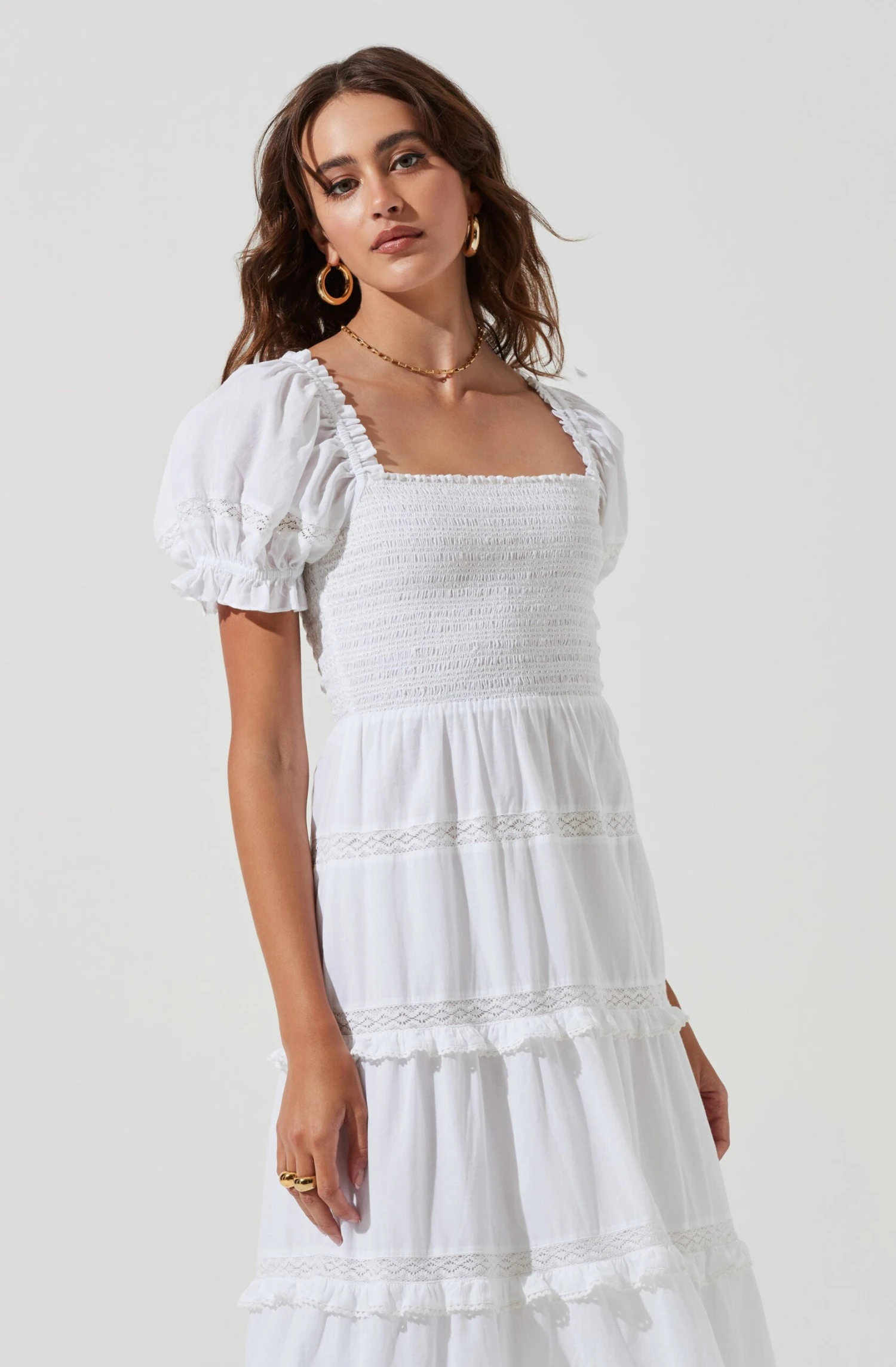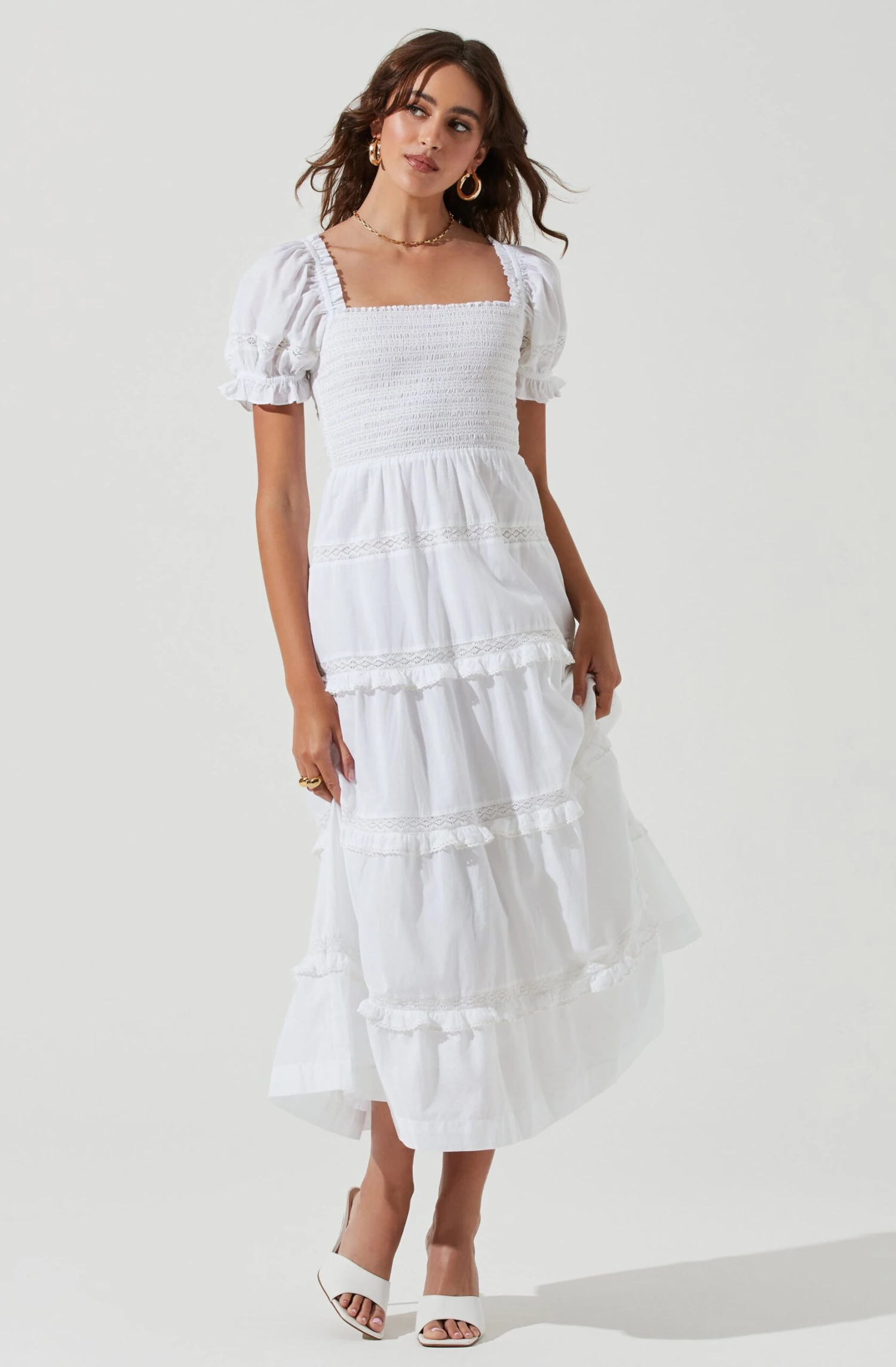 The Orla Dress is your perfect weekend outfit. It features a square neckline that leads to a smocked bodice and ruffle, tiered midi skirt. Short puff sleeves. Fully lined.