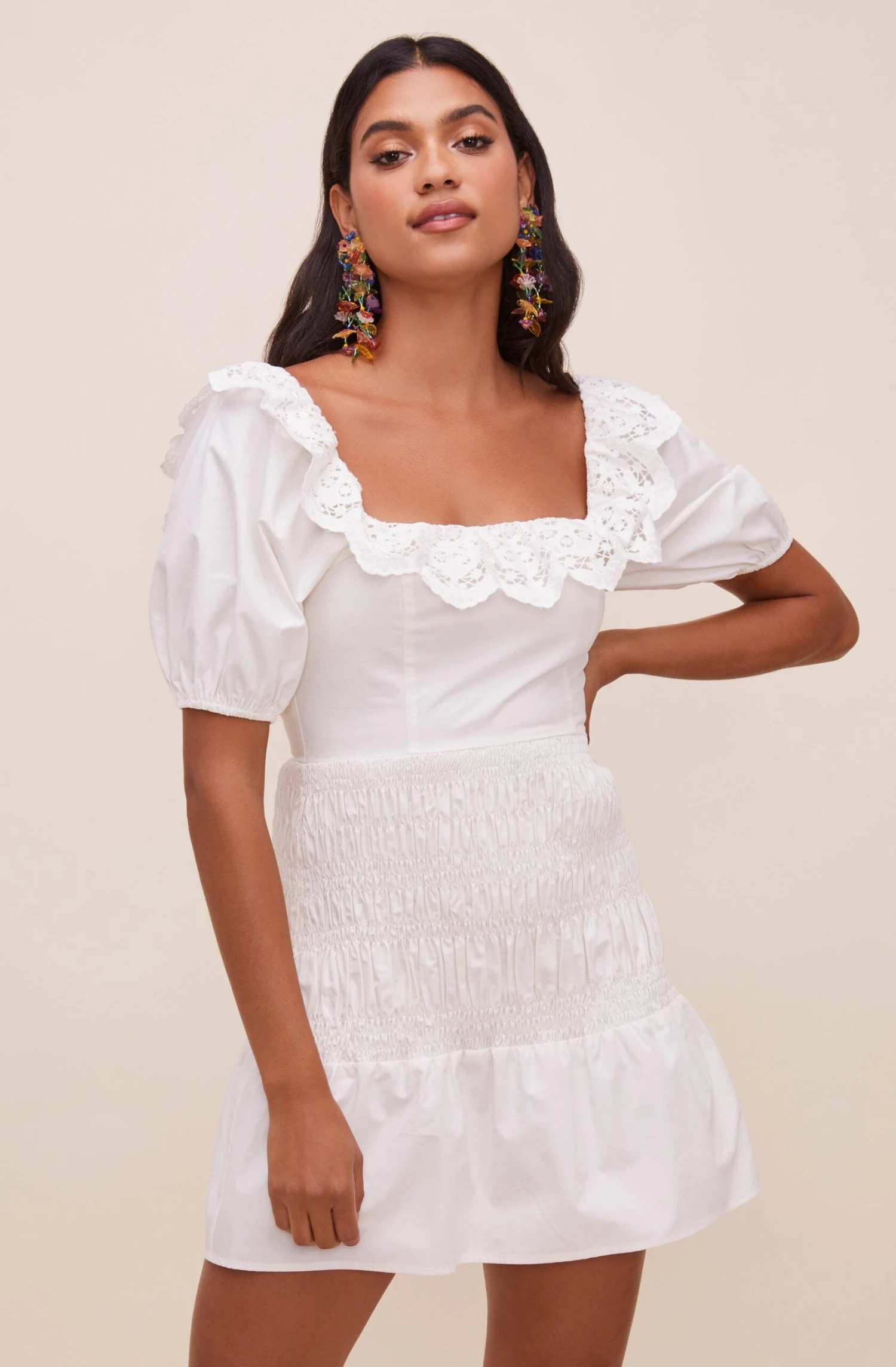 The perfect mini dress exists. The Patina features a square neckline with a scalloped eyelet ruffle trim and puff sleeves. Darted bodice descends to a smocked mini skirt. Smocked back for an ideal fit.