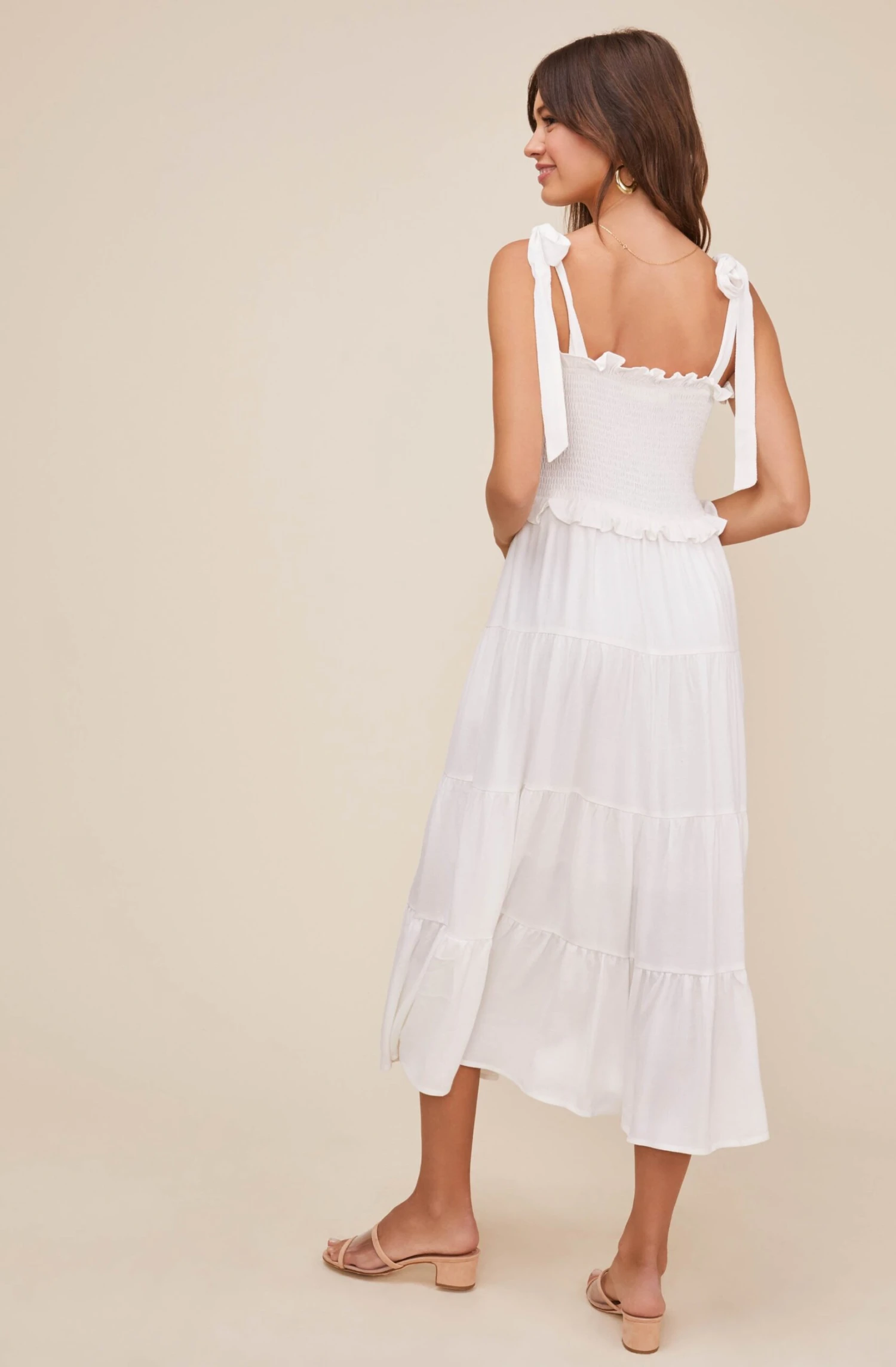 Take a walk in the park in this dreamy Promenade Dress! Statement self-tie straps descend to a square neckline with ruffle trim. Smocked bodice and ruffle detail at the waist leads to a tiered midi skirt.