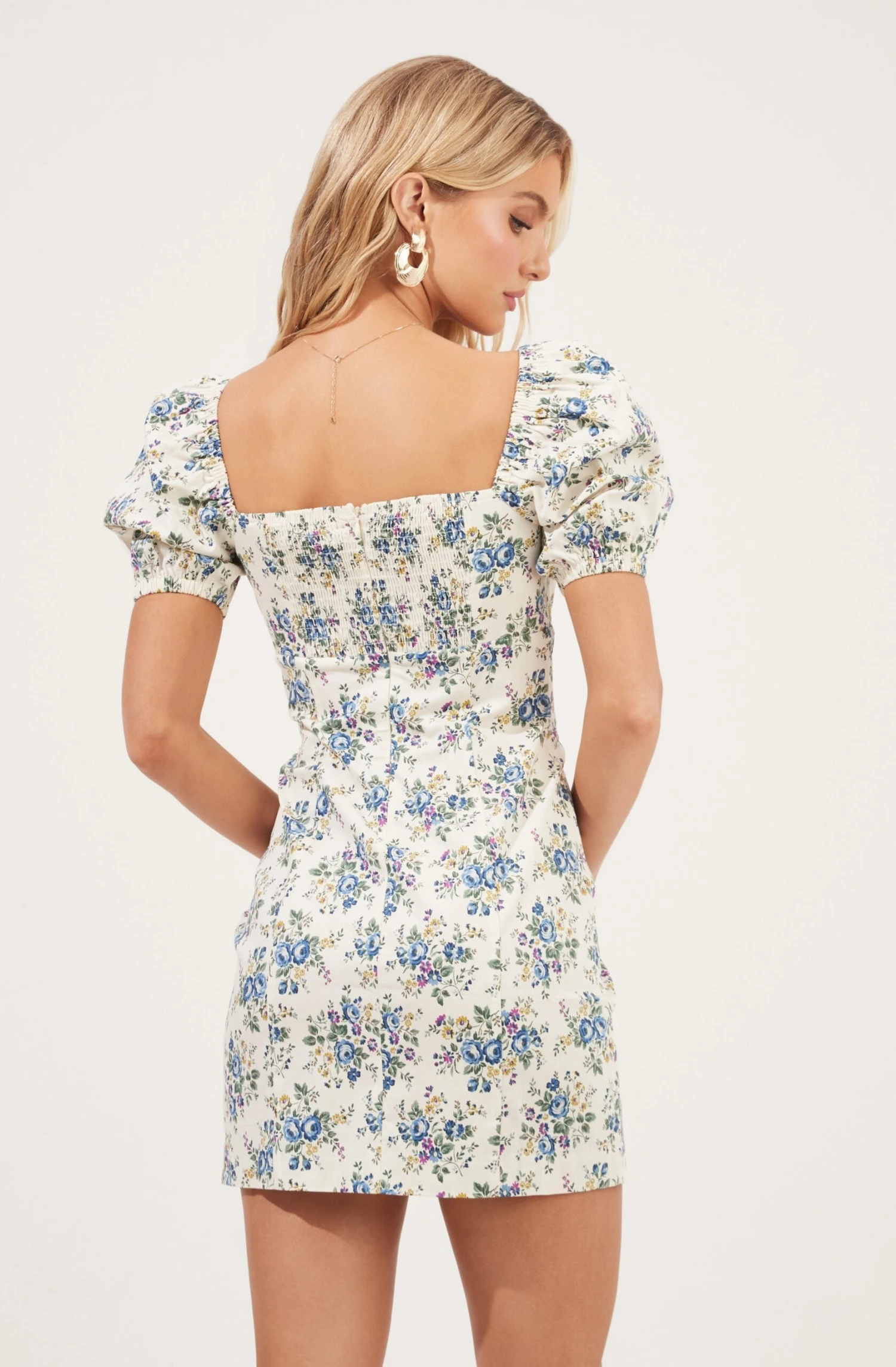 Inspired by love and sunnier days! This mini dress features a sweetheart neckline with a ruched bust. Fitted silhouette leads to an abbreviated hem with a front slit accent. Puff half sleeves. Smocked back.