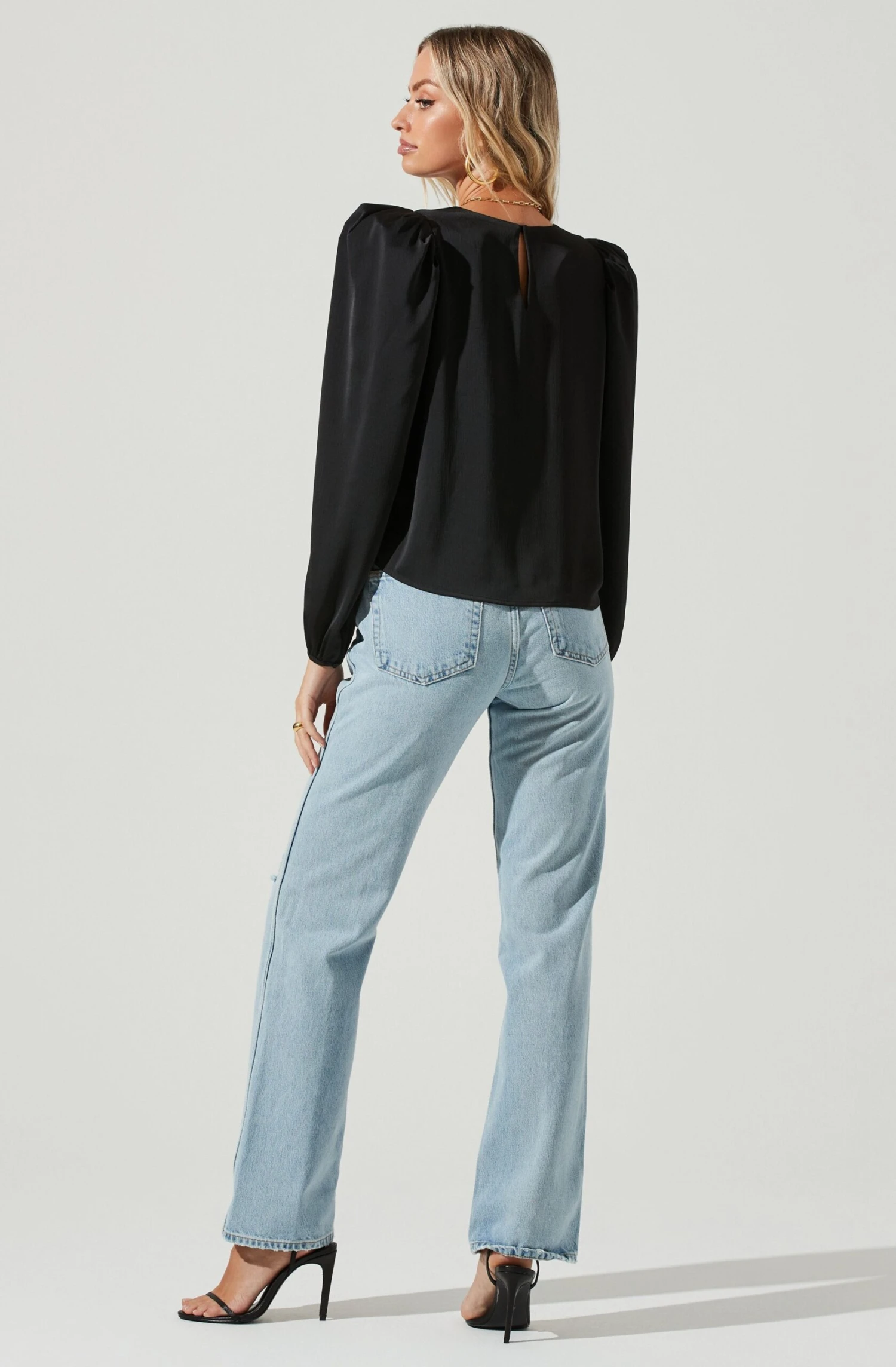 Your going-out top is here. This long sleeve style features a round neckline with gathered details throughout. Padded shoulders and long sleeves with elasticized cuffs. Keyhole back with button closure.