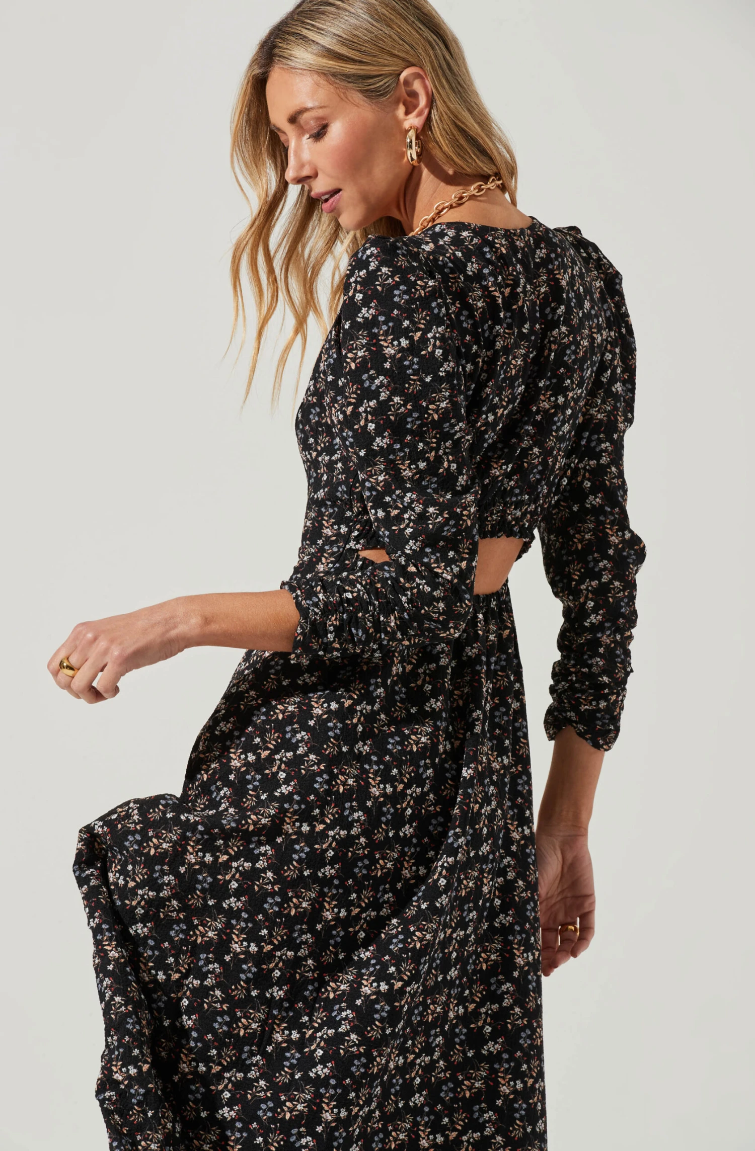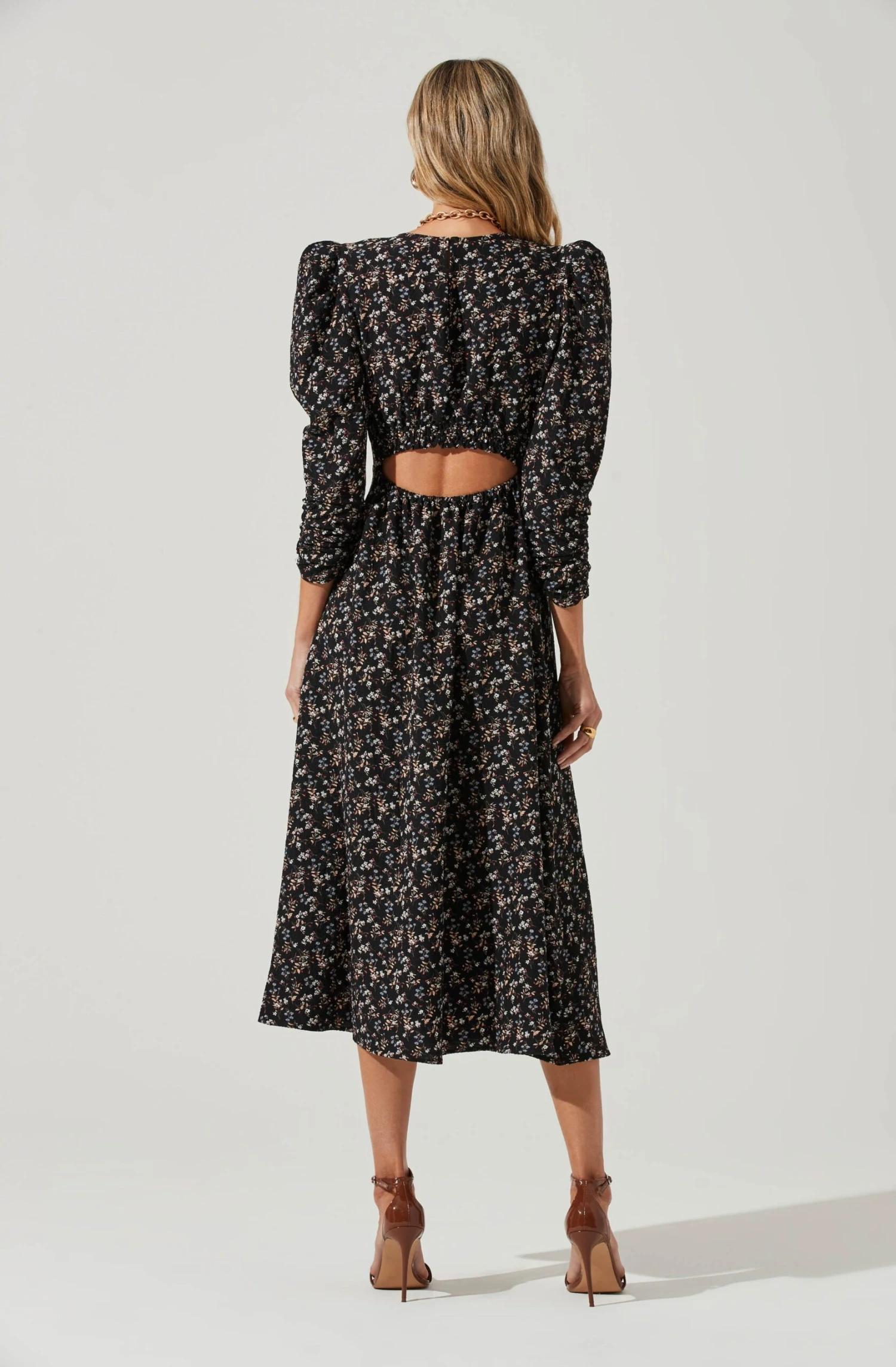 Perfect for a tea party! This midi dress features a soft floral print throughout with a V neckline and fitted bodice. Puff sleeves with ruched cuffs. Back cutout accent. A-line skirt.