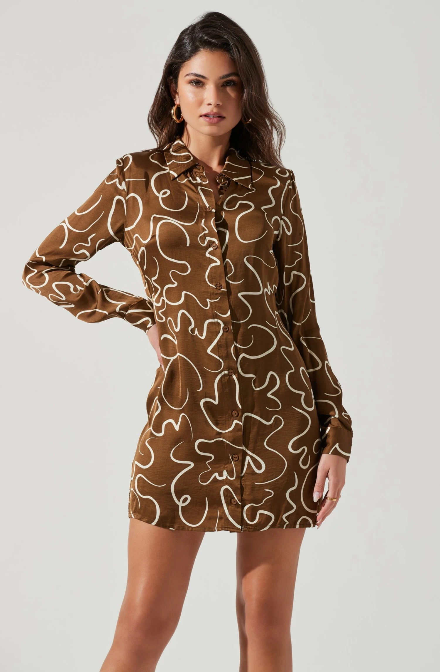 This satin-finish shirt dress features a pointed collar that leads to a functional front button placket. Cutout back detail. Padded shoulders. Long sleeves with button cuffs. Unlined.