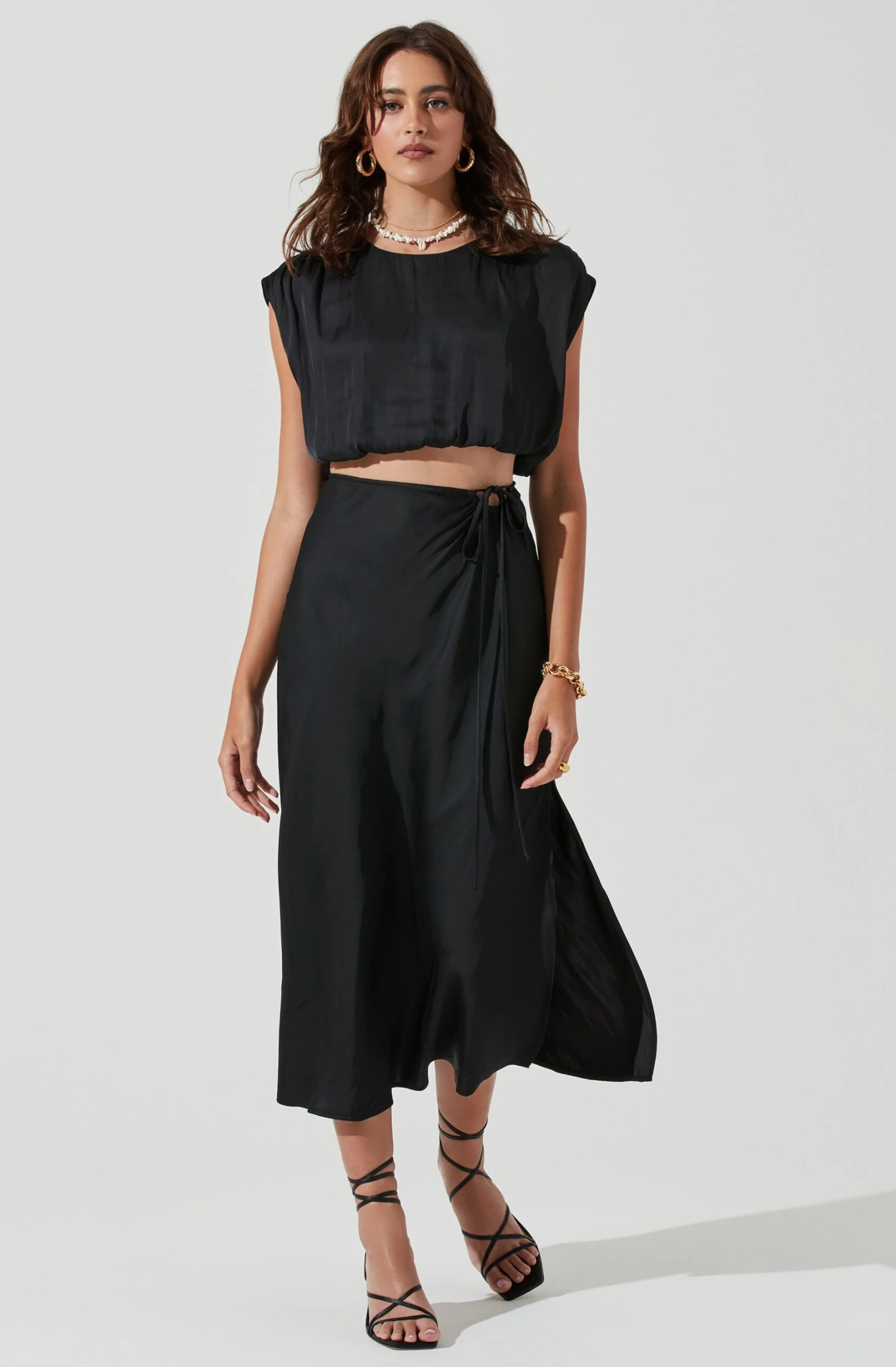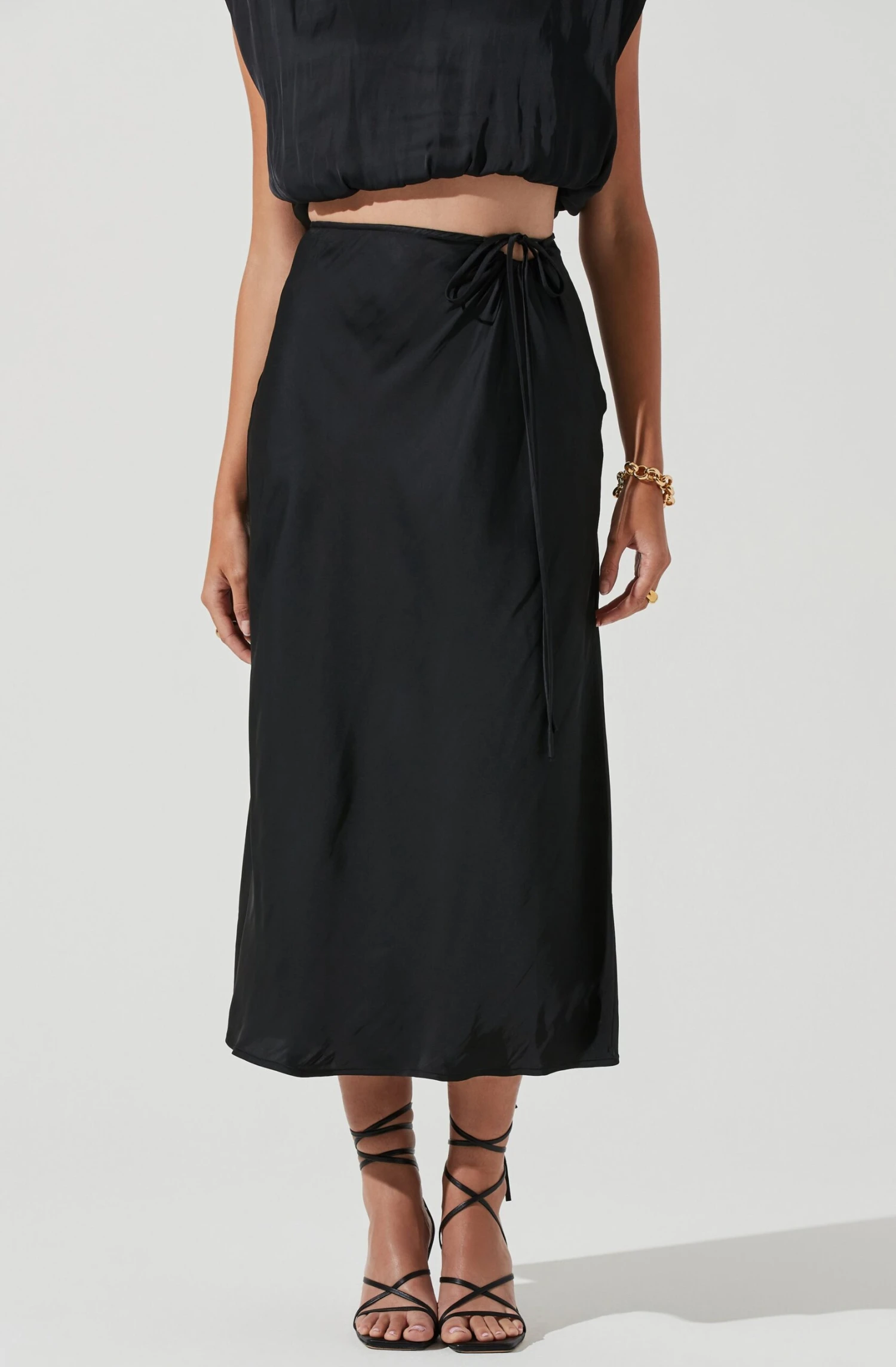 The Riva Skirt features a satin-effect finish that starts with a tie waist accent and side slit detail.