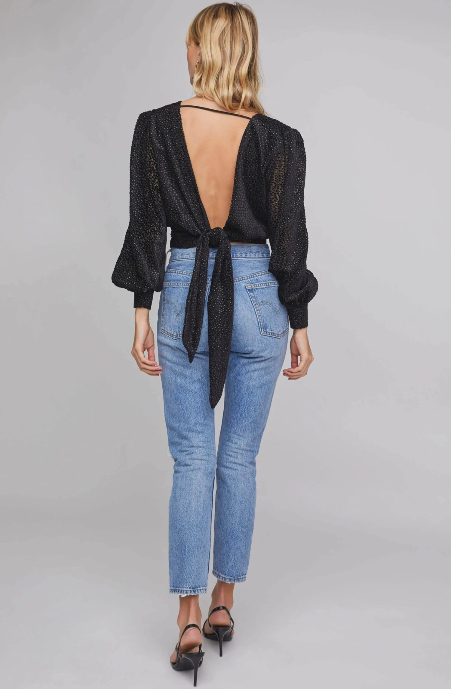 It’s all about looking back and feeling fab. This velvety smooth top features a starry metallic print throughout. Low cut, backless design adds drama and long sleeves. Tie closure.
