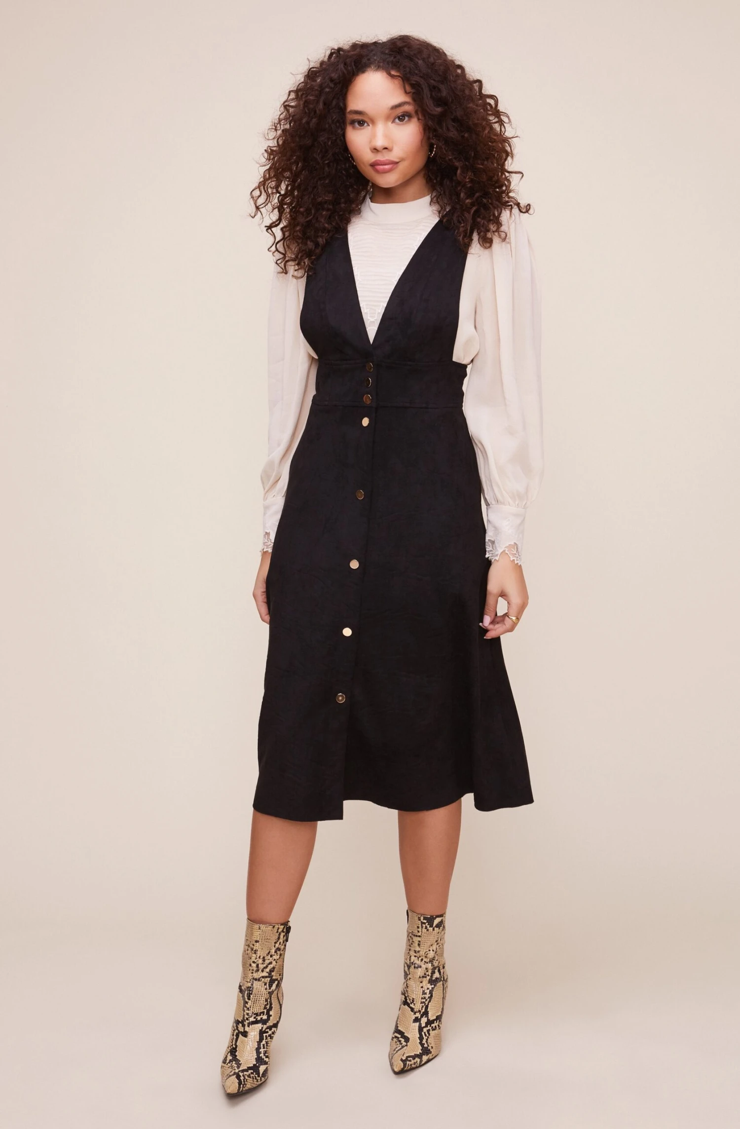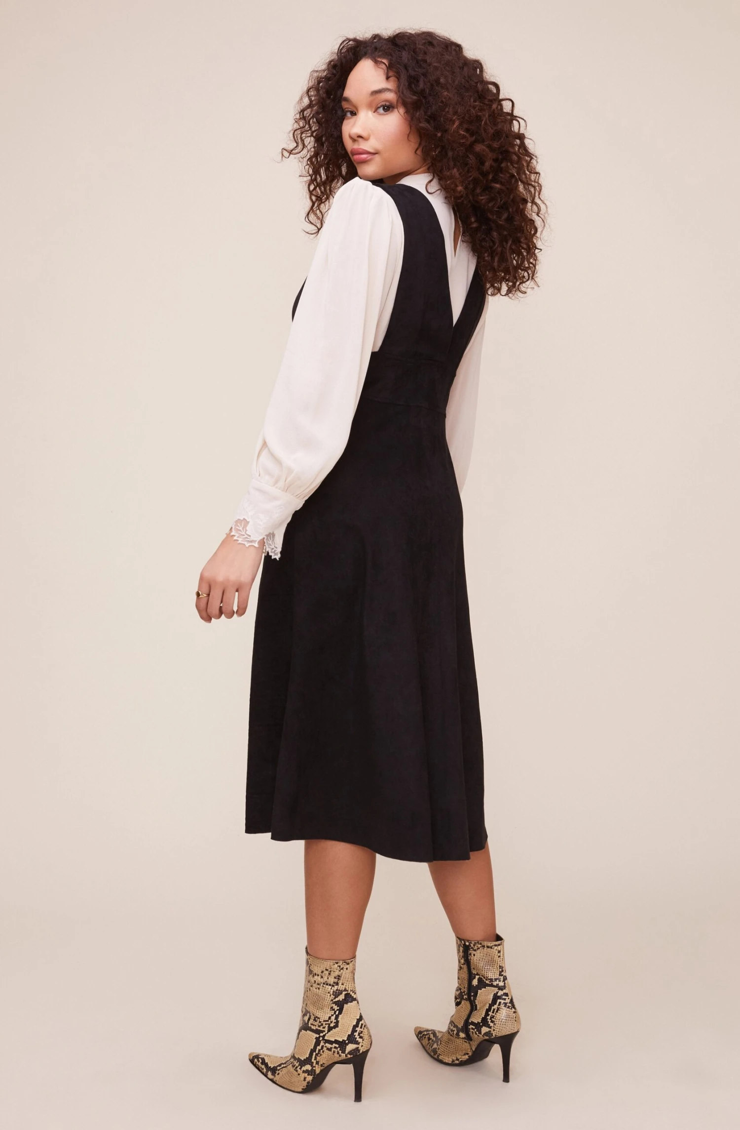 The Rosemary dress features a charming pinafore silhouette. Statement straps support the buttoned midi skirt with a deep plunging front and back.