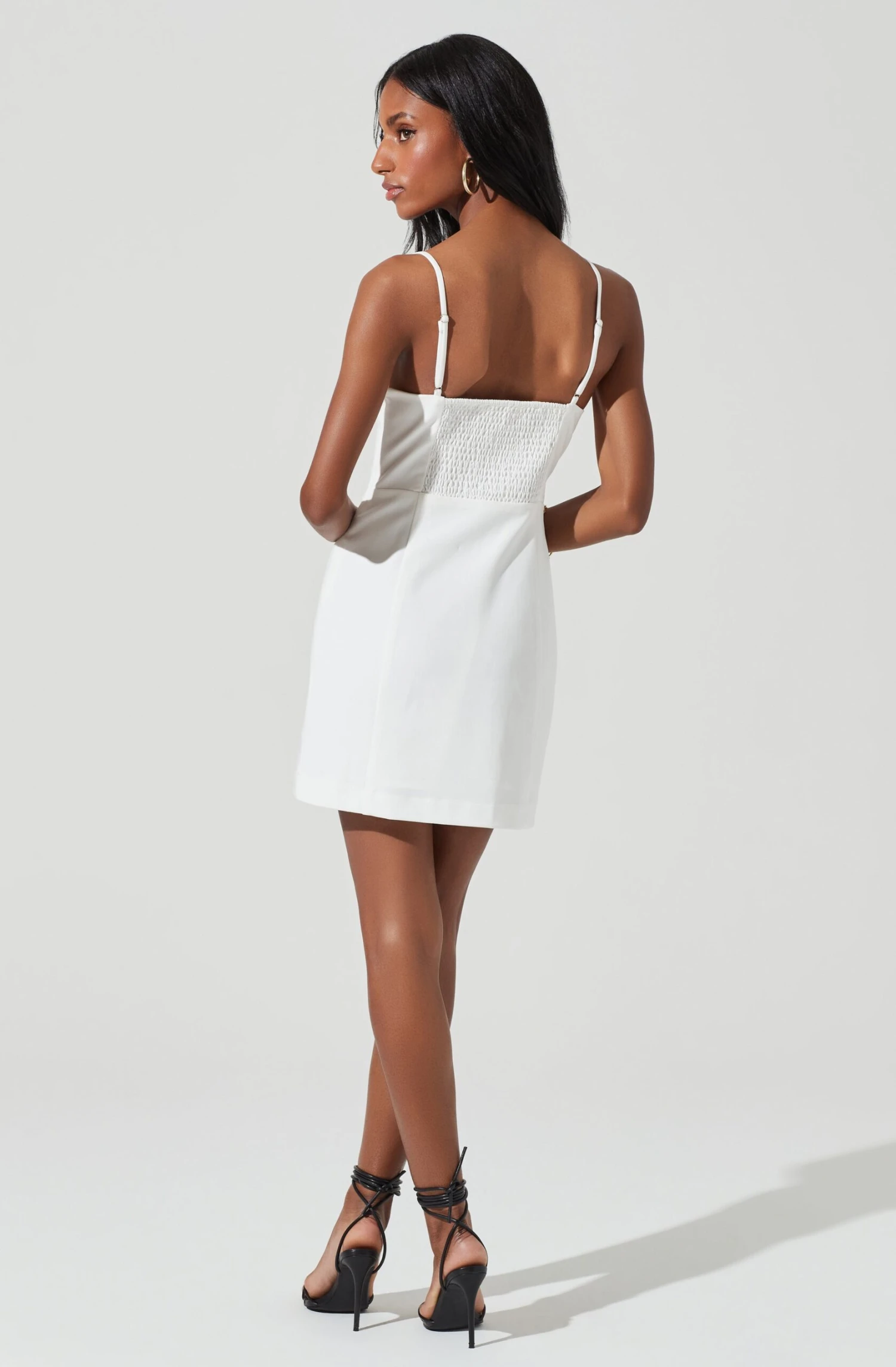 This chic mini dress features a sweetheart neckline with an underwired notch at the bust. Ruched front leads to a bodycon silhouette. Adjustable straps. Smocked back. Fully lined. Concealed side zip closure.