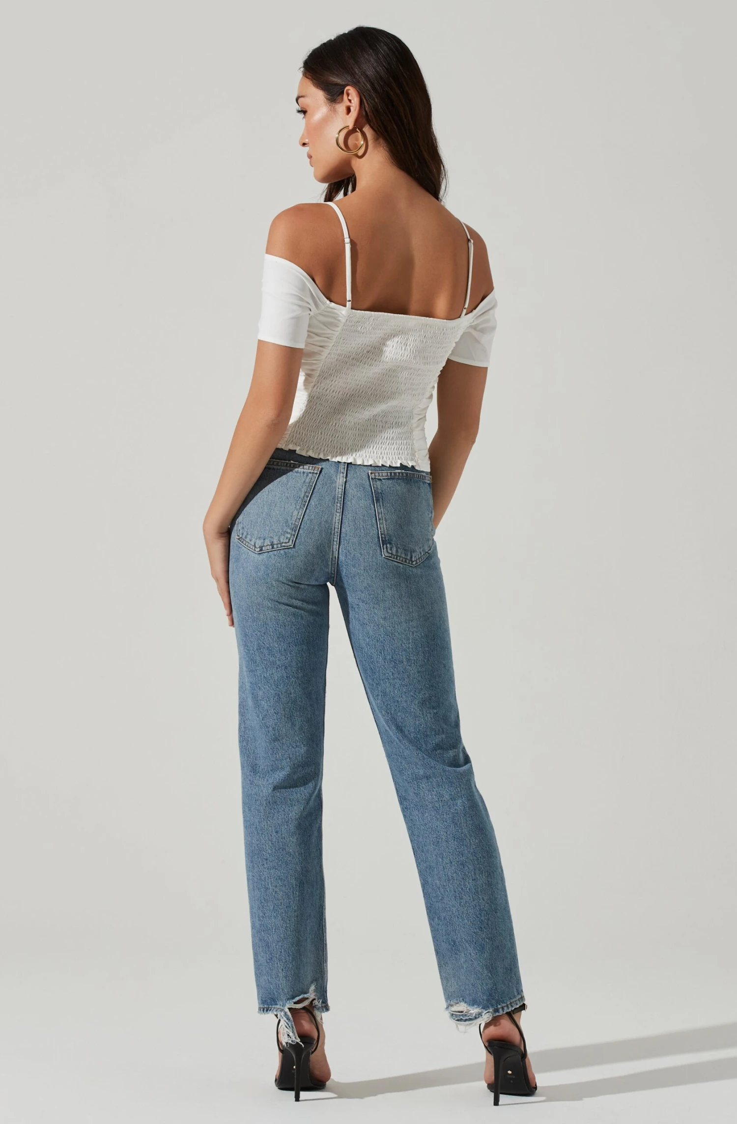Bare your sun-kissed glow. Off shoulder neckline is supported by adjustable straps and features short sleeves. Ruched bodice accentuates. Smocked back.