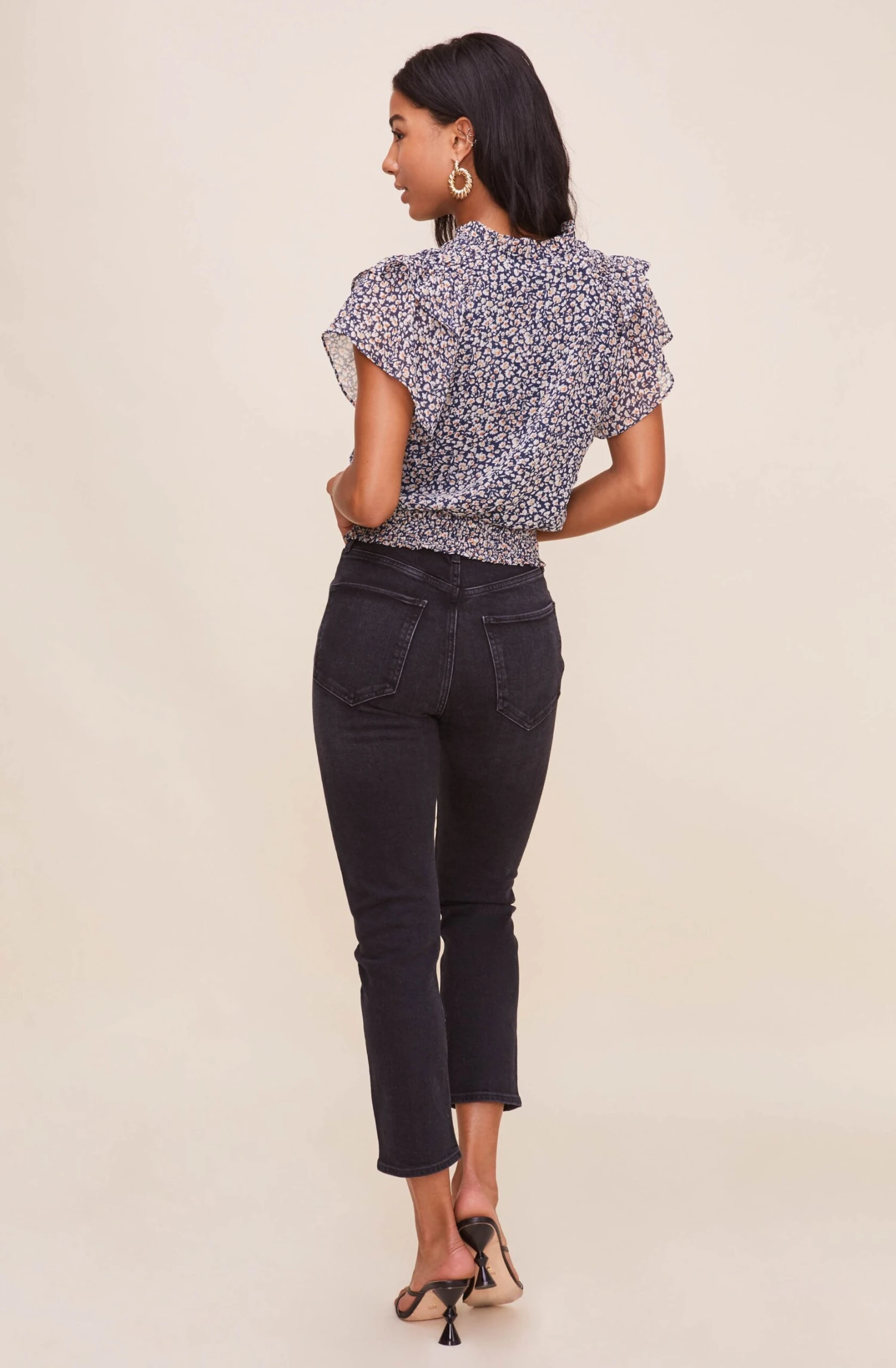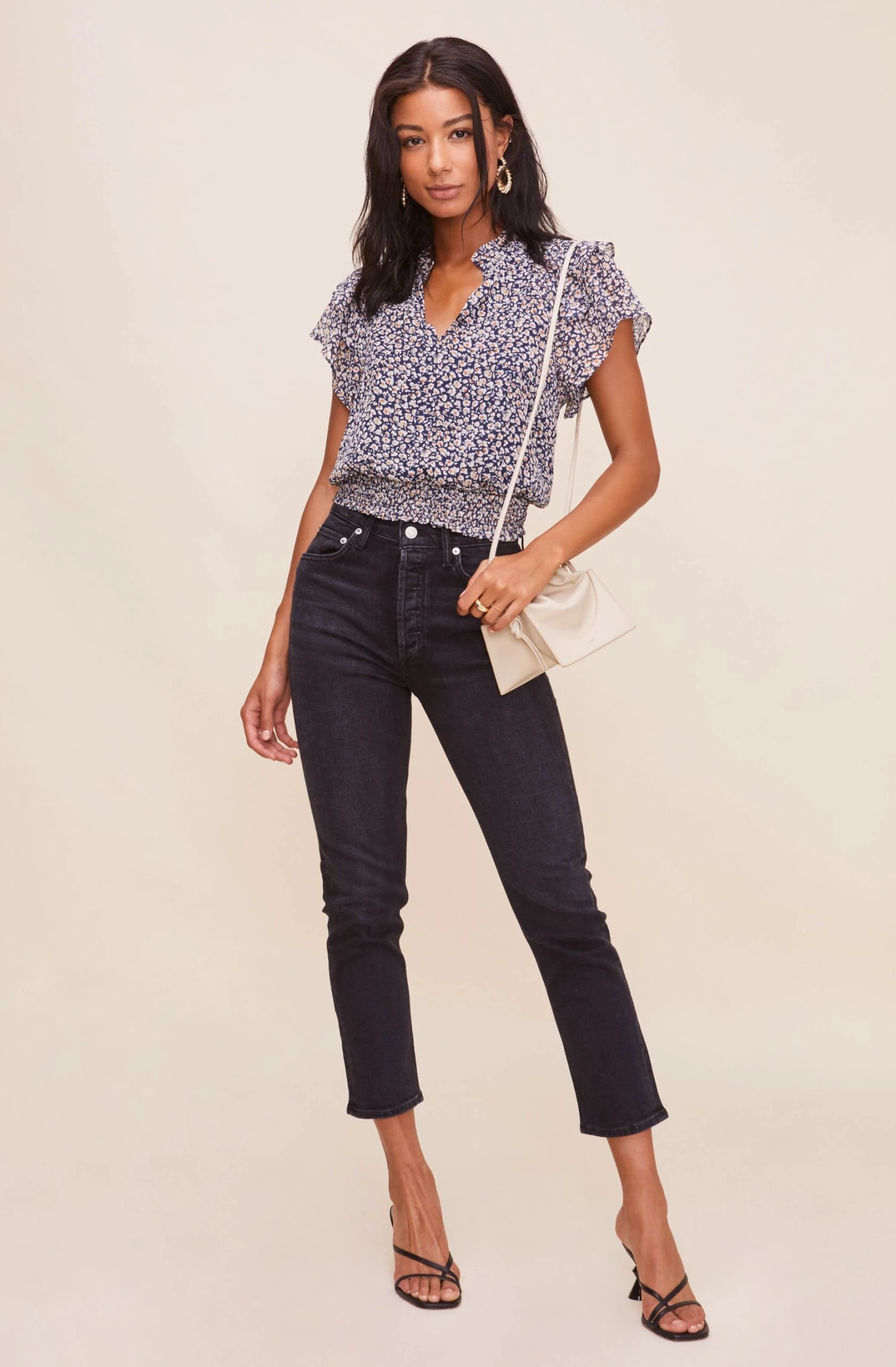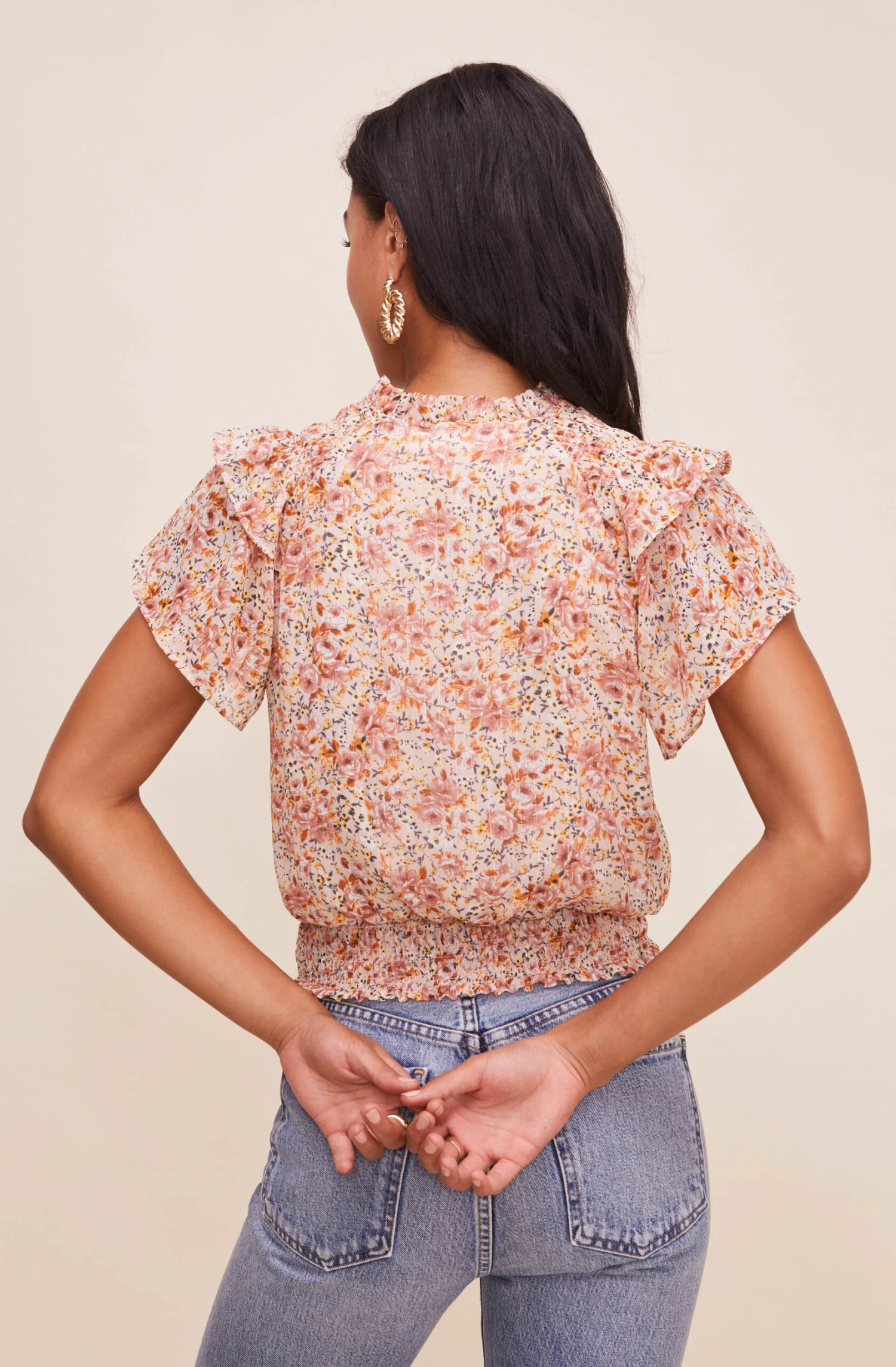 Something sweet yet simple will always do the trick! This top features a subtle V neck collar that leads to a relaxed bodice and smocked hemline. Short ruffle sleeves. Floral print throughout.