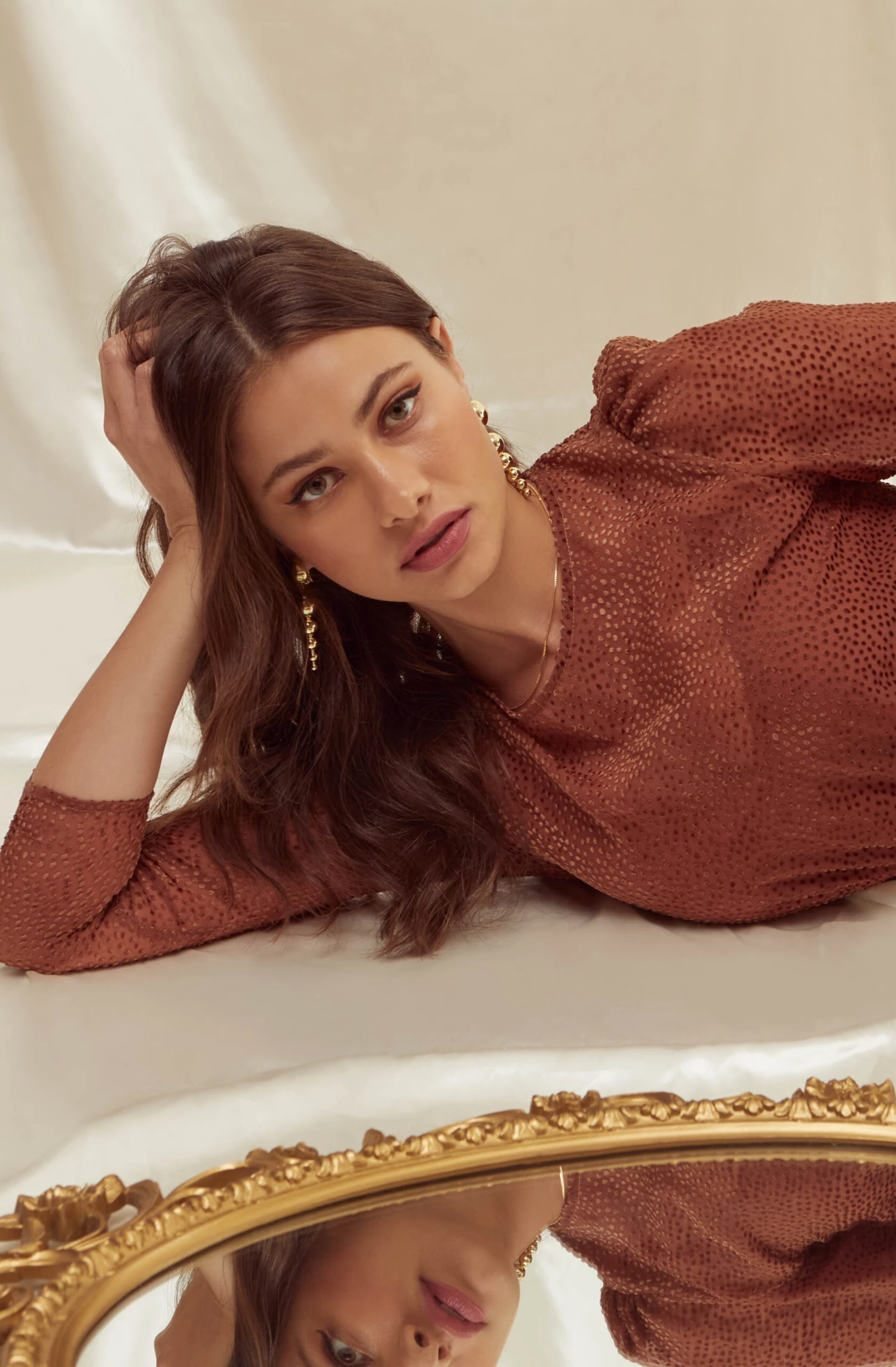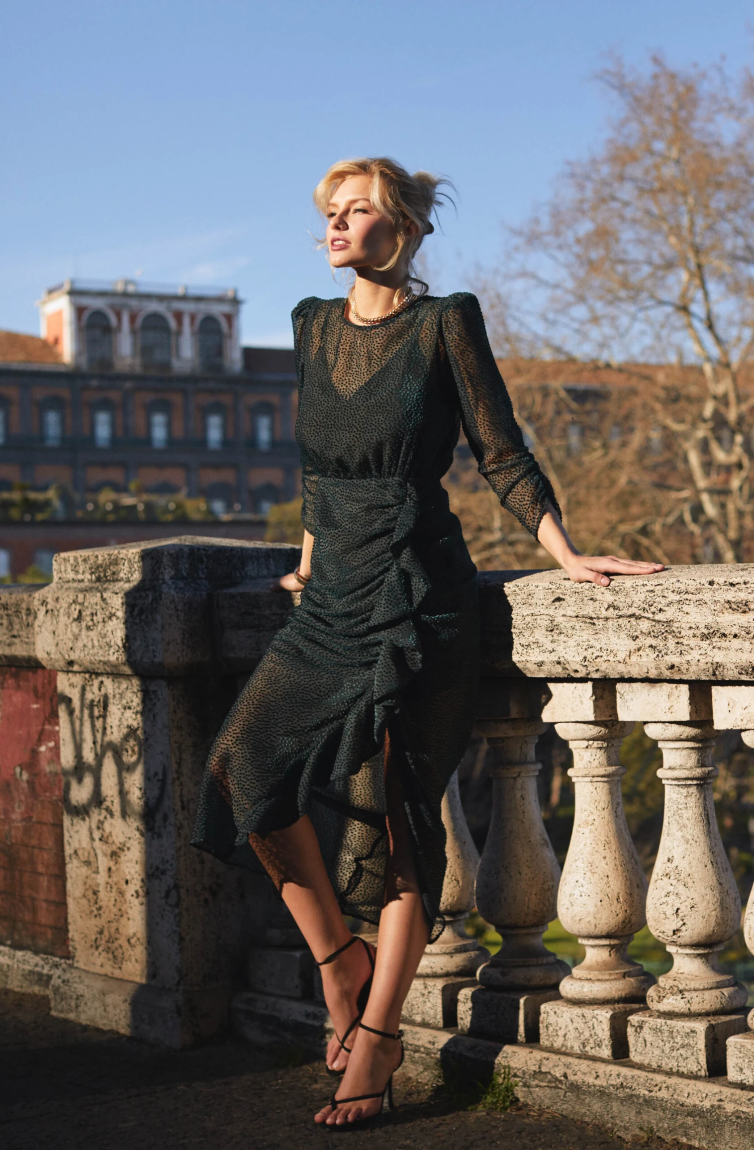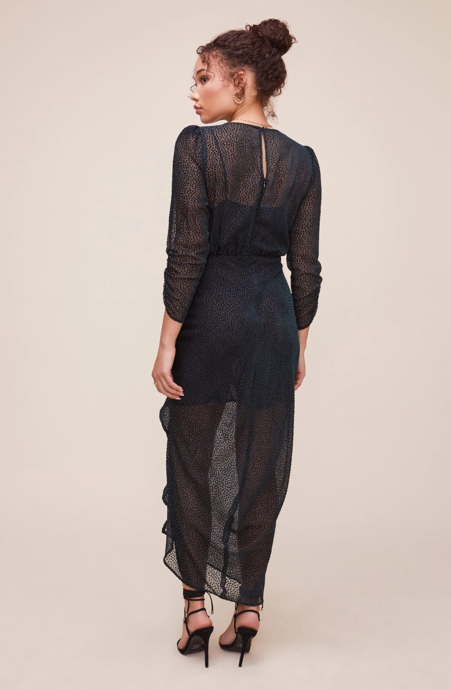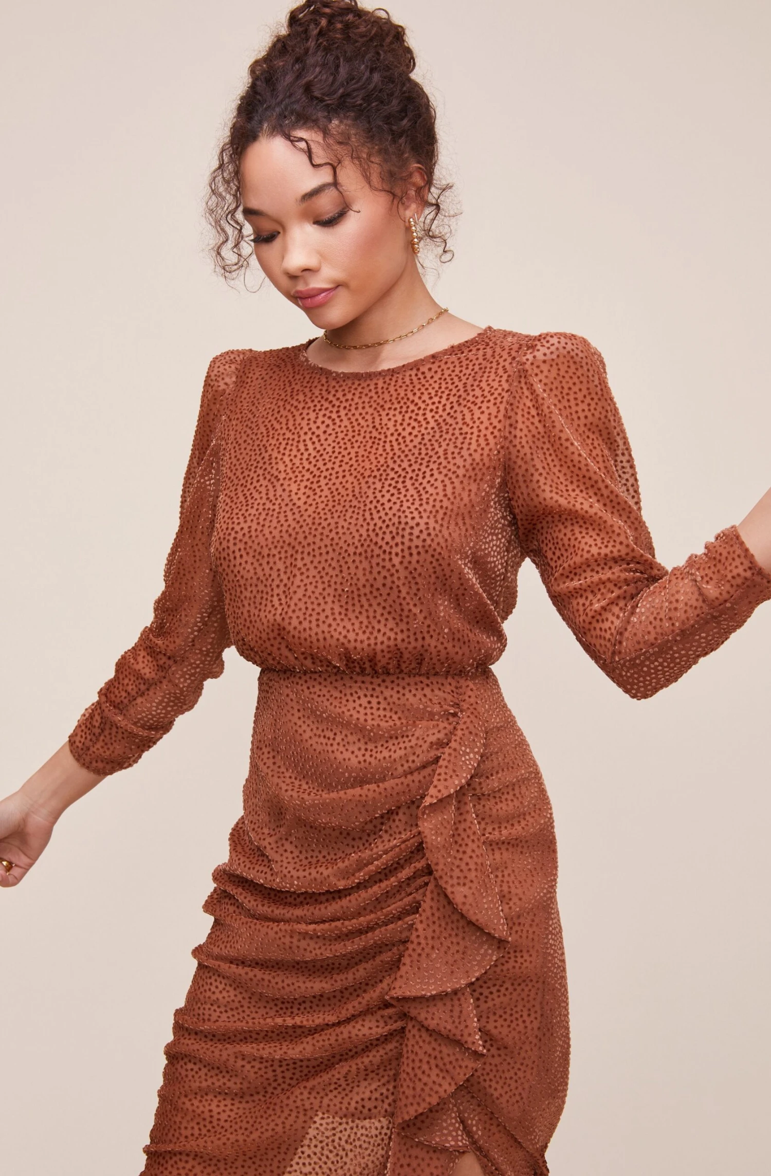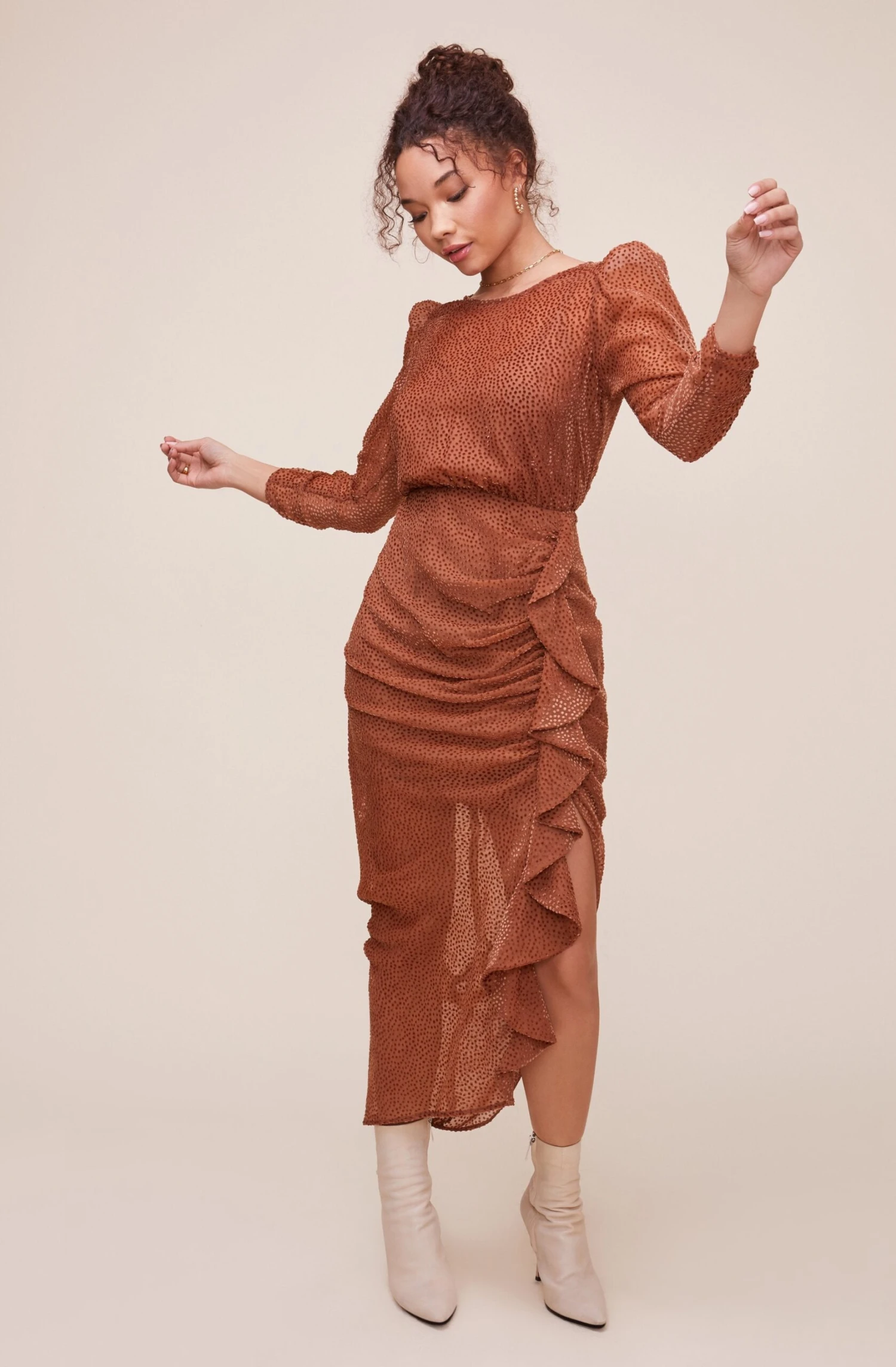 Meet the show-stopping Samara dress. It features a rounded collar that leads to a relaxed bodice and fitted waist with ruched detailing. Cascading ruffle trim alongside the front of the midi skirt. Sexy front slit accent. Long sleeves. Keyhole back.