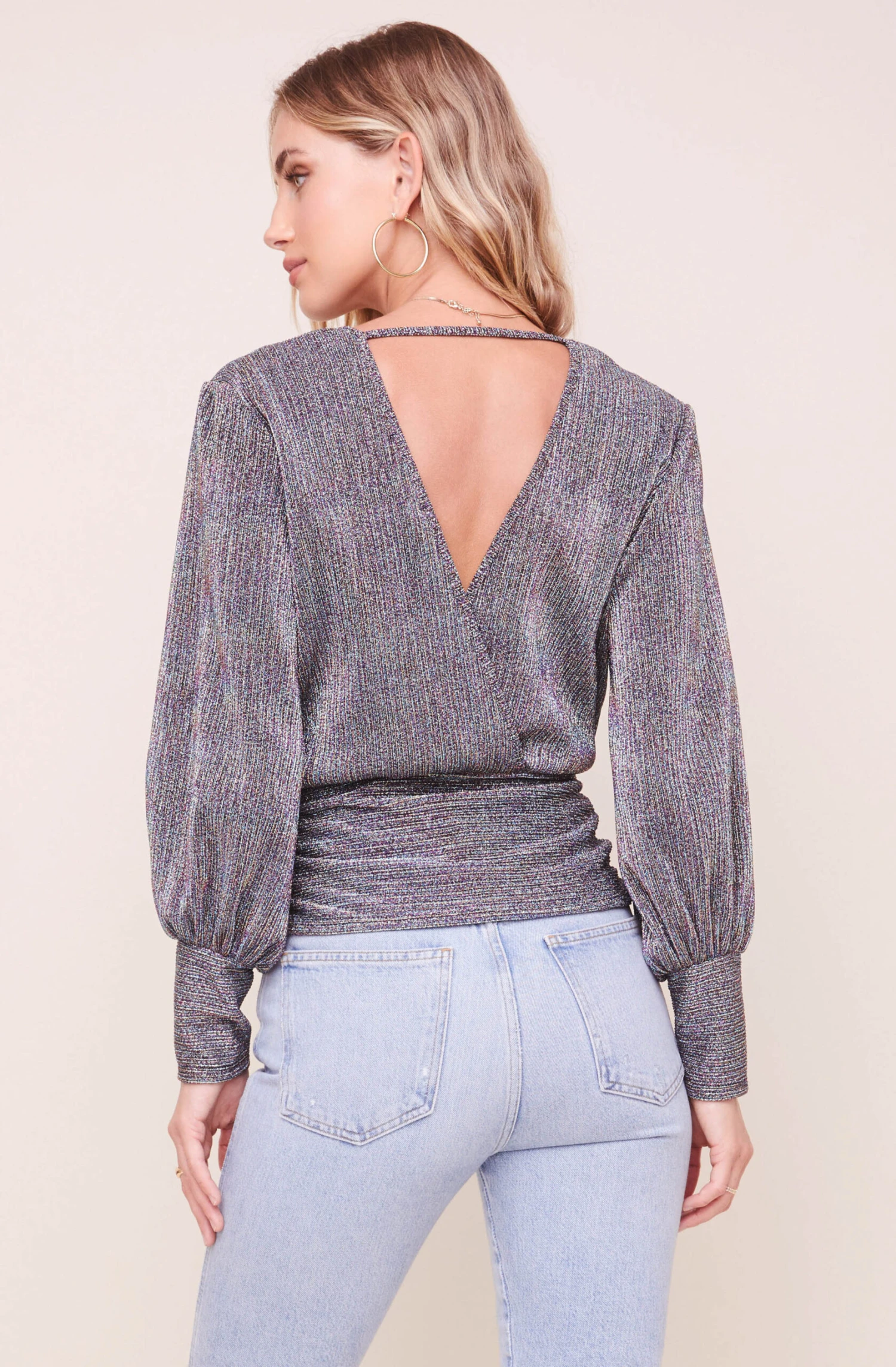Multi-colored metallic perfection. This top features a V neckline that leads to a wrap front and cinched waist. Long blouson sleeves. V-cut back.