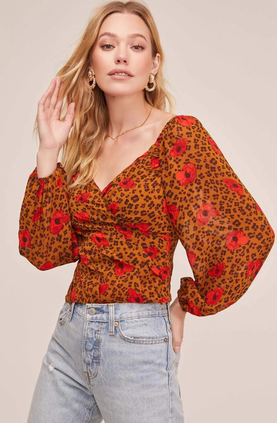 Get in the mix this fall with prints that go better together! This flattering top features a perfect mix of leopard and florals for an unexpected pattern! V neckline descends to a wrap front and fitted bodice. Long puff sleeves and shirred detailing on the back.