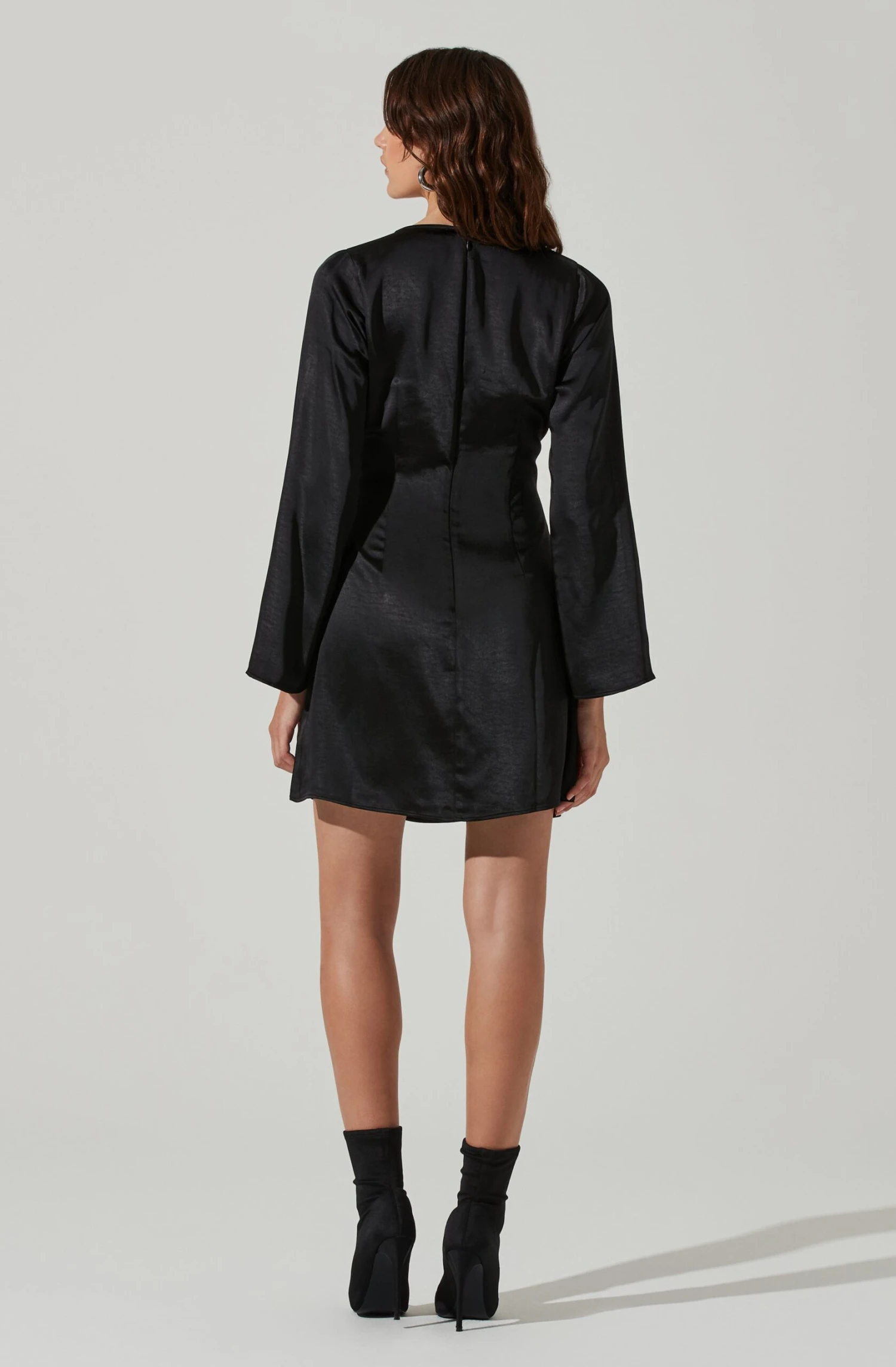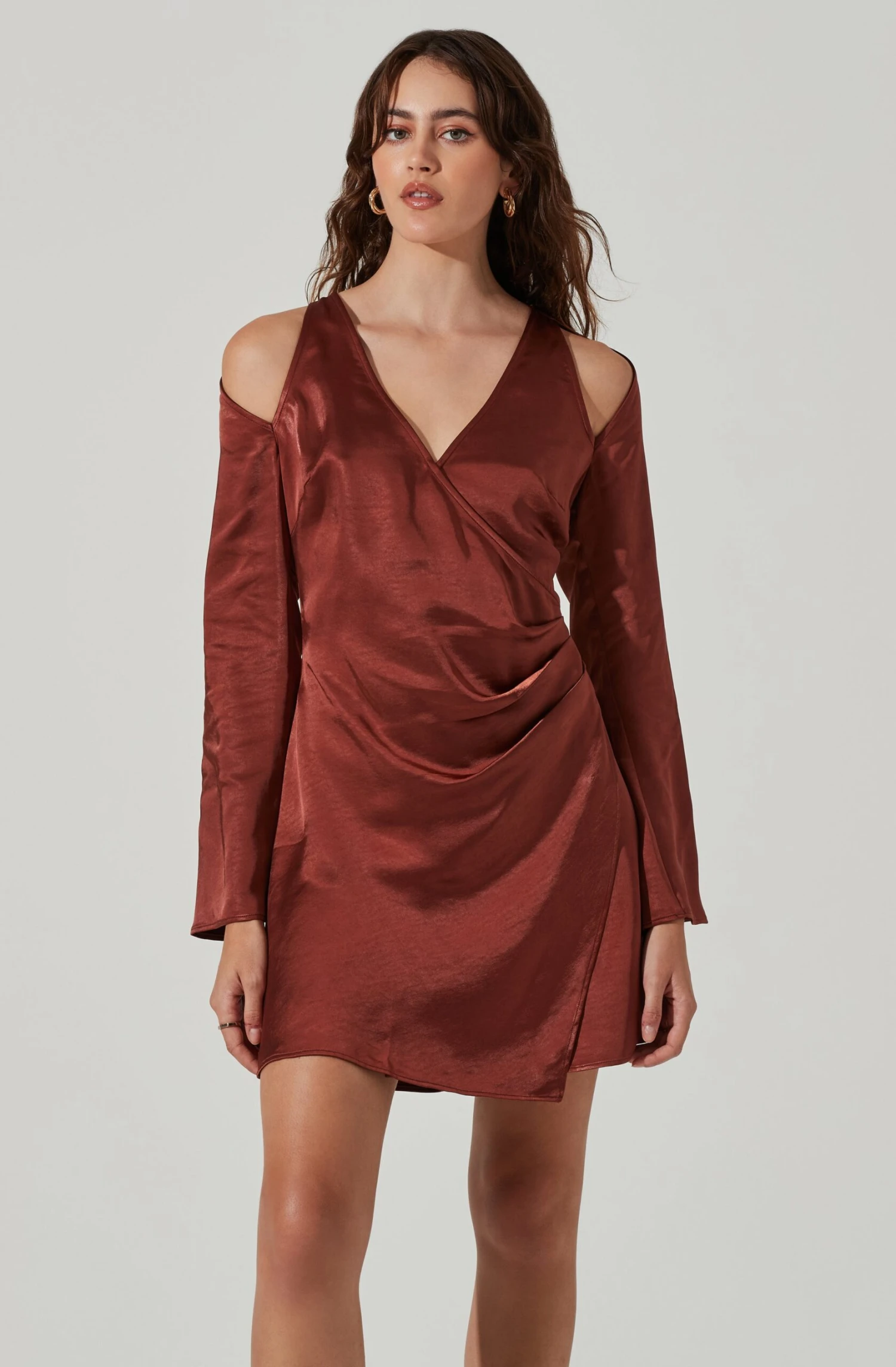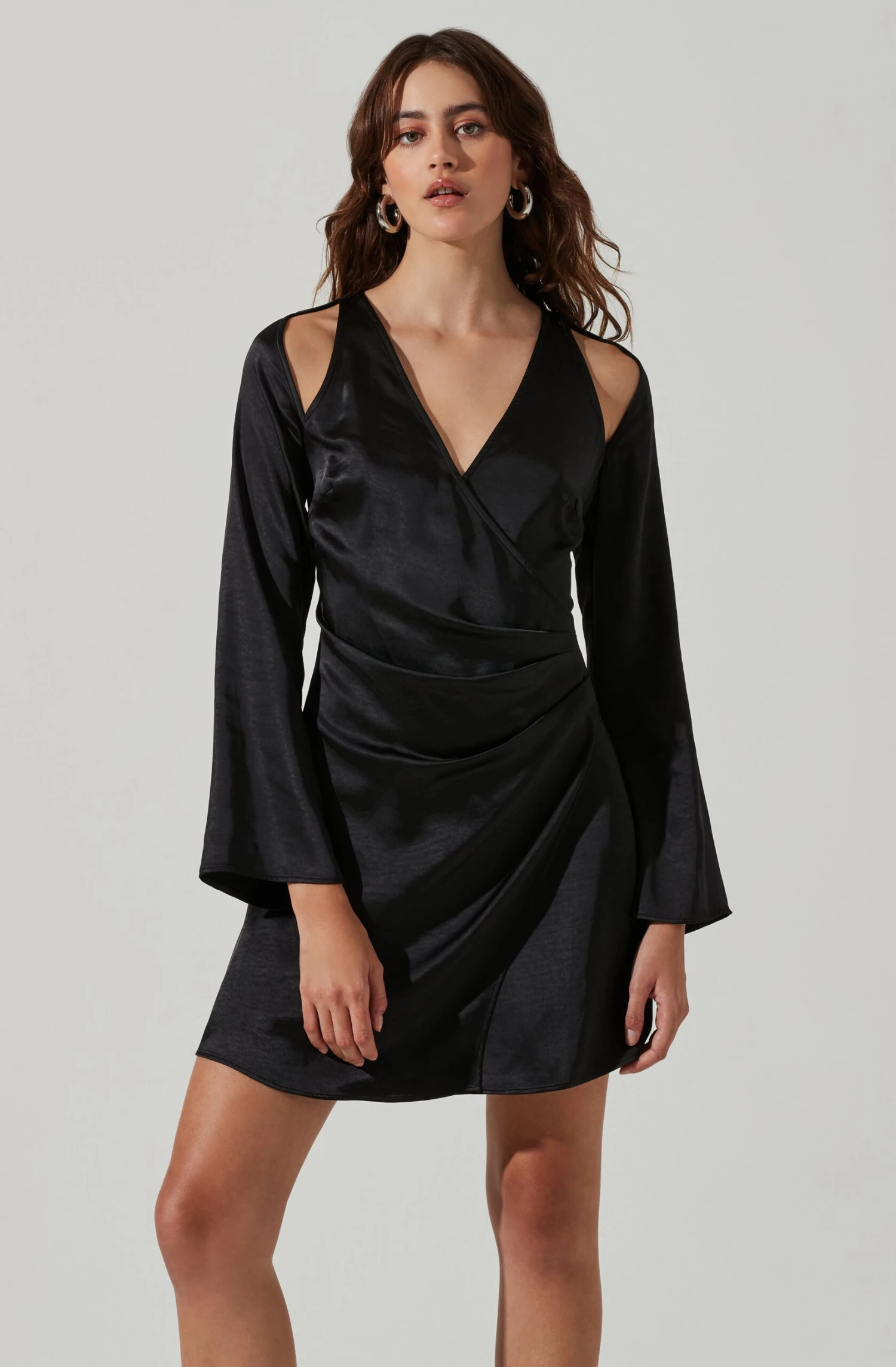 This satin mini dress features a V neckline and cutout shoulders that lead to long bell sleeves. Wrapped front leads to a mini skirt. Concealed zip closures.