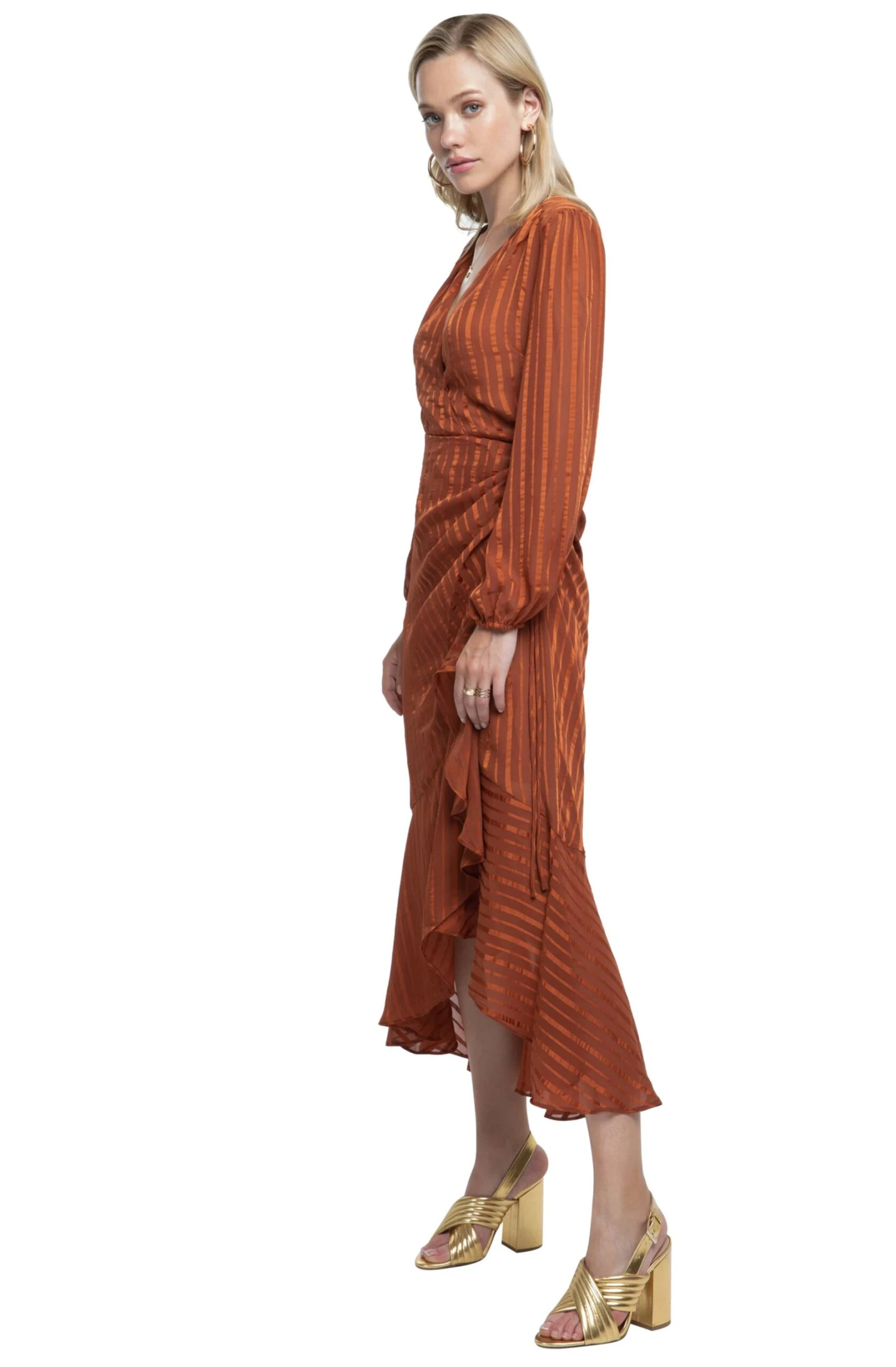 100% Polyester, Length: 50″ (Size M), Zipper Closure, Dry Clean Only, Gathered Midi Dress, Ruffle Accent, Model is Wearing Size S, Model’s Measurements: Height 5’9″ // Bust 32″ // Waist 24″ // Hips 34.5″, Fits True to Size, Style#ACDR100106C