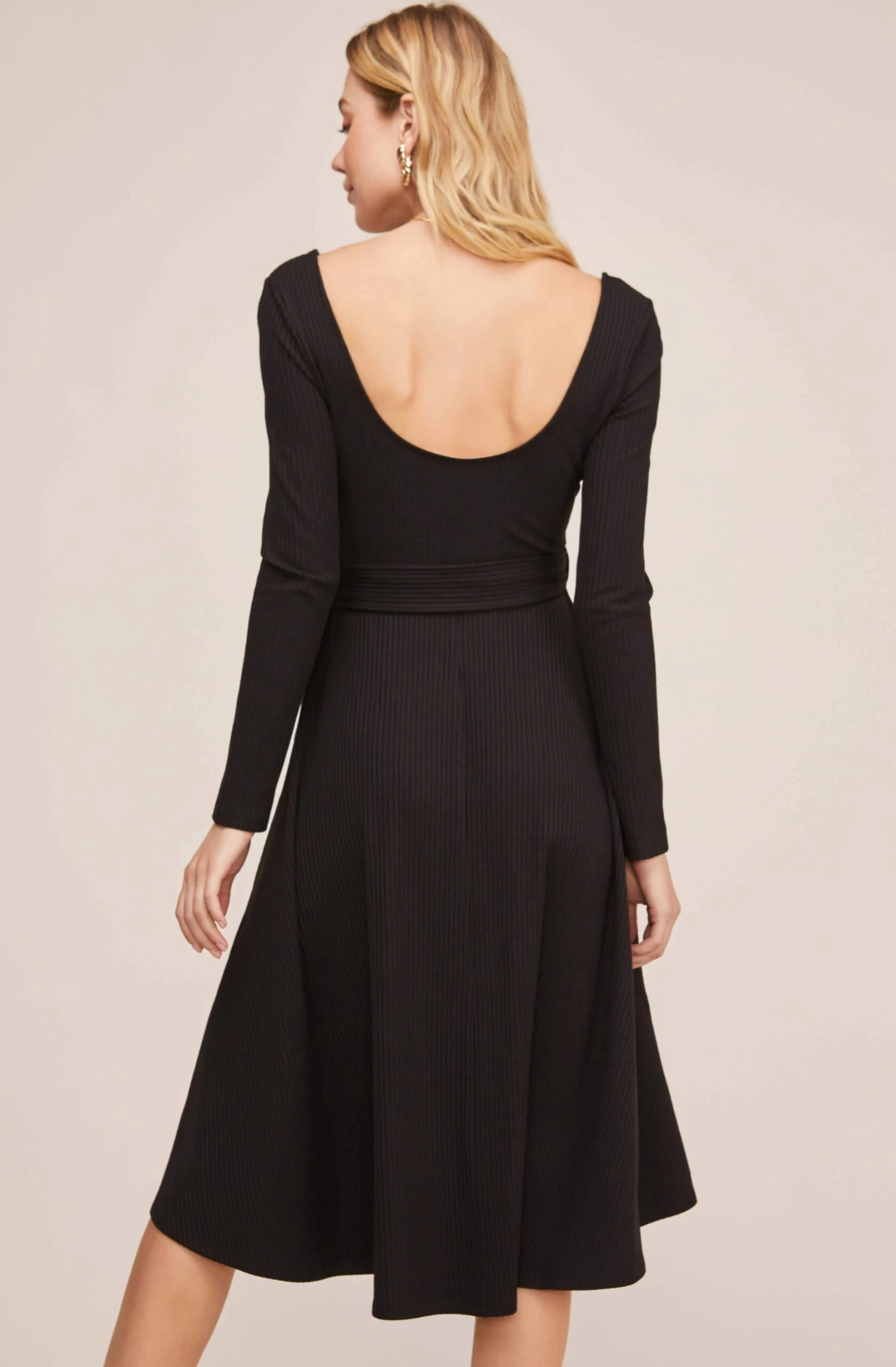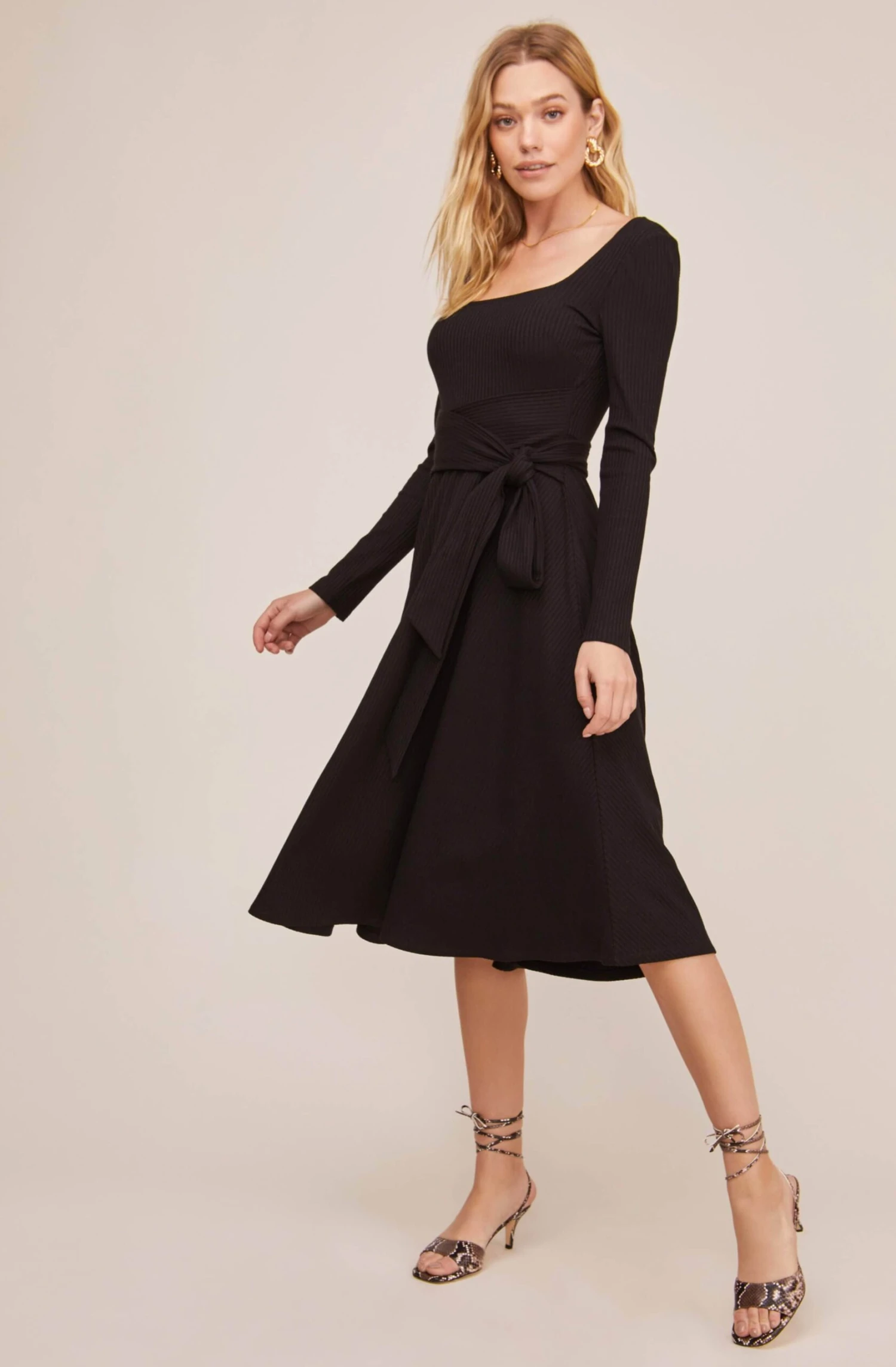 It’s the fall outfit you’ve been waiting for. This ribbed knit midi dress is perfect for staying warm while looking chic. Square neckline and darted bust frame the figure and descend to a knot waist. Flowy midi skirt and long sleeves. Scoop back.