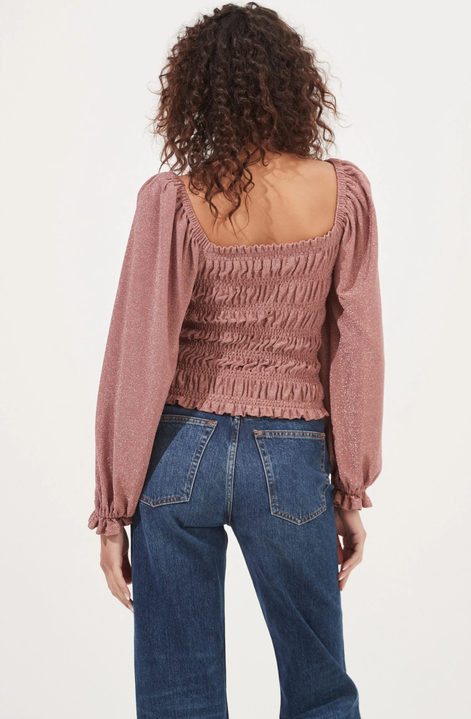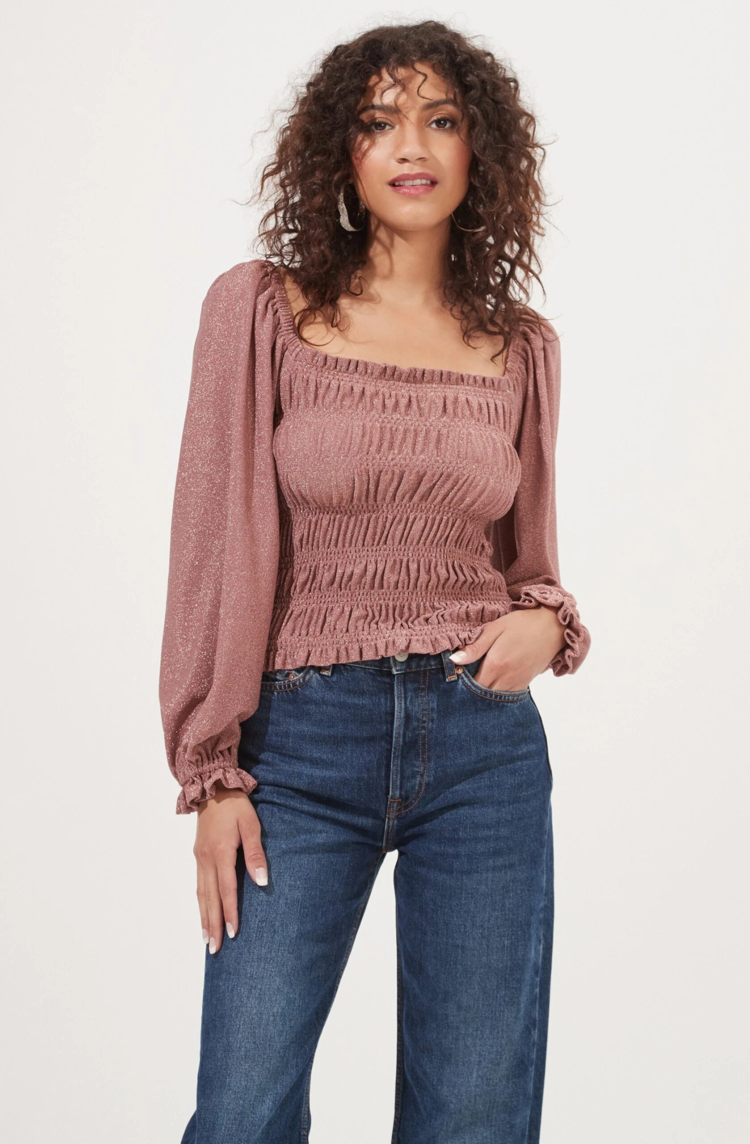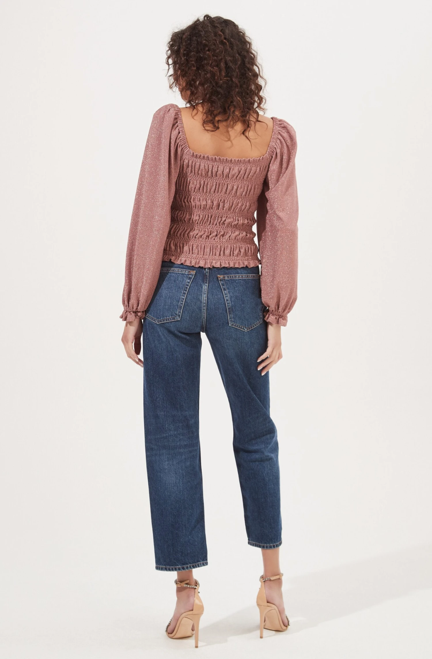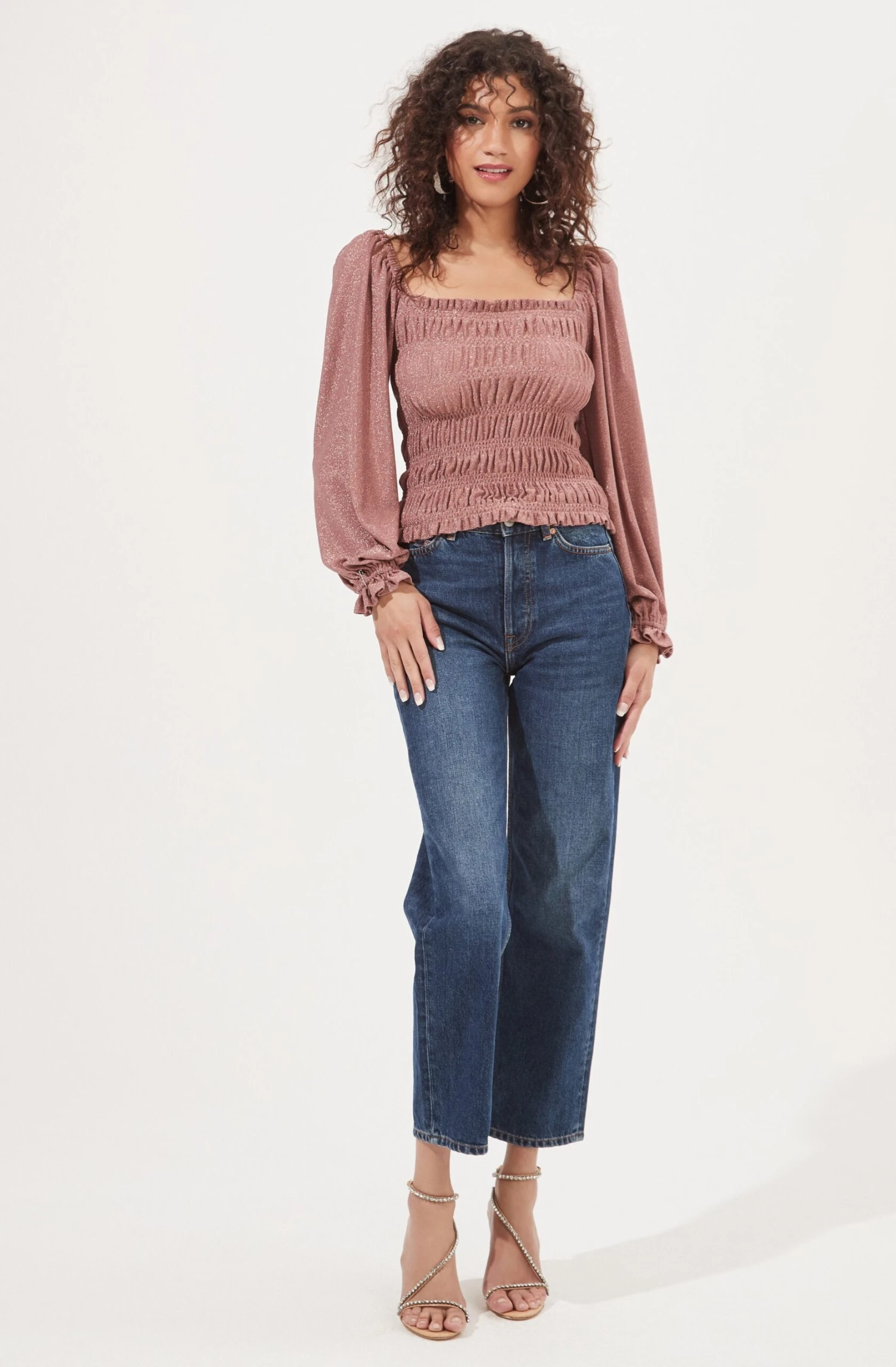 The Tabitha Top features a square neckline that leads to a smocked bodice. Long puff sleeves with smocked cuffs.