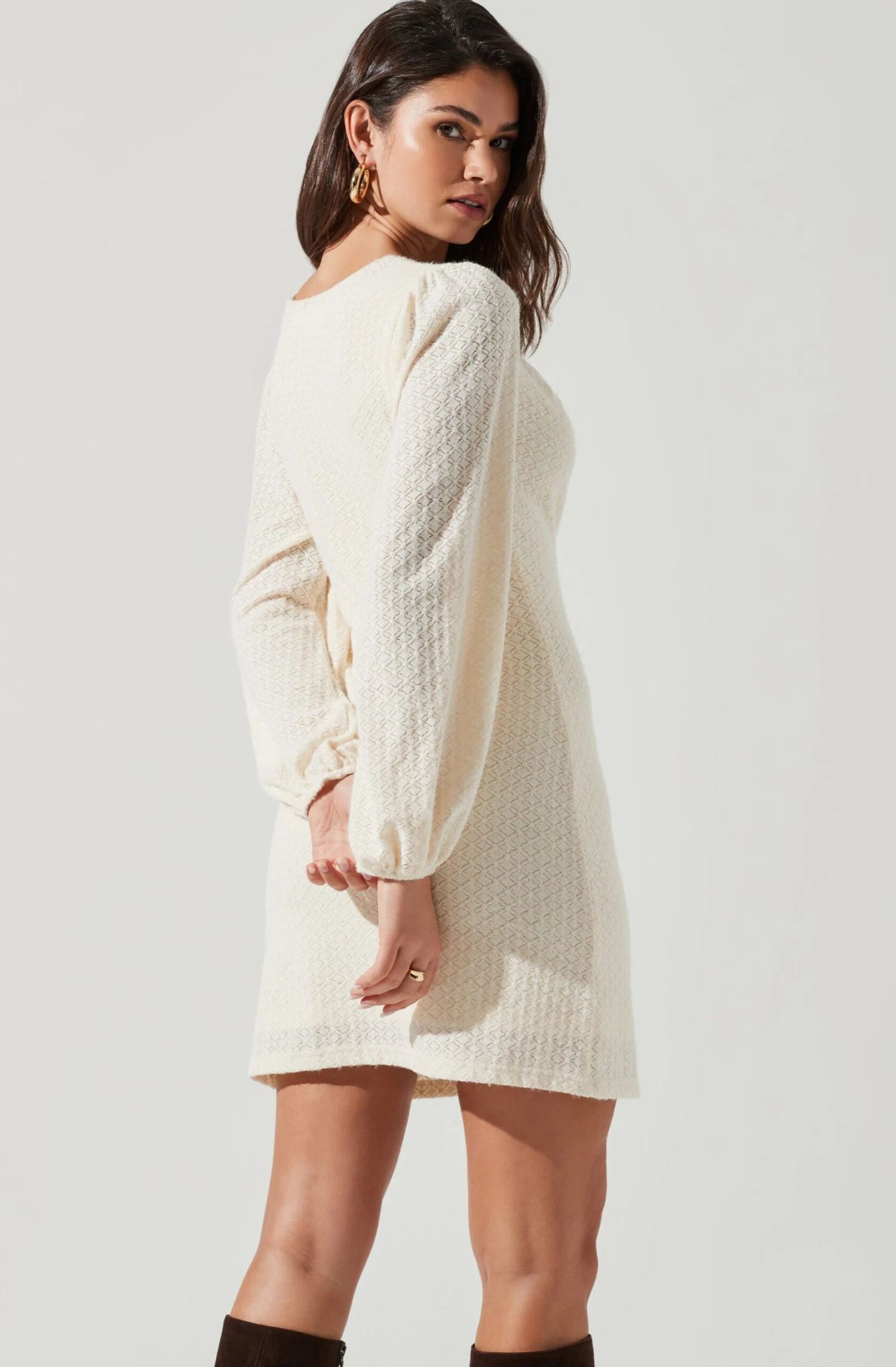 This knit mini dress features a round neckline that leads to a cutout front with a drawstring accent. Long puff sleeves. Fully lined. Abbreviated hem.