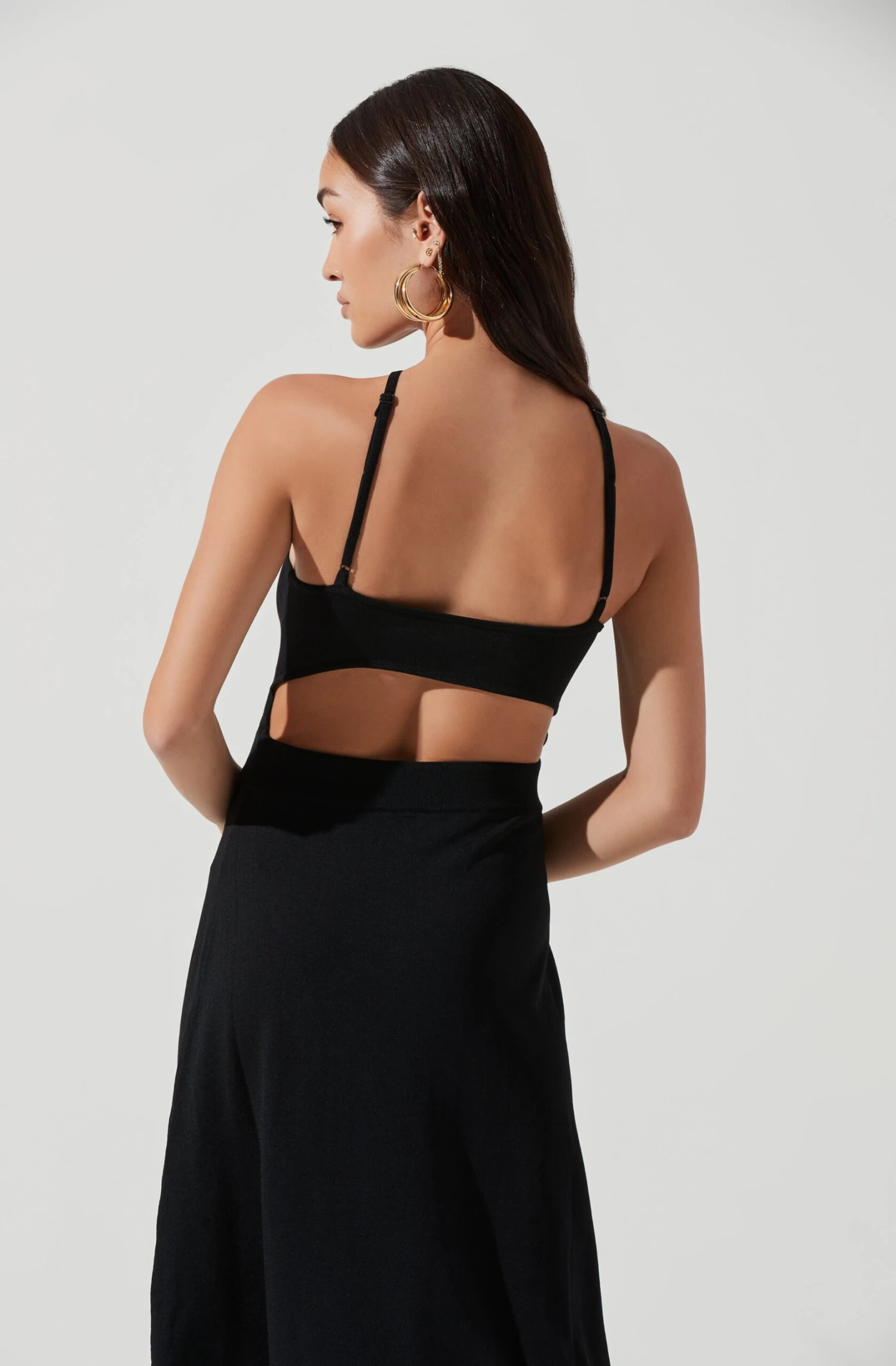 The Talia Dress features a halter neckline that leads to a cutout back detail and adjustable straps. Midi-length skirt.