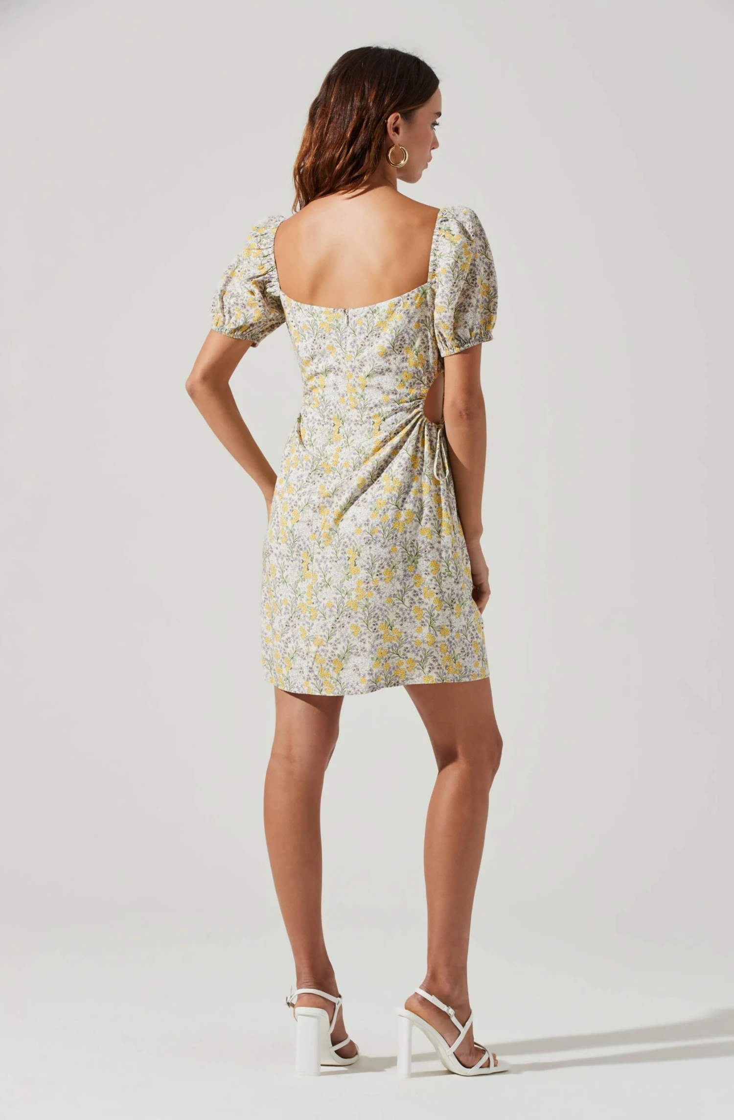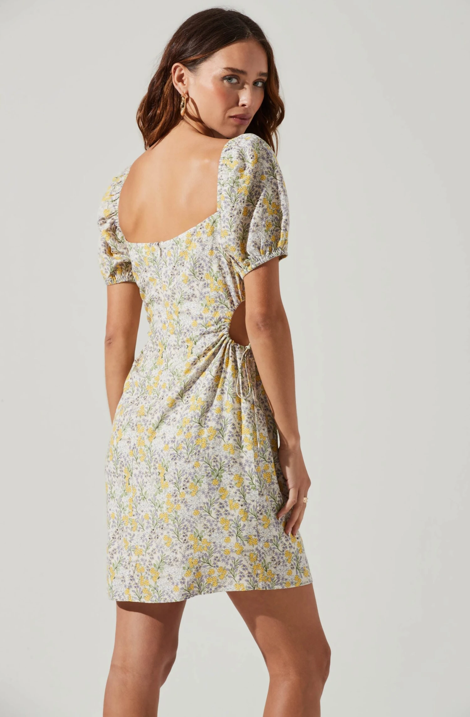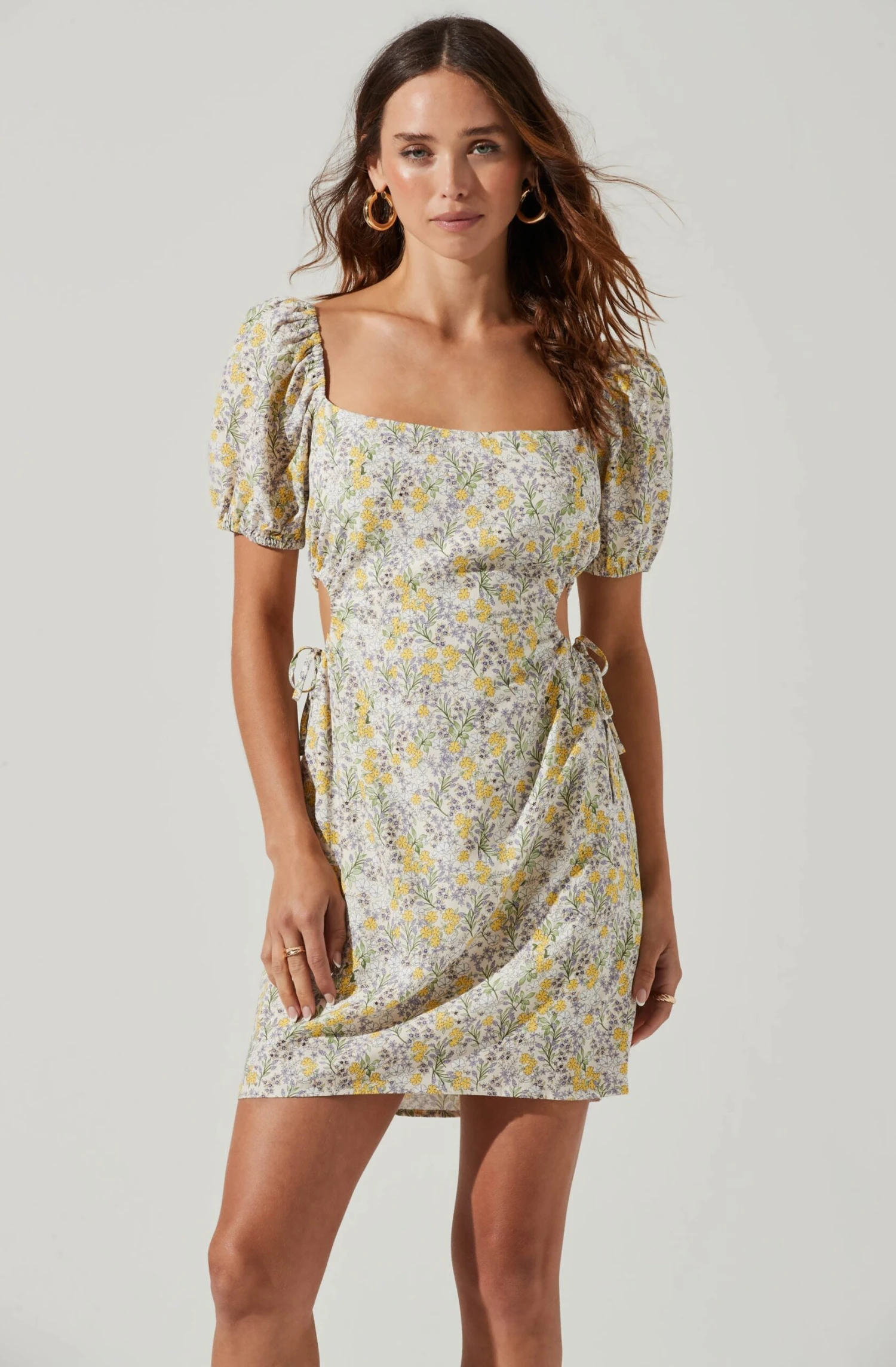 Ready to make a statement! The Talula Dress features a square neckline that leads to double side cutout accents with a drawstring detail. Short puff sleeves. Multi-floral print.