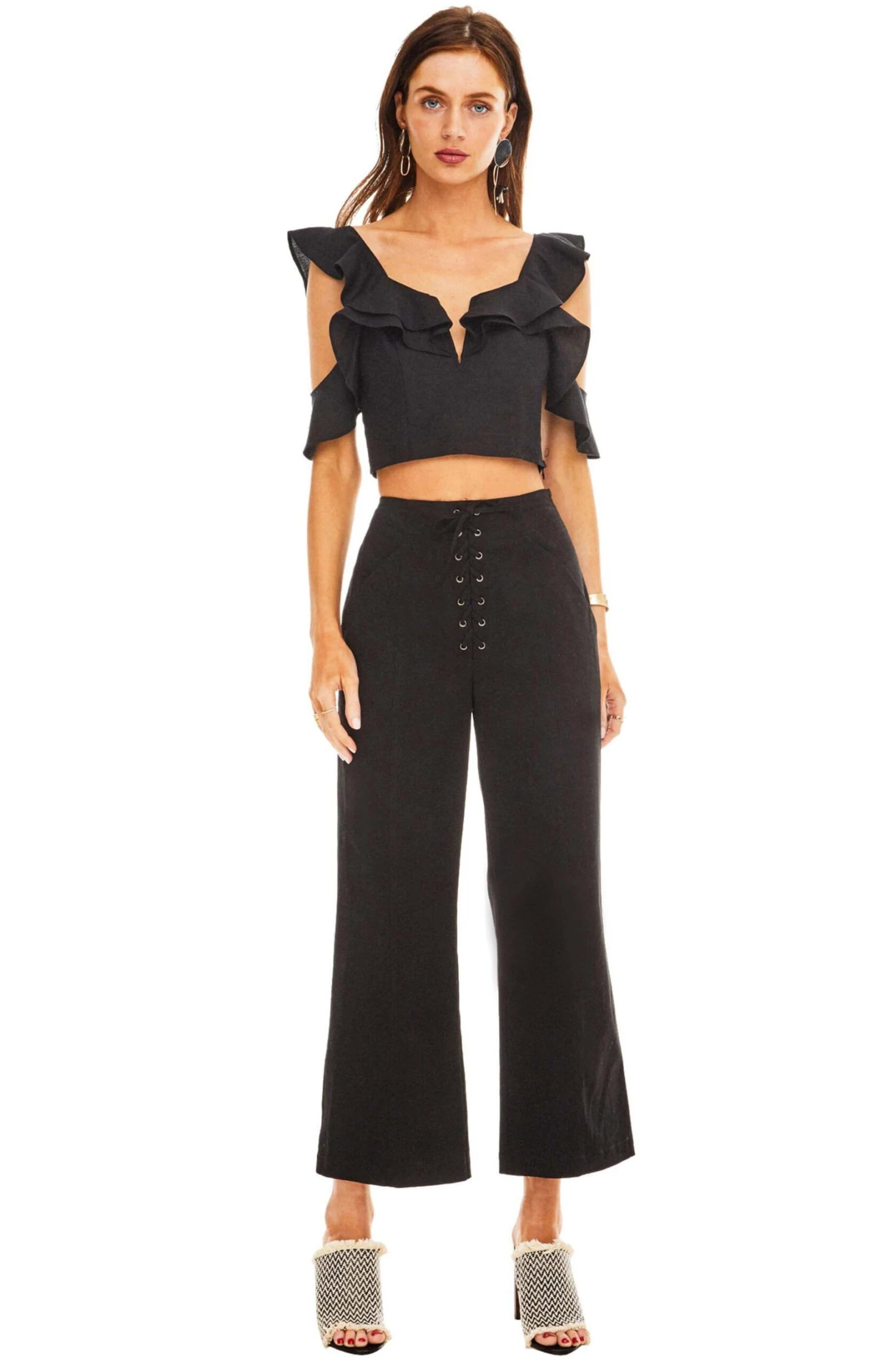 97% Cotton / 3% Elastane, Inseam Length: 26 1/2″ / Leg Opening: 11″ / Front Rise: 12″ (Size M), Zipper Closure, Dry Clean Only, Wide Leg Trousers, Grommet Laced, Model is Wearing Size S, Model’s Measurements: Height 5’10” // Bust 31″ // Waist 24″ // Hips 33.5″, Fits True to Size, Style#ACP6448