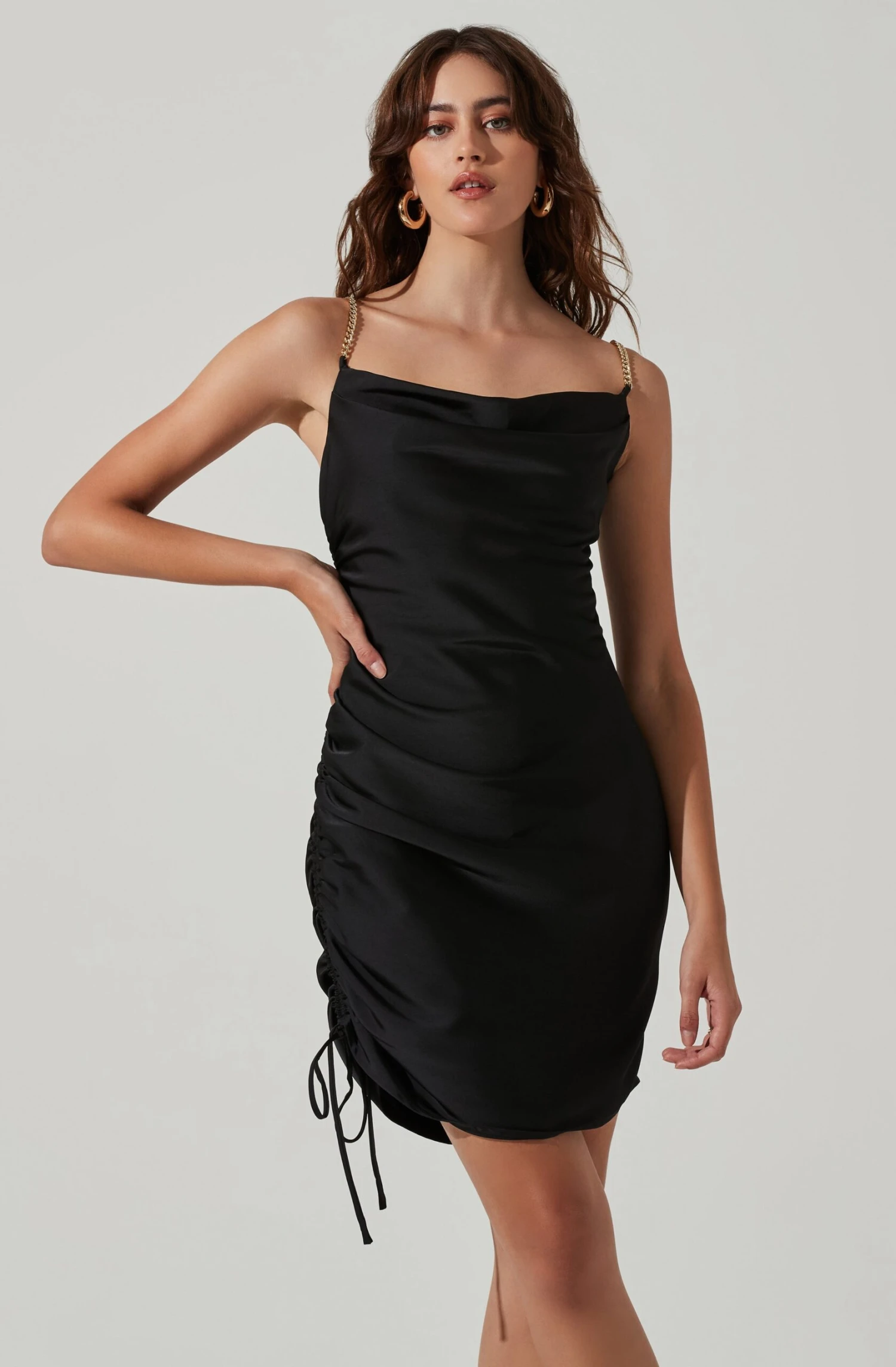 The Trista Dress features a satin finish. Cowl neckline is supported by rhinestone straps. Ruched sides with drawstring accents.