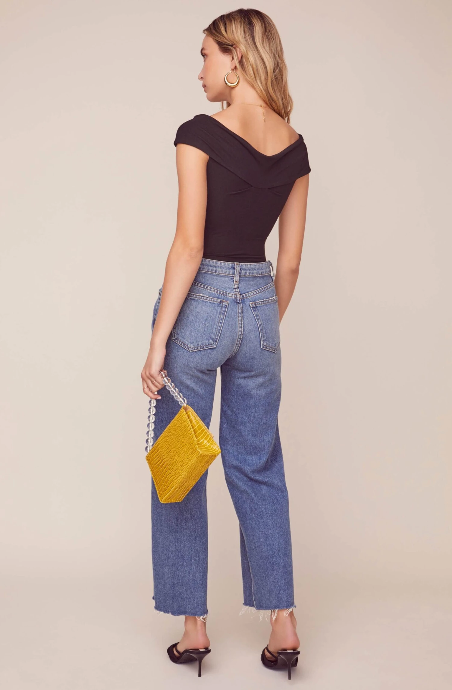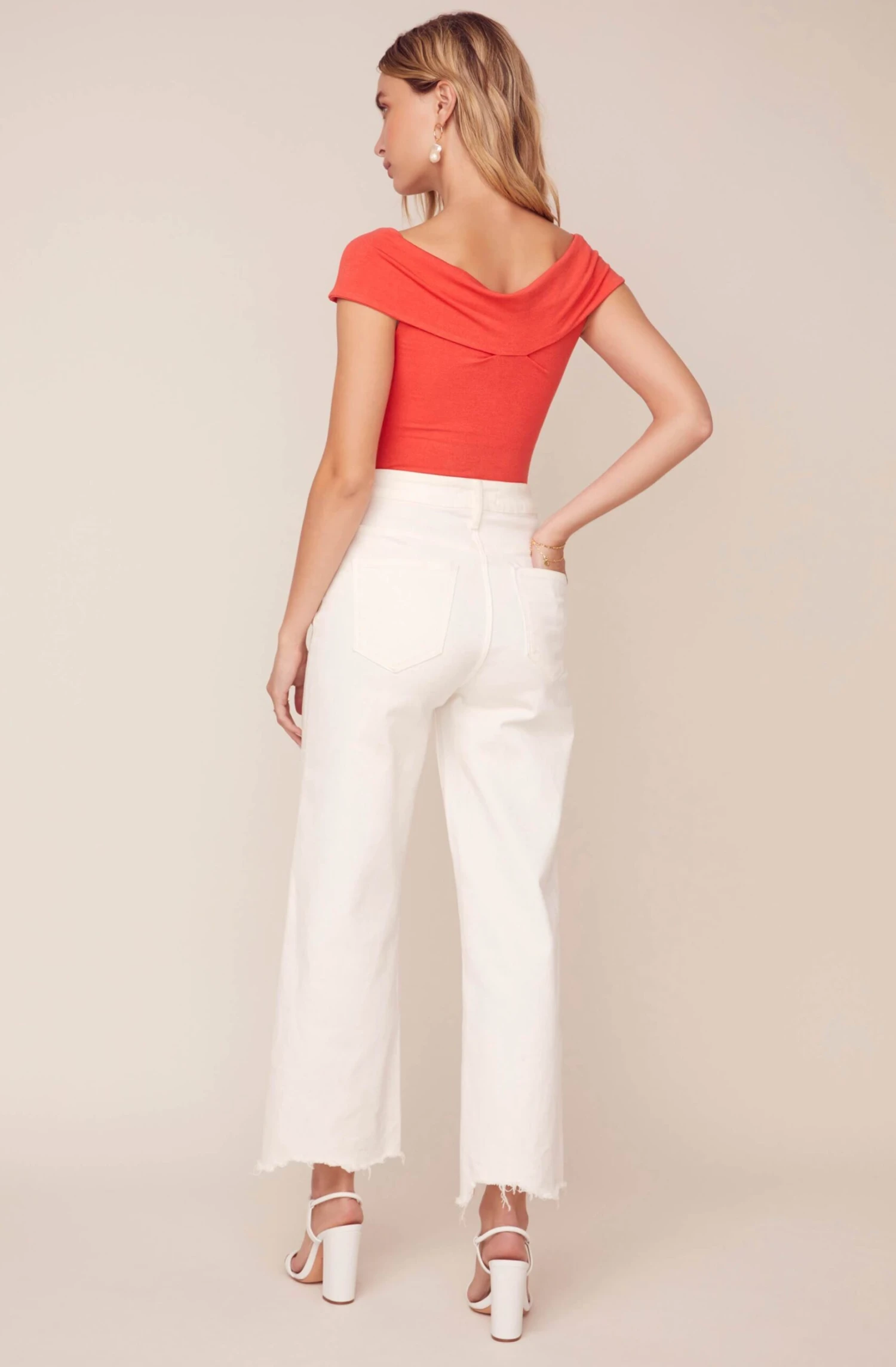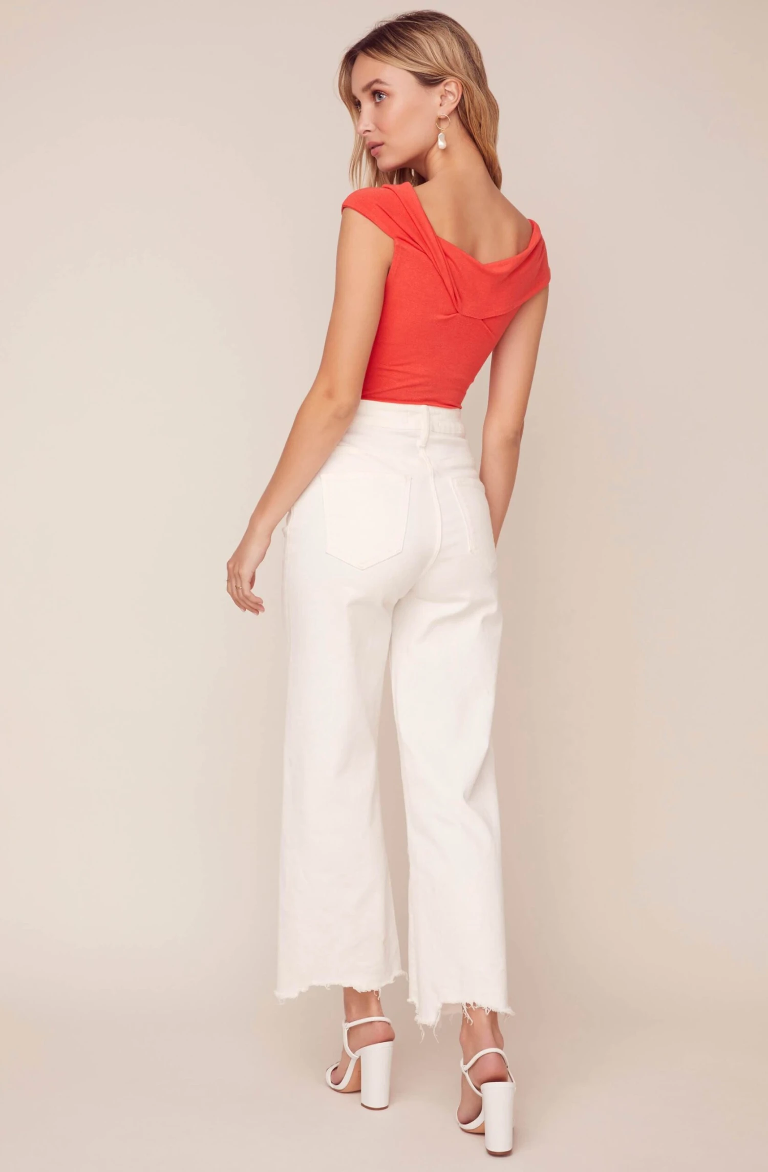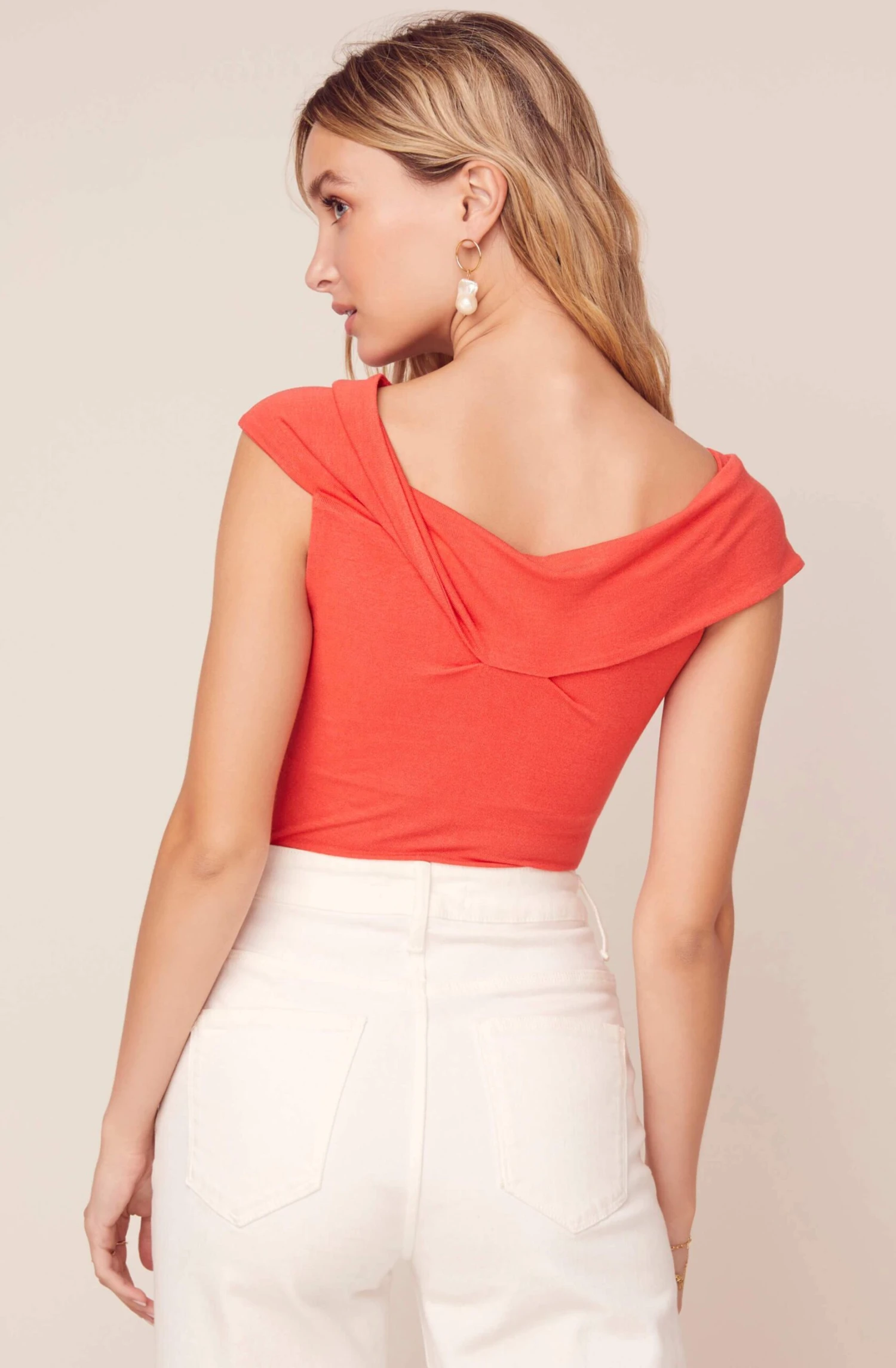 Don’t get it twisted. The Tristyn Bodysuit features a V neckline that descends to a twist front bodice. Short sleeves and scoop back.