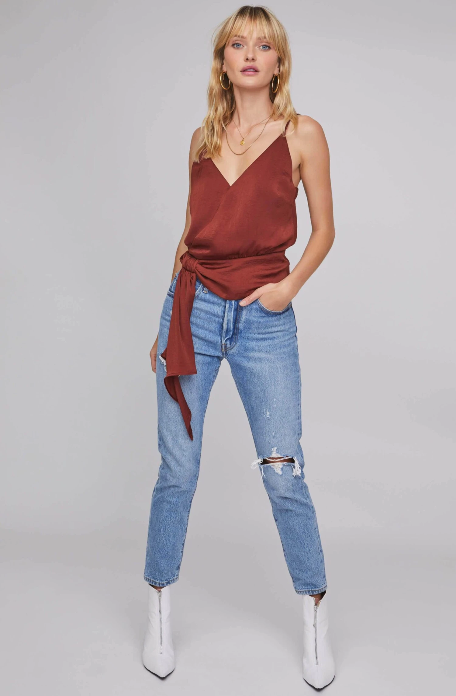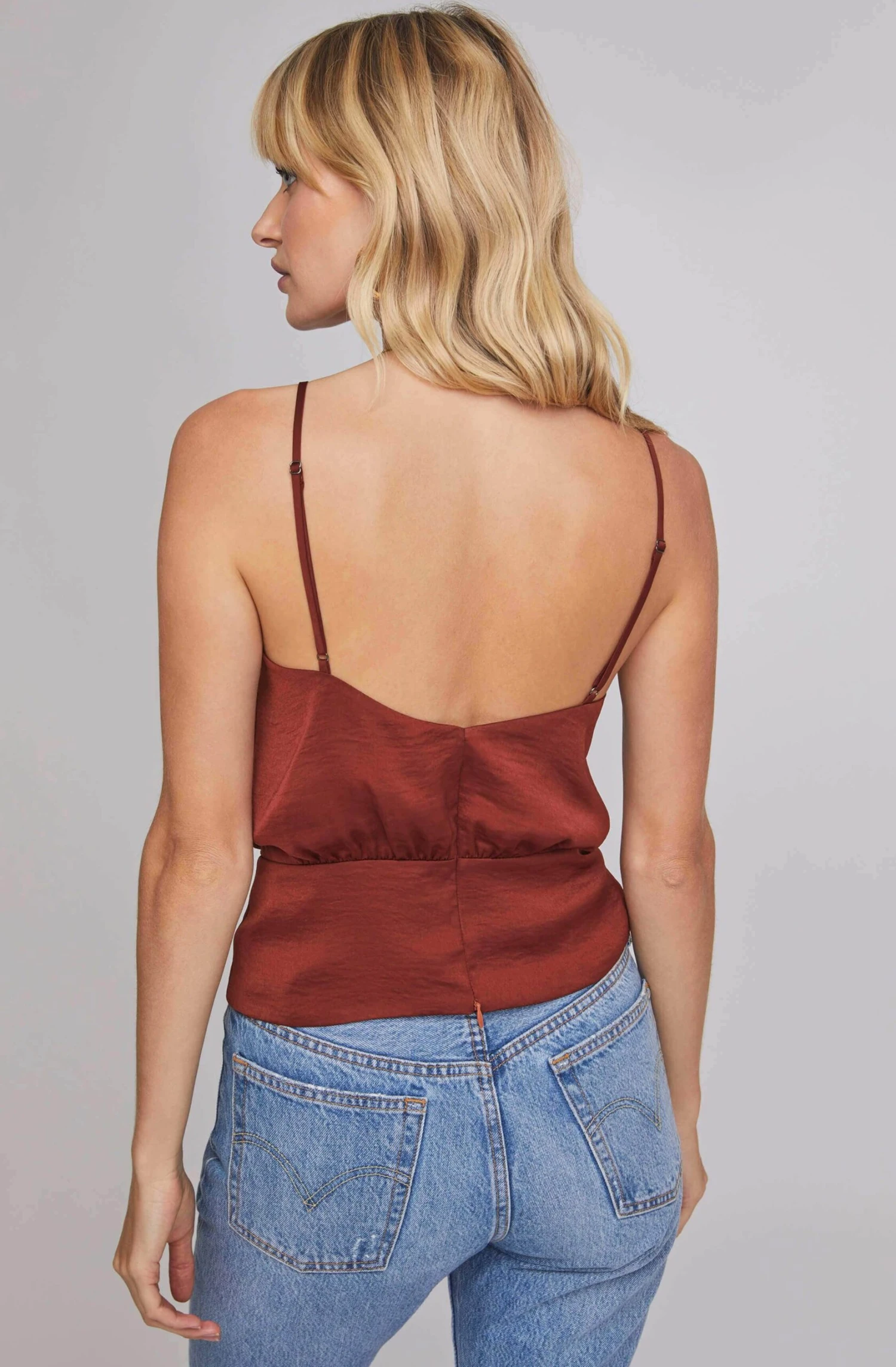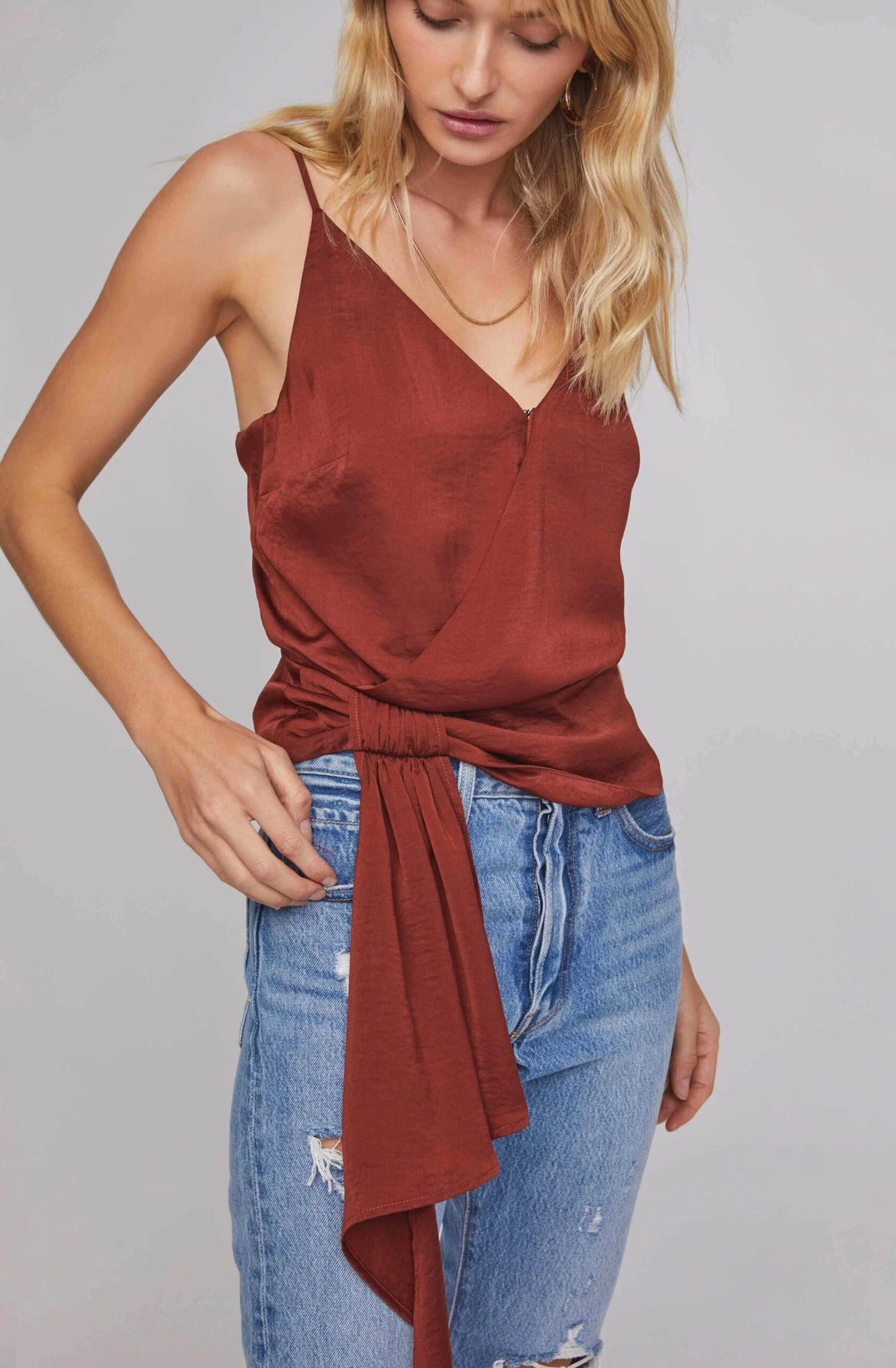 You’ve made the VIP list. This satin top features a deep V neckline that descends to a wrapped bodice and side tie accent. Adjustable straps.