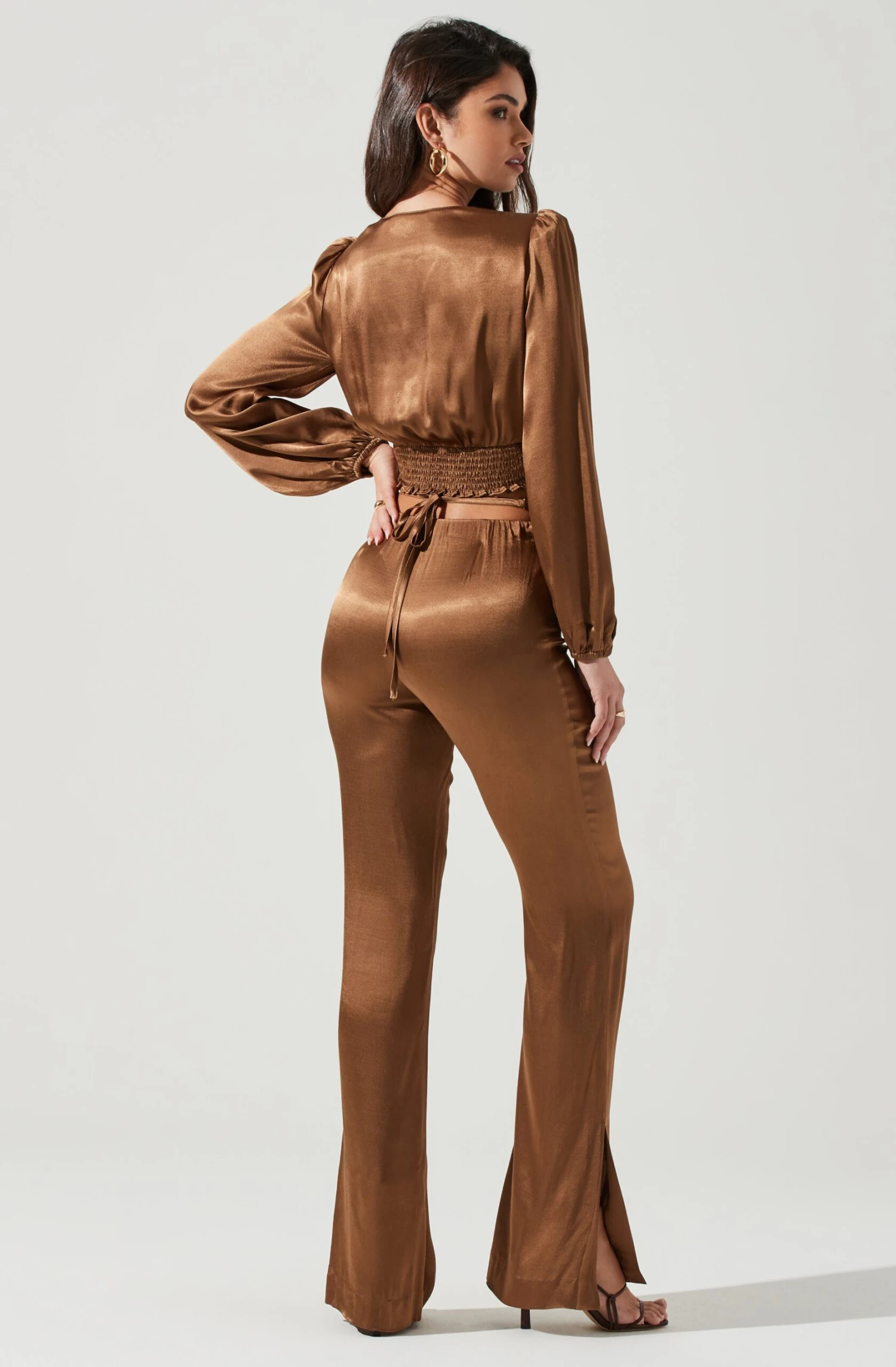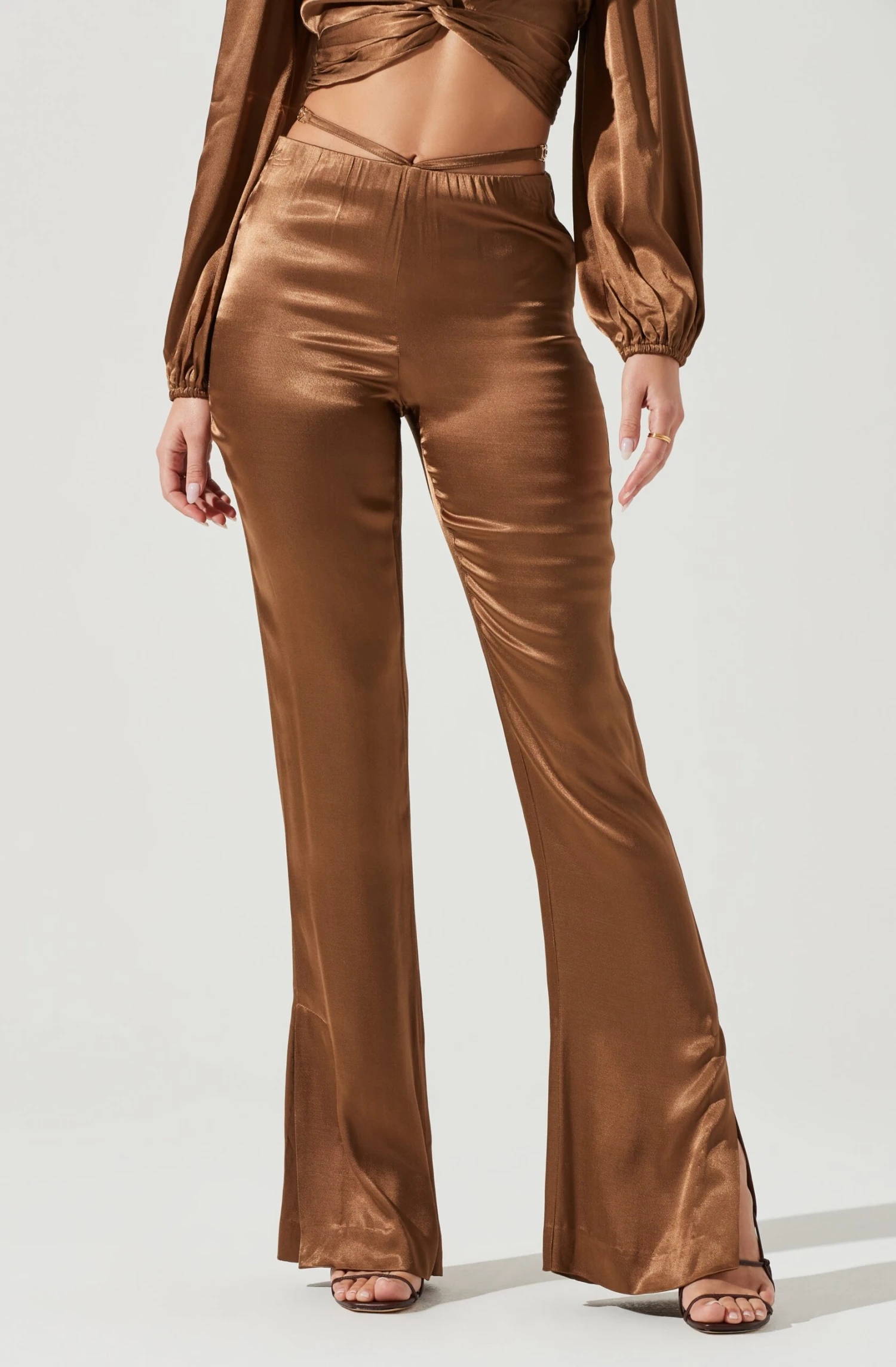 The Veira Pants features a satin finish. High rise waist features a chic tie waist detail. Flare leg bottoms with side slit accents.