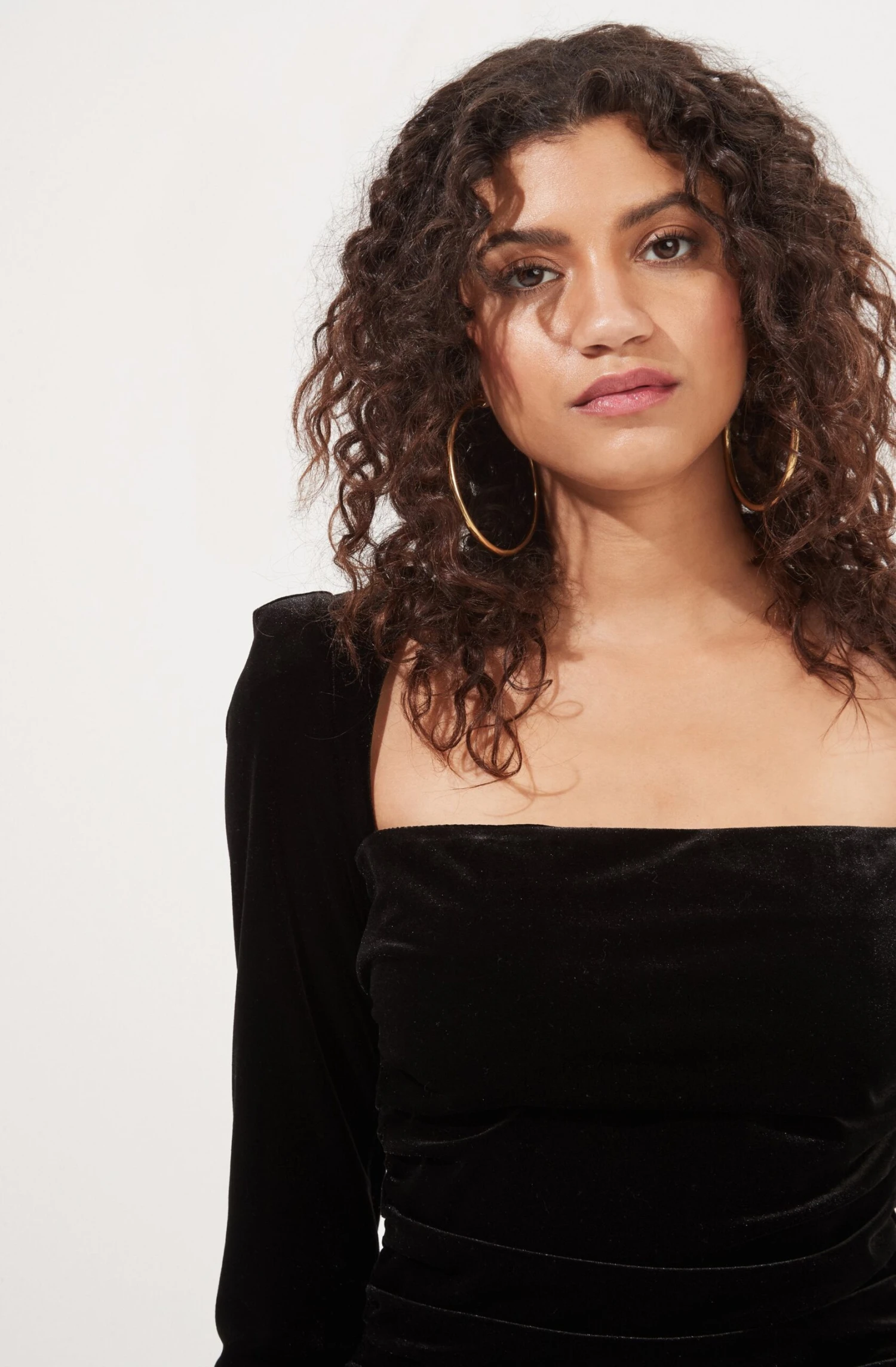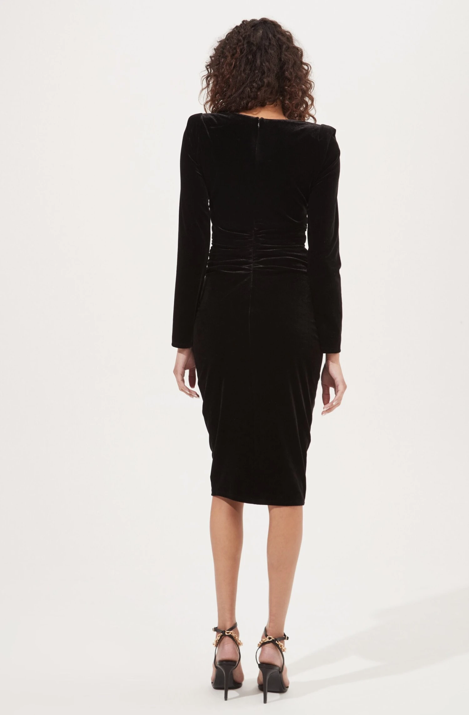 The Virginia Dress features a square neckline that leads to a ruched bodice and midi-length pencil skirt. Long sleeves. Padded shoulders. Concealed back zip closure.