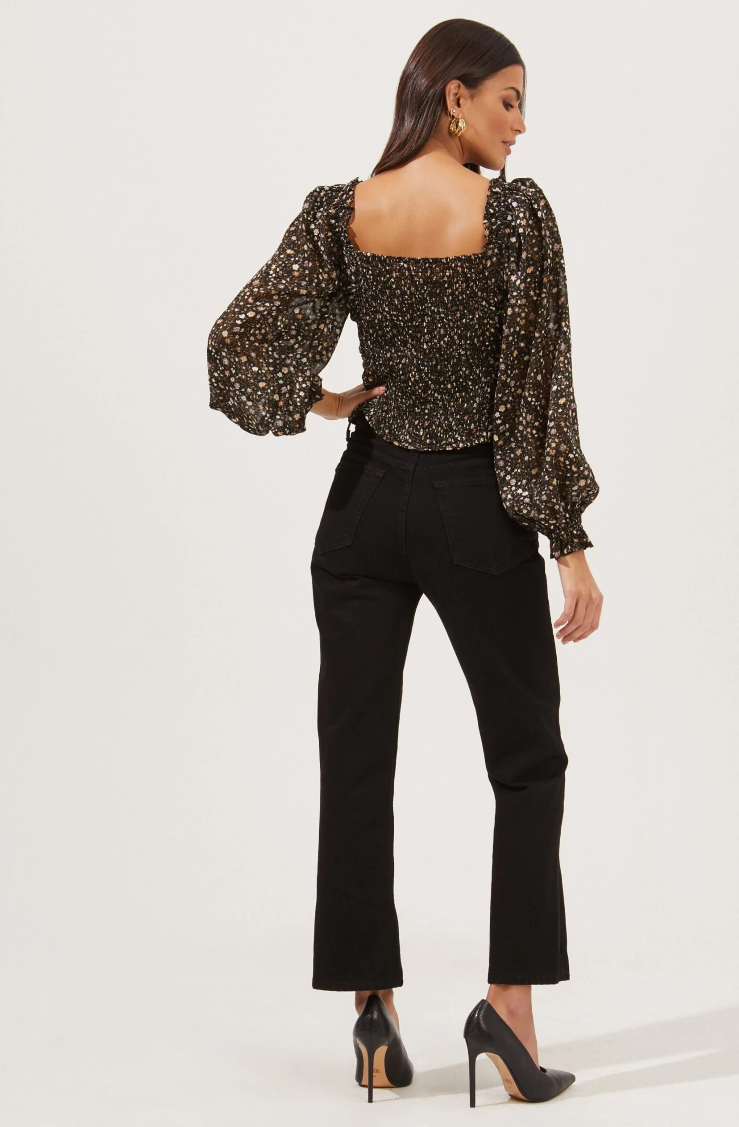 The Weston Top features a square neckline that leads to a gathered bust and ruched bodice. Long sheer puff sleeves with ruffle trim and elastic cuffs. Smocked back.